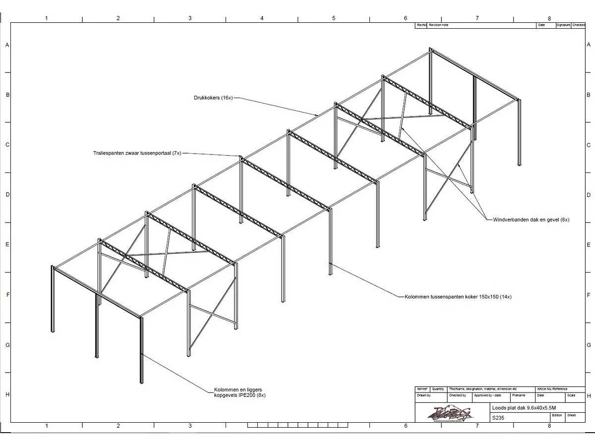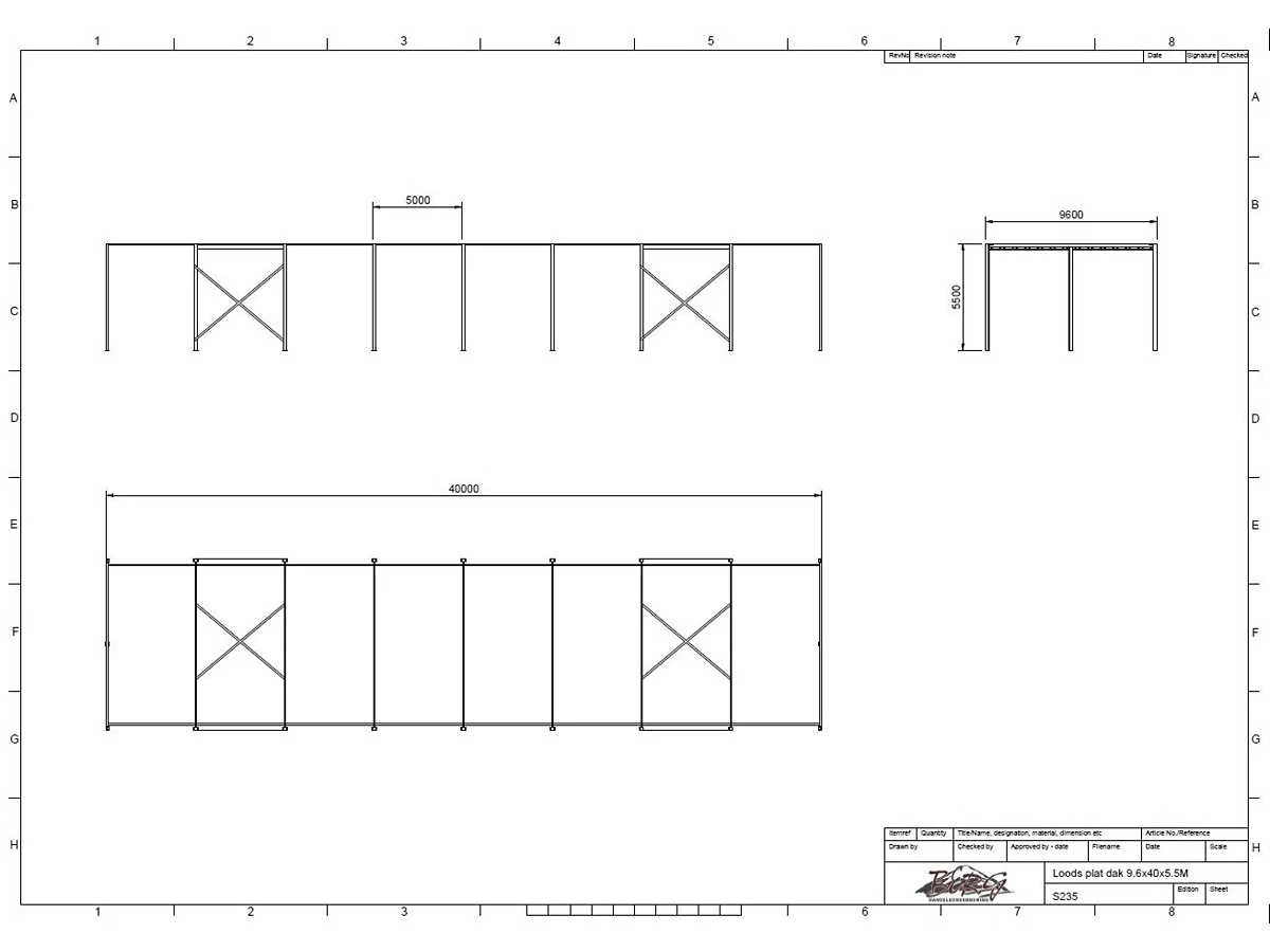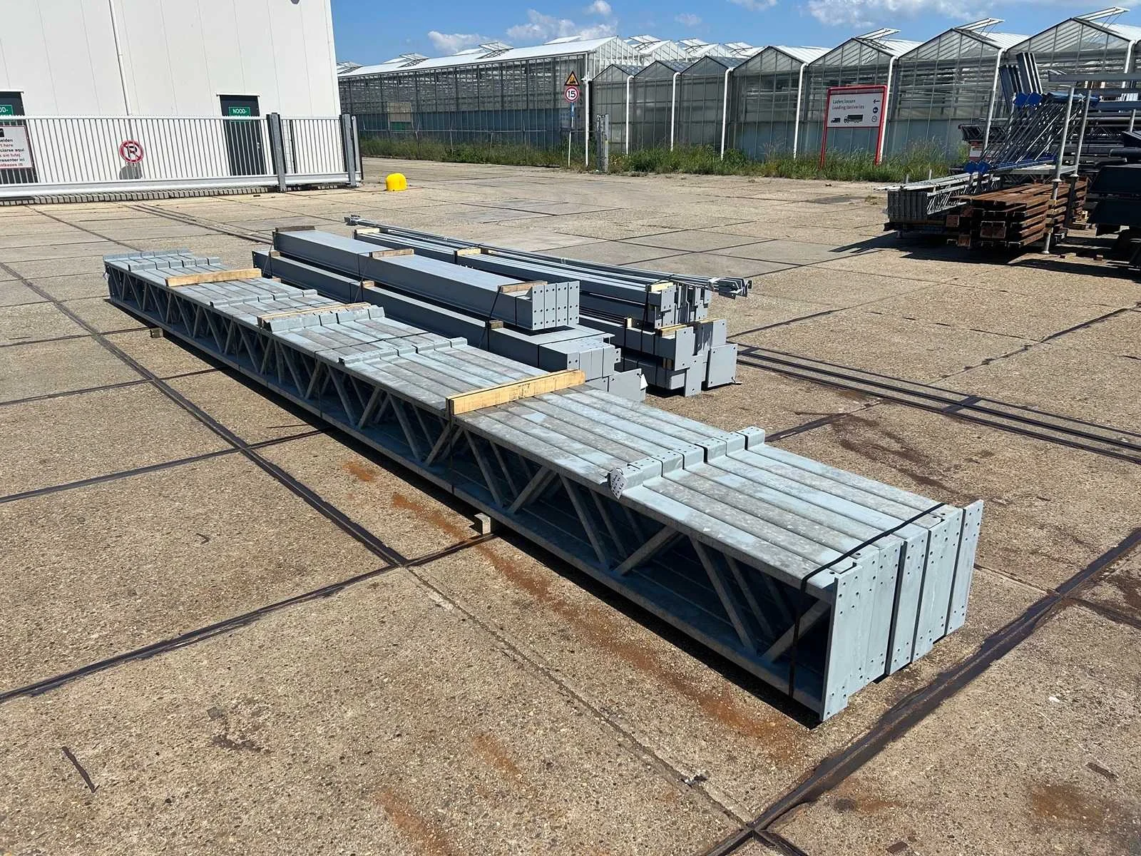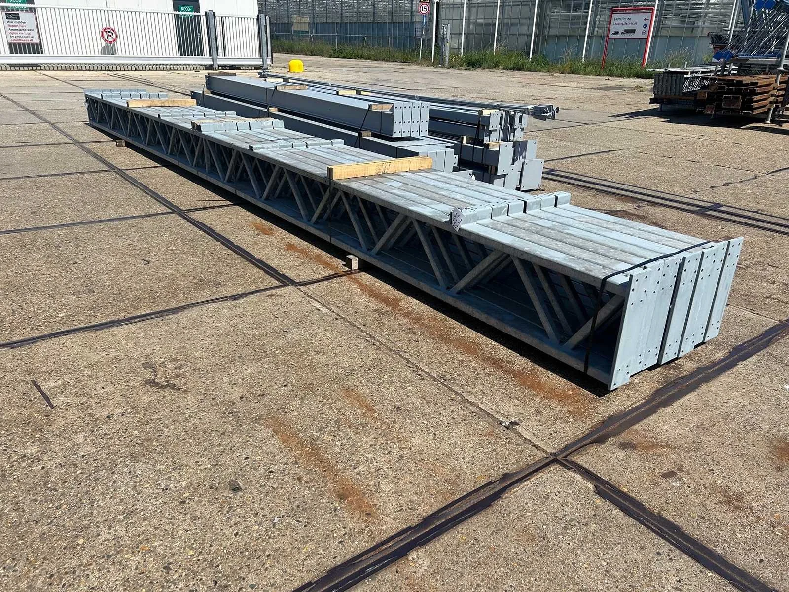 Platdak constructie; zware staalconstructie met geheel vrije overspanning; spanten h.o.h. 5000mm; bestaat uit 7 sets tussenspanten zware tralieligger met kokers 150 x 150mm als staanders; 2 sets kopgevelspanten in IPE200 met windstijlen; staaltekening; 3D-tekening; voorzien van drukkokers; windverbanden; kavel ligt netjes transportklaar en dient met 1 trailer opgehaald te worden; kavel wordt gratis met een heftruck geladen Materiaal: Gegalvaniseerd en geschilderd staal Type: Platdak Totaal oppervlakte: 384m² Nok hoogte: 5500mm Goot hoogte: 5500mm Totale afmeting L: 40000mm Totale afmeting Breedte: 9600mm