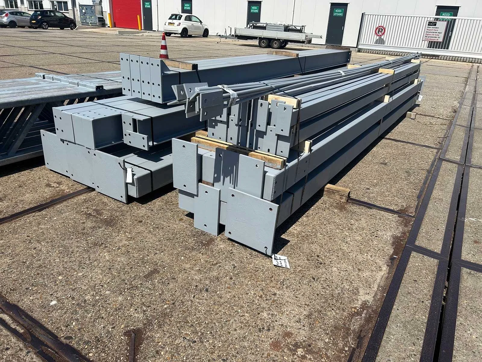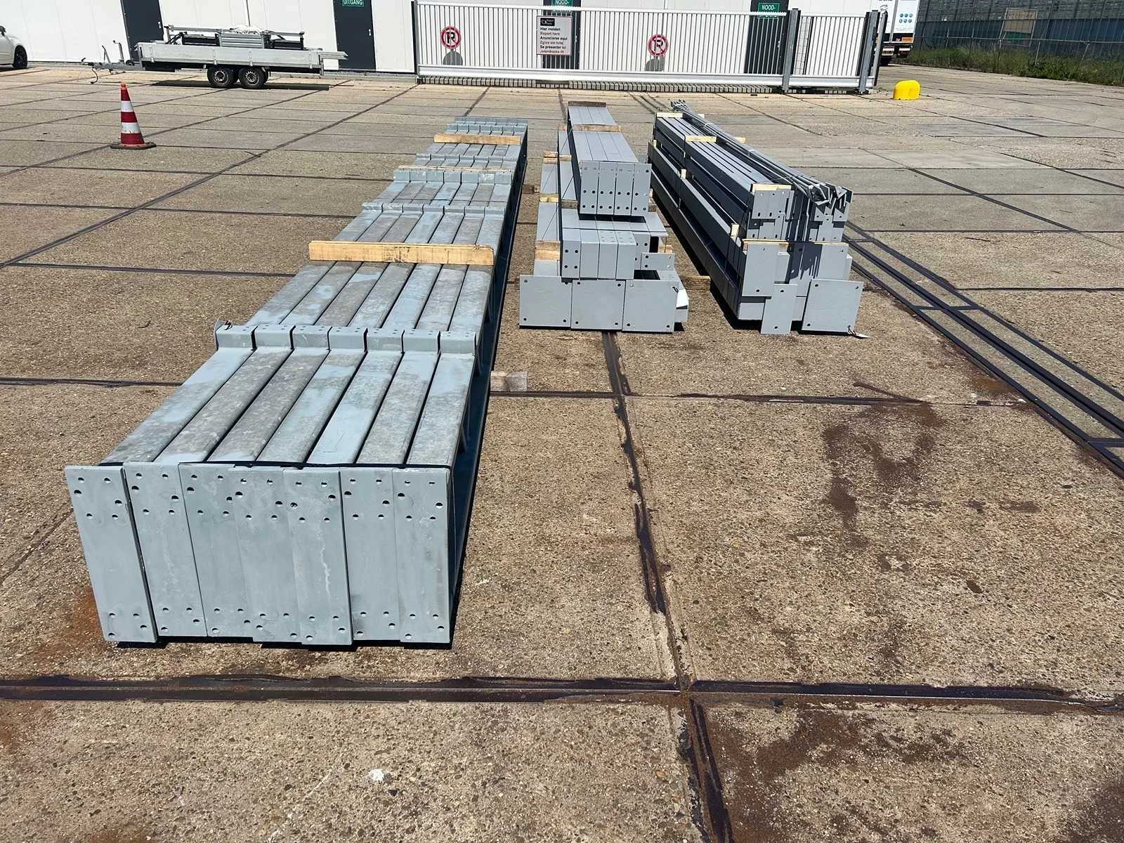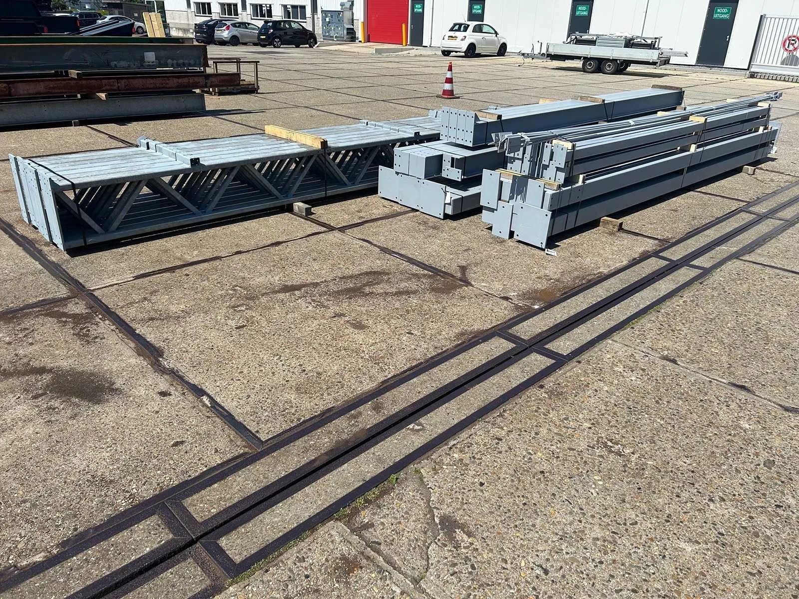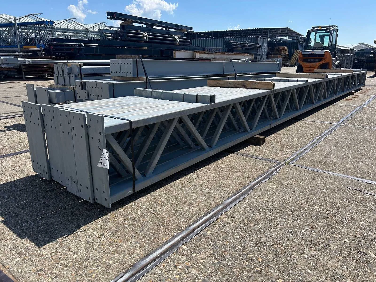 Platdak constructie; zware staalconstructie met geheel vrije overspanning; spanten h.o.h. 5000mm; bestaat uit 7 sets tussenspanten zware tralieligger met kokers 150 x 150mm als staanders; 2 sets kopgevelspanten in IPE200 met windstijlen; staaltekening; 3D-tekening; voorzien van drukkokers; windverbanden; kavel ligt netjes transportklaar en dient met 1 trailer opgehaald te worden; kavel wordt gratis met een heftruck geladen Materiaal: Gegalvaniseerd en geschilderd staal Type: Platdak Totaal oppervlakte: 384m² Nok hoogte: 5500mm Goot hoogte: 5500mm Totale afmeting L: 40000mm Totale afmeting Breedte: 9600mm