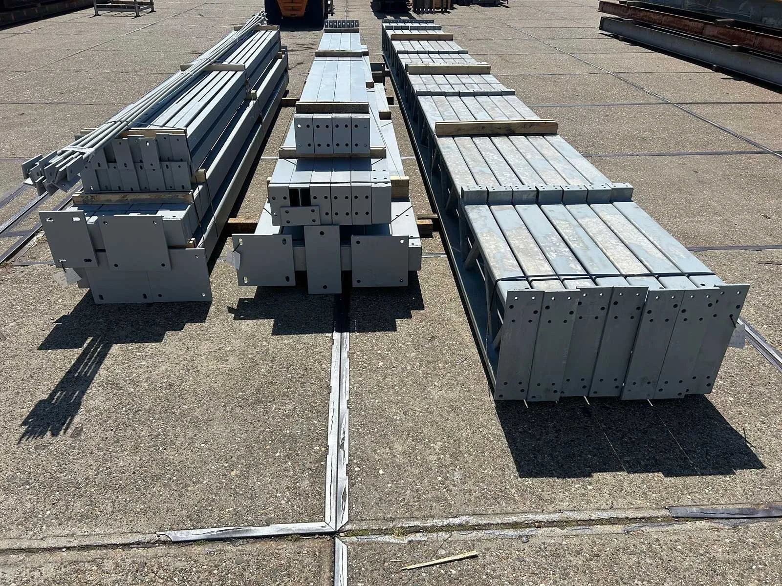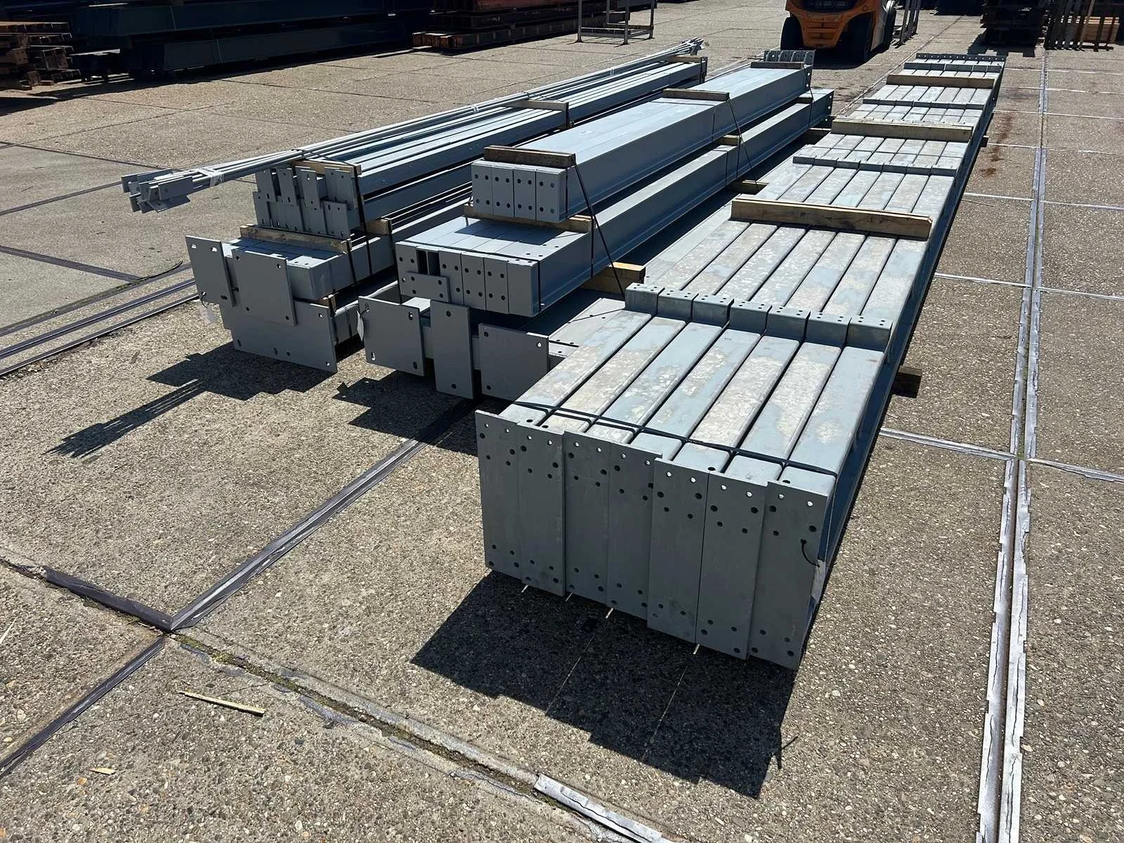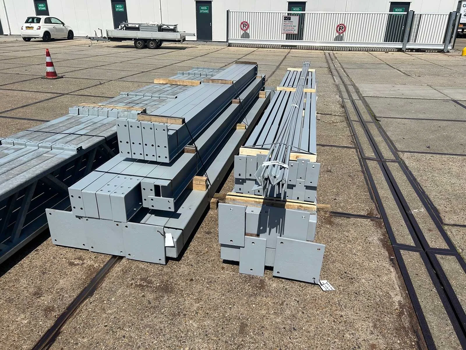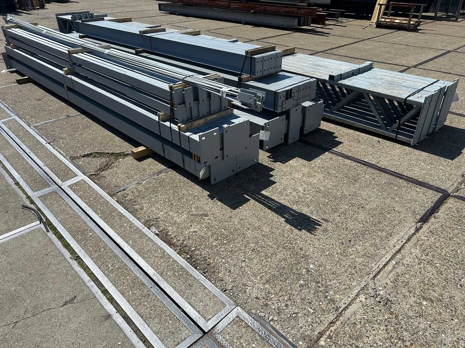 Platdak constructie; zware staalconstructie met geheel vrije overspanning; spanten h.o.h. 5000mm; bestaat uit 7 sets tussenspanten zware tralieligger met kokers 150 x 150mm als staanders; 2 sets kopgevelspanten in IPE200 met windstijlen; staaltekening; 3D-tekening; voorzien van drukkokers; windverbanden; kavel ligt netjes transportklaar en dient met 1 trailer opgehaald te worden; kavel wordt gratis met een heftruck geladen Materiaal: Gegalvaniseerd en geschilderd staal Type: Platdak Totaal oppervlakte: 384m² Nok hoogte: 5500mm Goot hoogte: 5500mm Totale afmeting L: 40000mm Totale afmeting Breedte: 9600mm