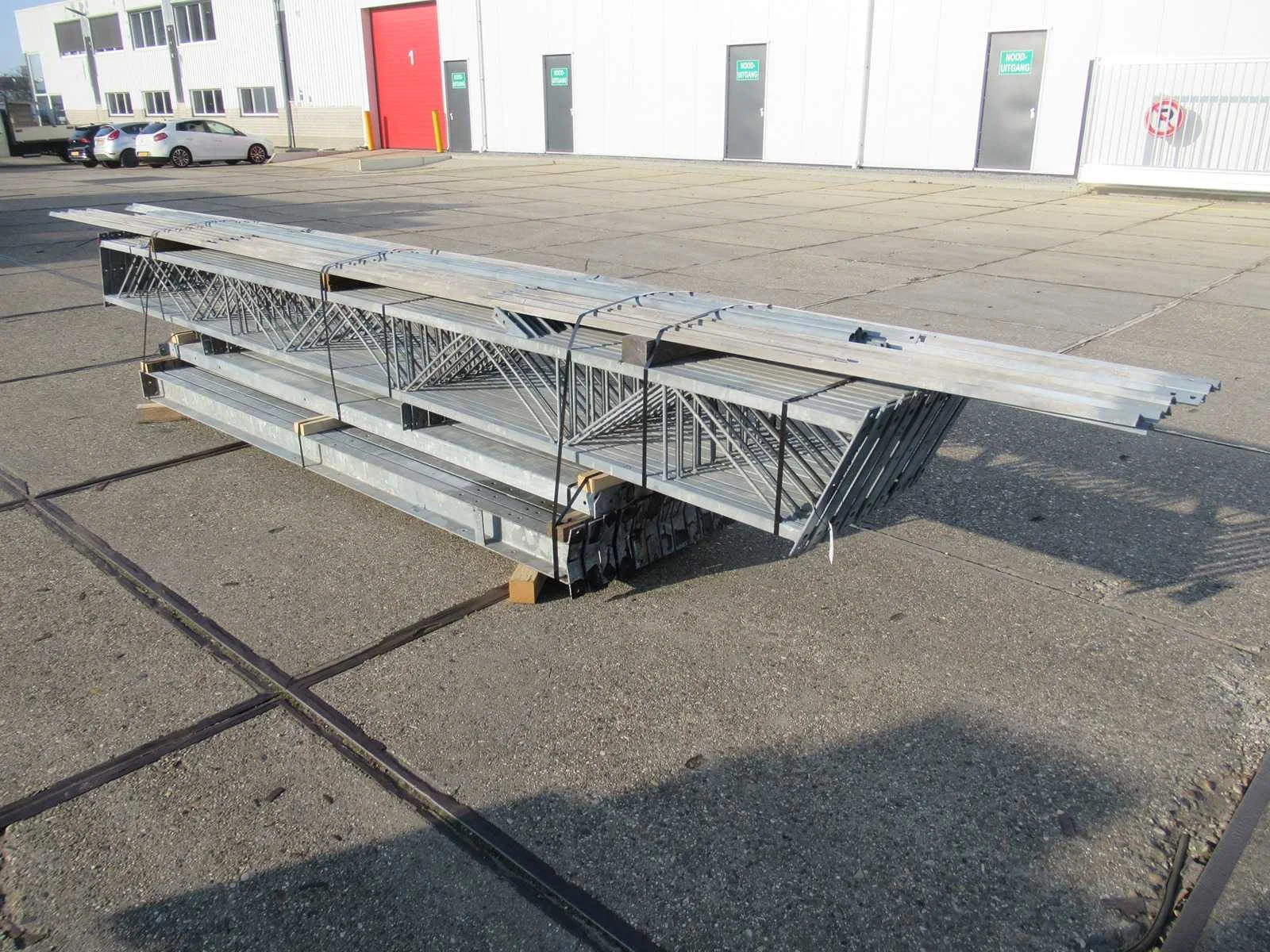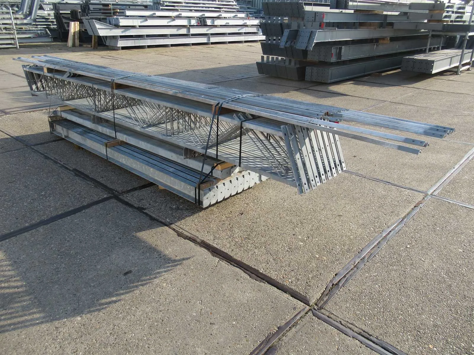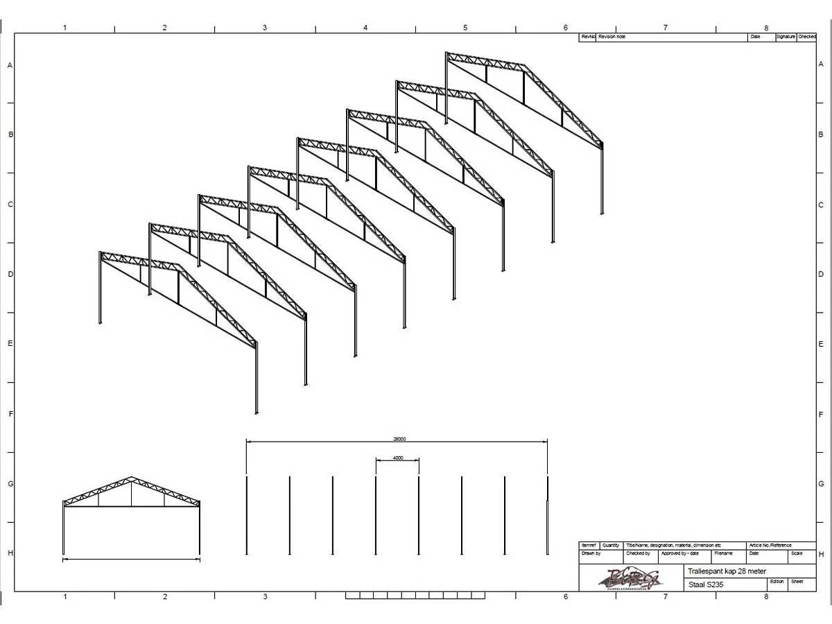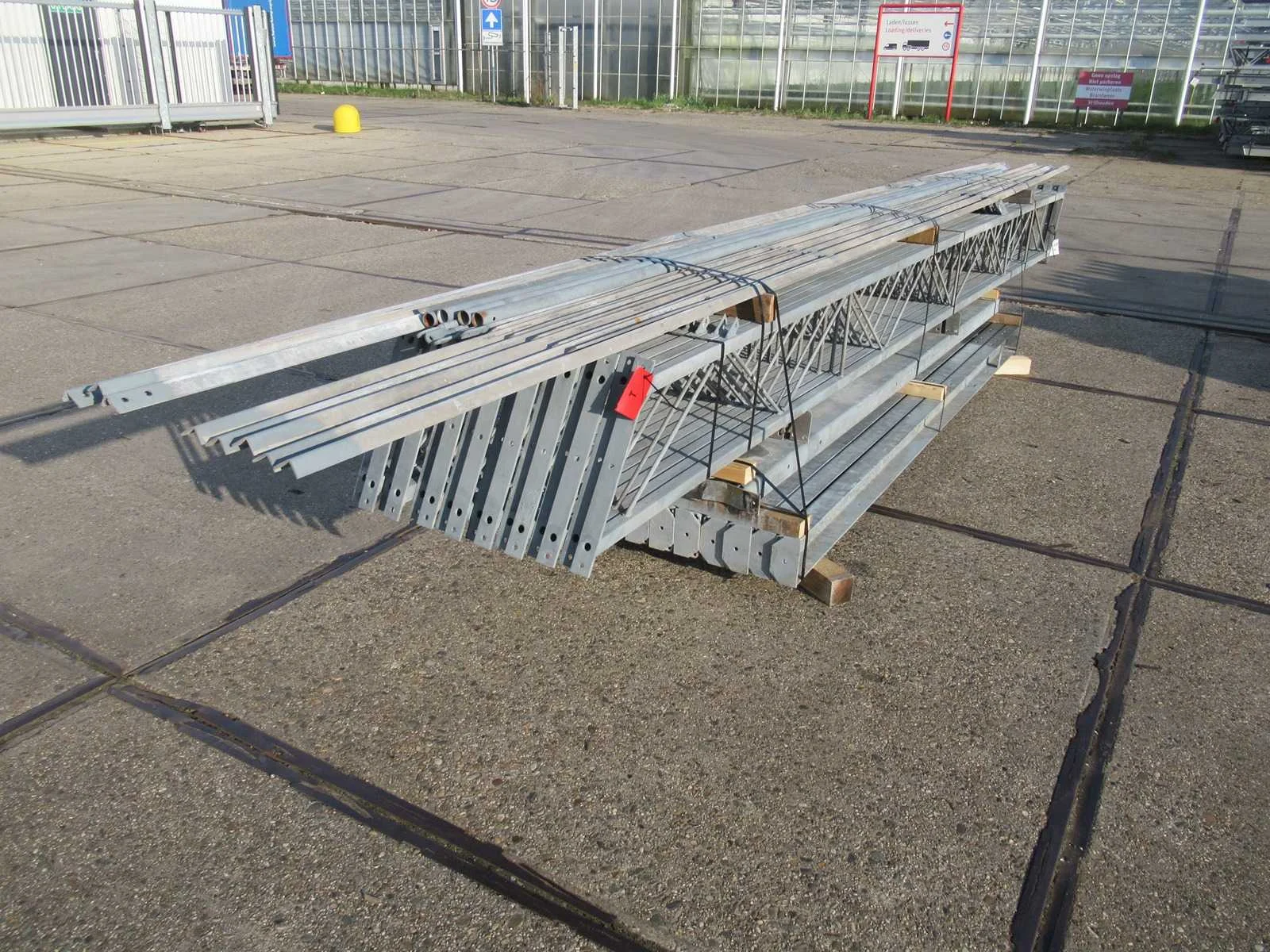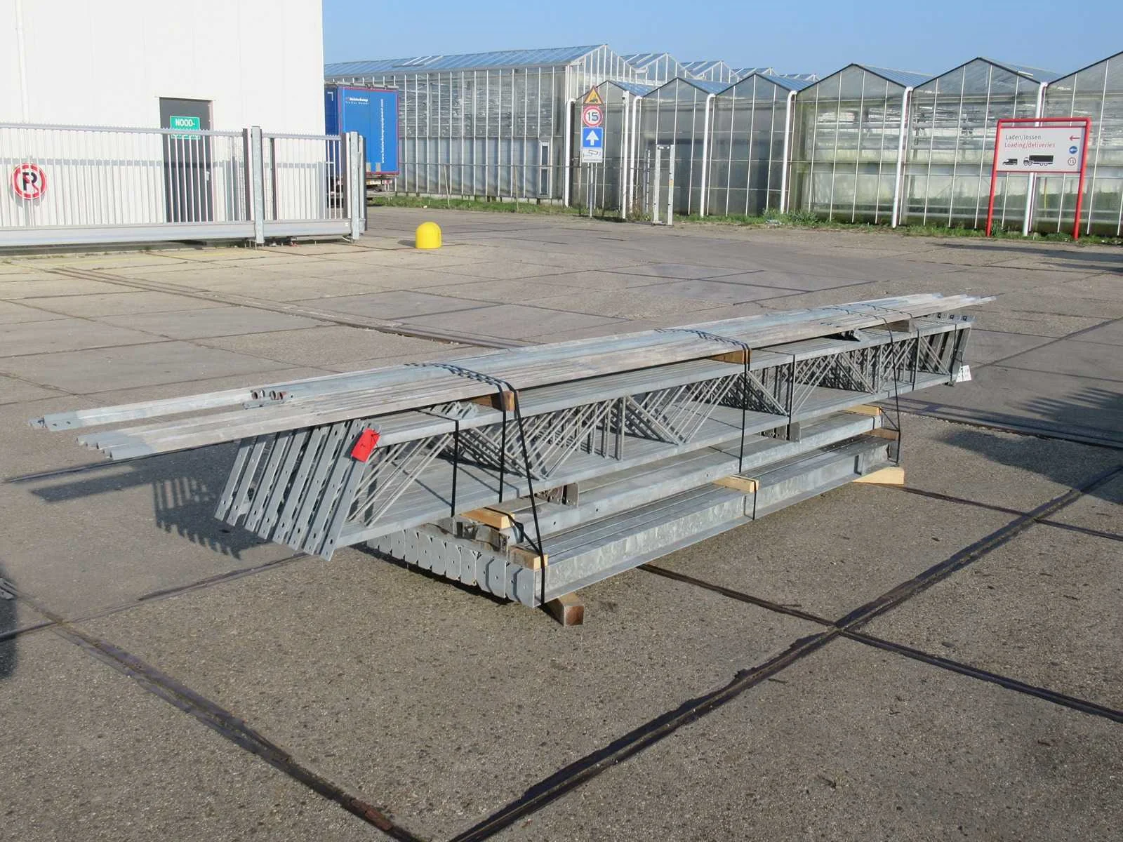 Overspanning trekstang tussen de spanten; spanten h.o.h. 4000mm; IPE profielen als staanders en traliespanten; staaltekening; 3D-tekening; dakhelling 25 graden; 8 sets tussenspanten; voorzien van trekstangen met ophangstrips; windverbanden; kavel ligt netjes transportklaar en dient met 1 trailer opgehaald te worden; kavel wordt gratis met een heftruck geladen Materiaal: Gegalvaniseerd staal Totaal oppervlakte: 238m² Nok hoogte: 5100mm Goot hoogte: 3100mm Totale afmeting L: 28000mm Totale afmeting Breedte: 8500mm