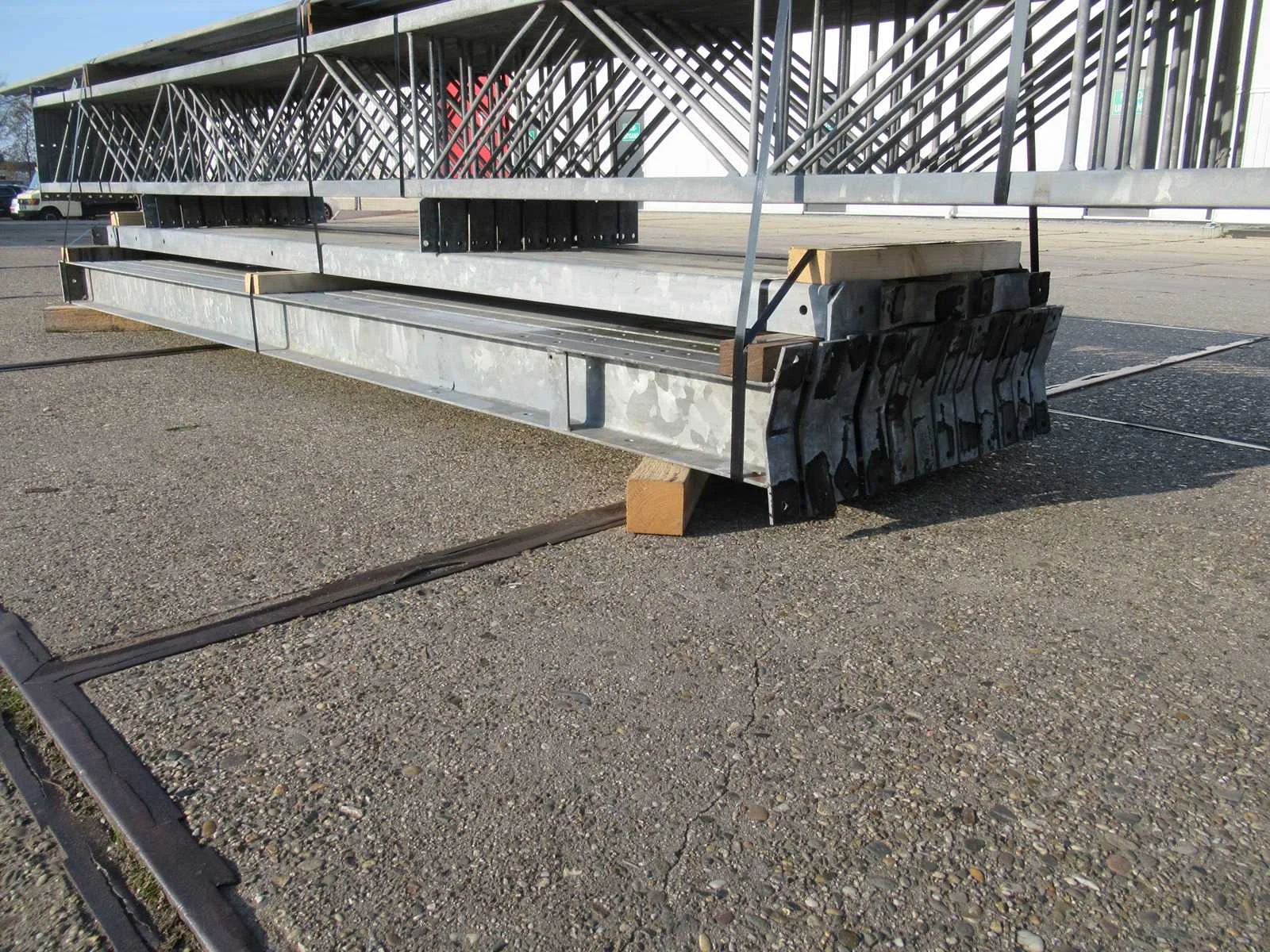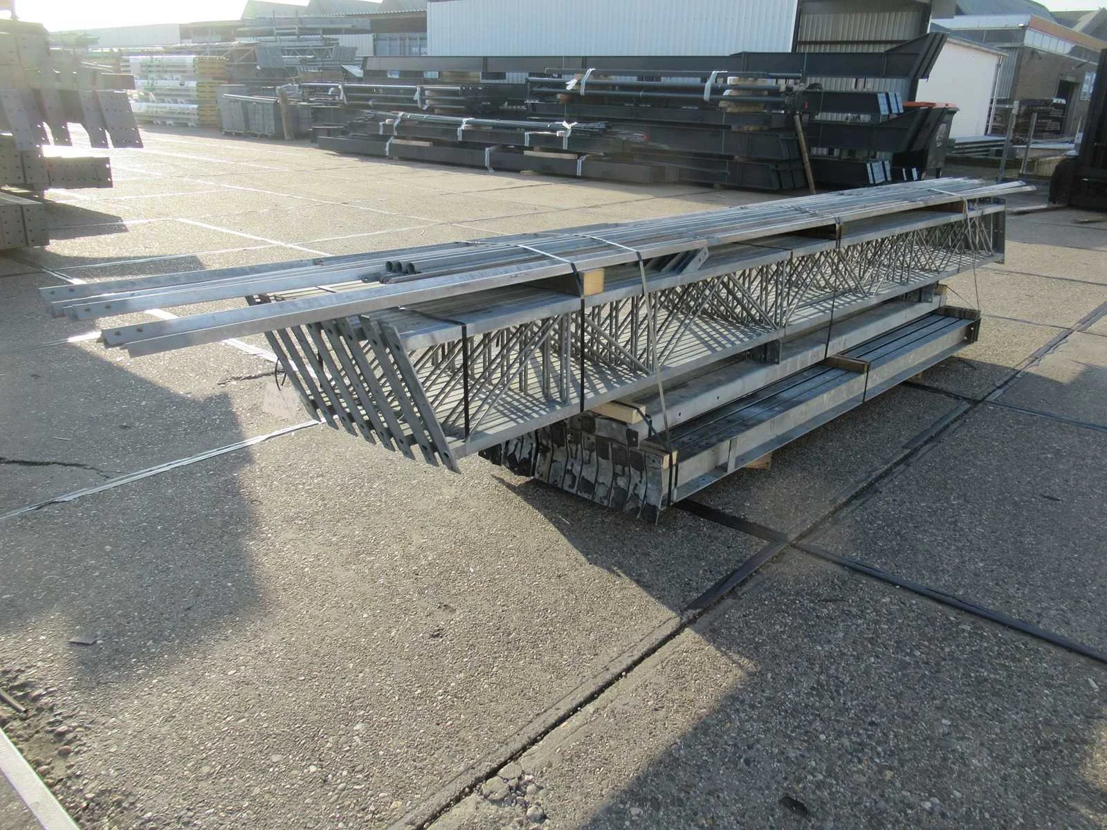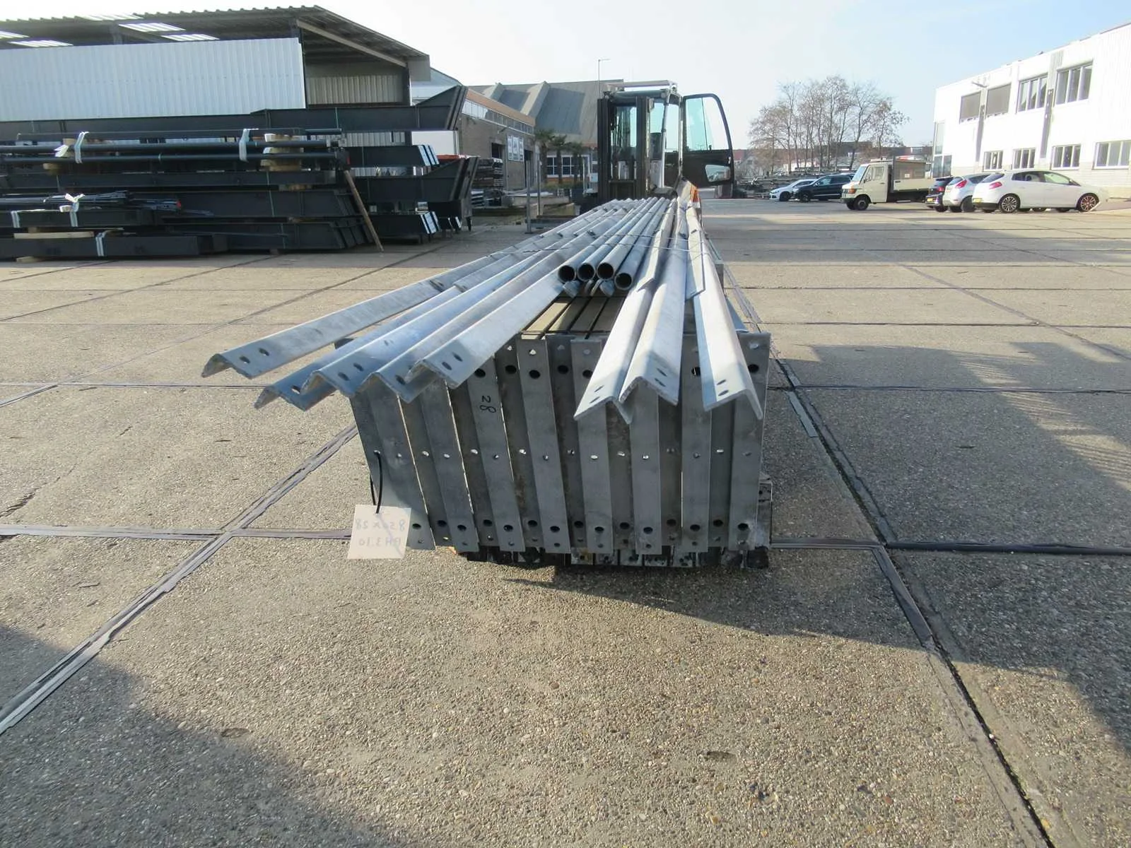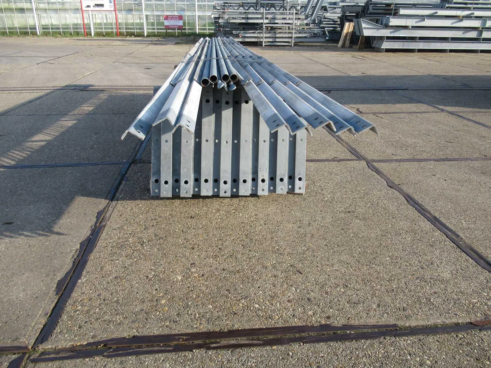 Overspanning trekstang tussen de spanten; spanten h.o.h. 4000mm; IPE profielen als staanders en traliespanten; staaltekening; 3D-tekening; dakhelling 25 graden; 8 sets tussenspanten; voorzien van trekstangen met ophangstrips; windverbanden; kavel ligt netjes transportklaar en dient met 1 trailer opgehaald te worden; kavel wordt gratis met een heftruck geladen Materiaal: Gegalvaniseerd staal Totaal oppervlakte: 238m² Nok hoogte: 5100mm Goot hoogte: 3100mm Totale afmeting L: 28000mm Totale afmeting Breedte: 8500mm