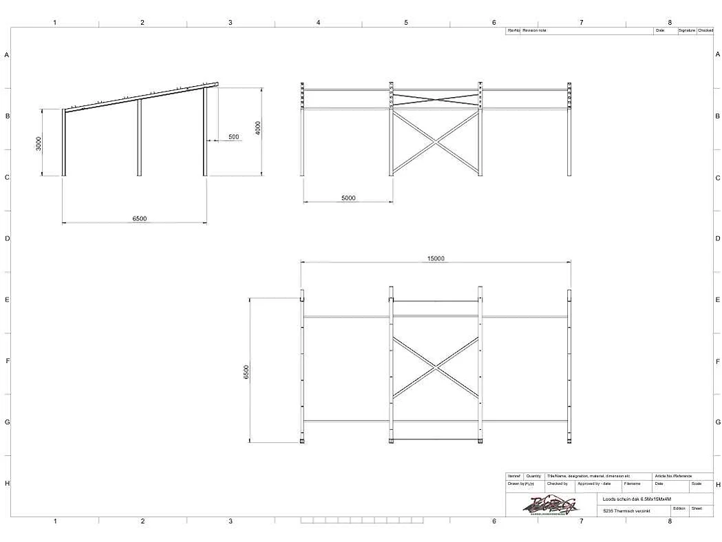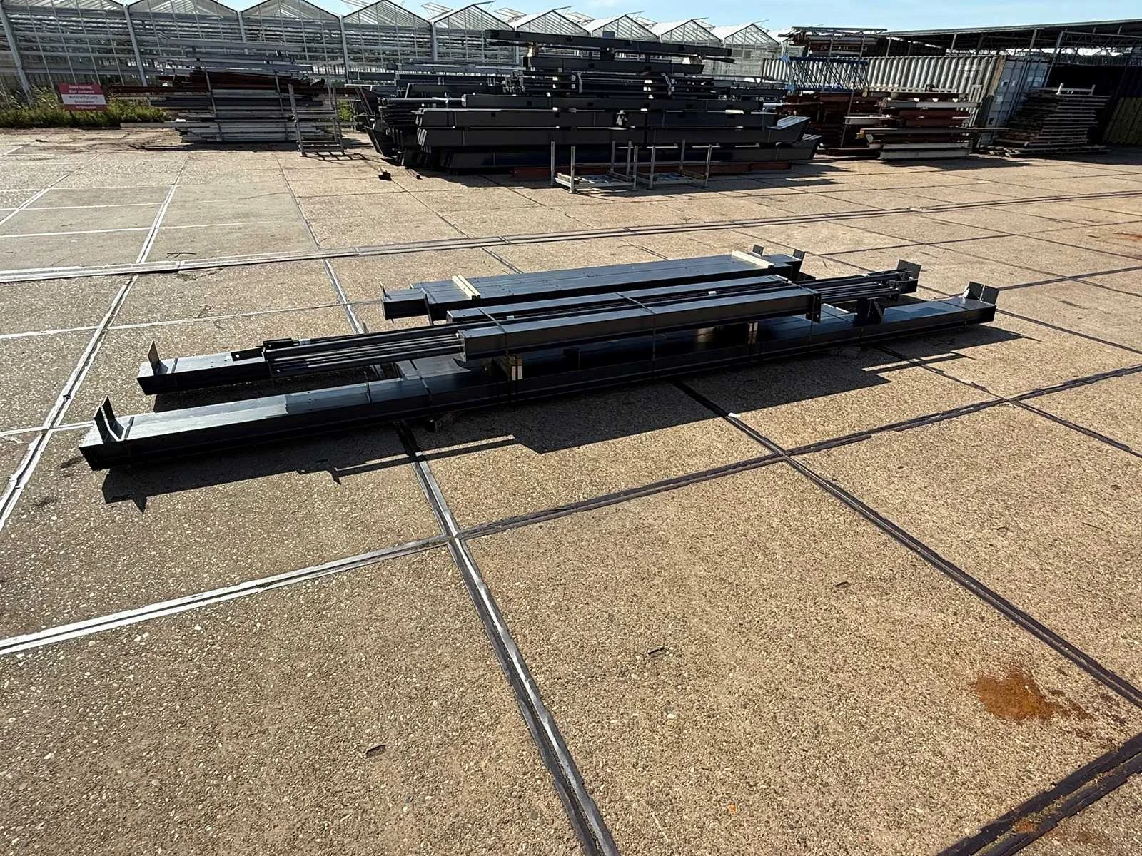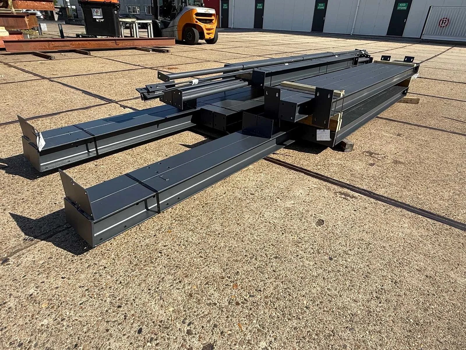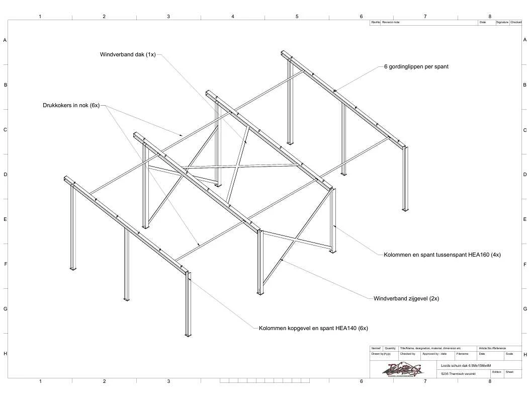 Zware staalconstructie met lessenaarsdak; vrije overspanning; spanten h.o.h. 5.00 meter; hoogte voorkant 4.00 meter; hoogte achterkant 3.00 meter; breedte constructie buitenkant staanders is 6.50 meter met aan de voorkant een overstek van 0.50 meter waardoor totale breedte 7.00 meter is; 2 sets tussenspanten HEA 160; 2 sets eindspanten HEA 140; met staaltekening en 3D-tekening; voorzien van drukkokers; windverbanden; gordinglippen op de spanten; staalconstructie ligt netjes transportklaar en dient met 1 trailer geladen te worden; kavel wordt gratis geladen met een heftruck Materiaal: Geschilderd staal kleur antraciet Type: Lessenaarsdak Totaal oppervlakte: 105m² Nok hoogte: 4000mm Goot hoogte: 3000mm Totale afmeting L: 15000mm Totale afmeting Breedte: 7000mm