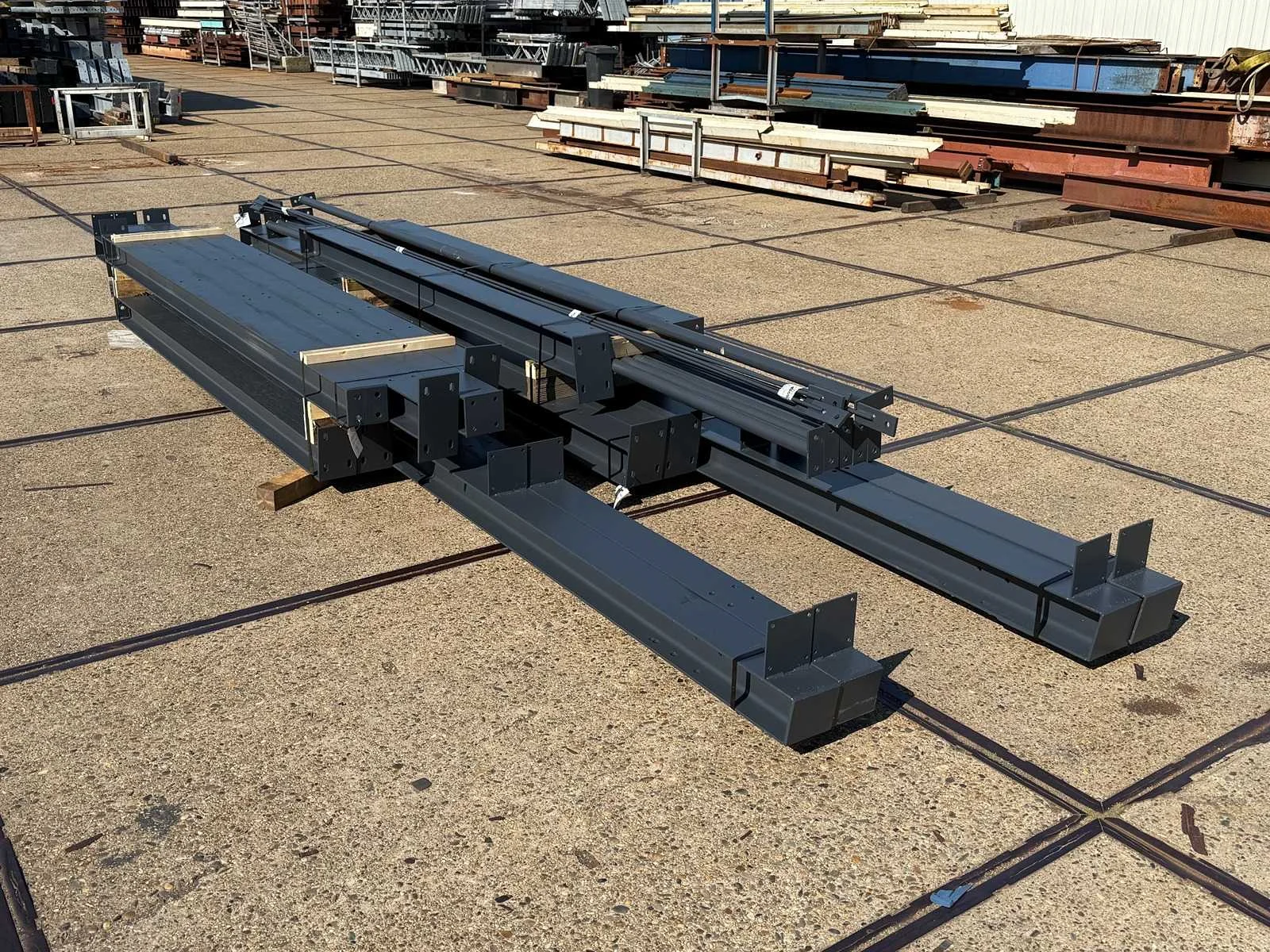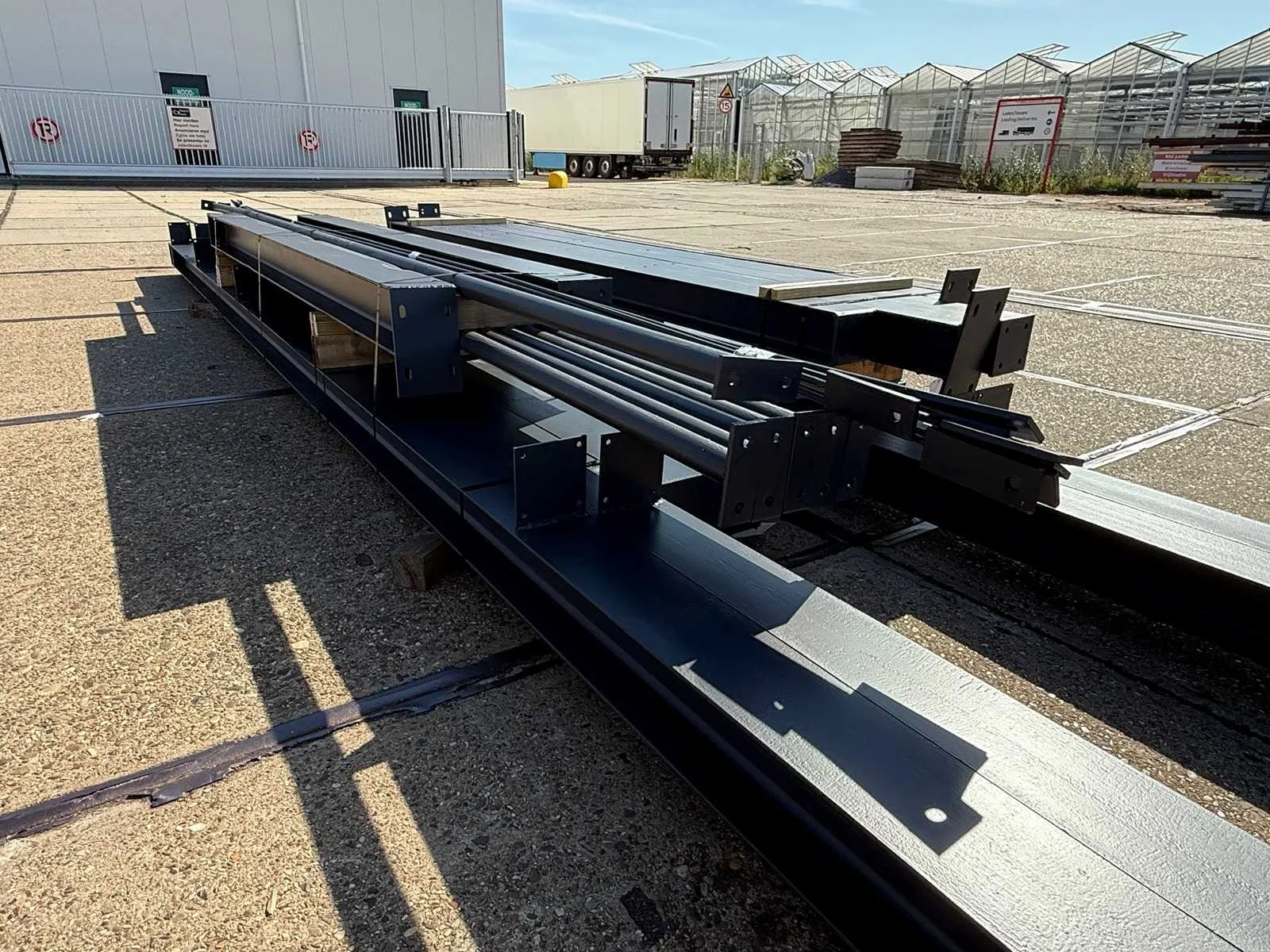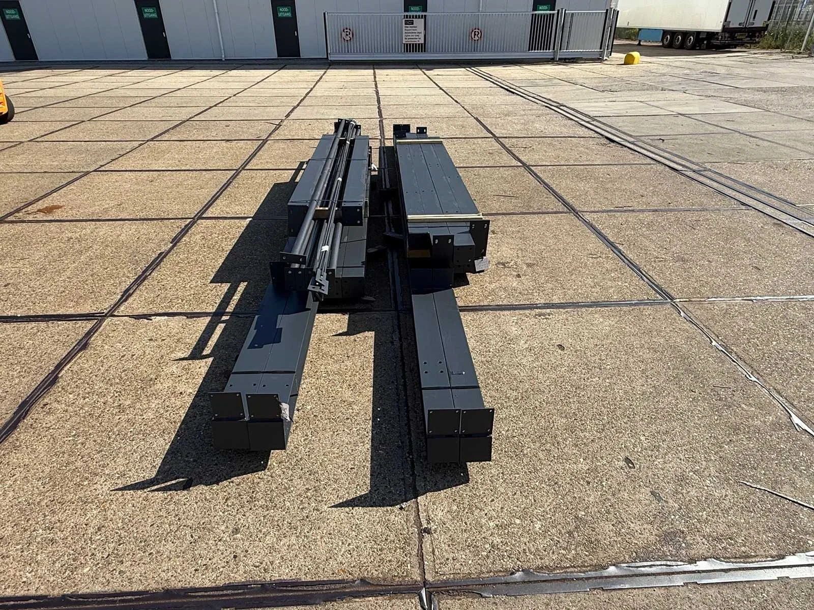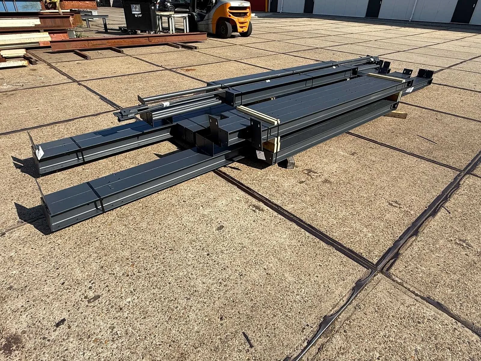 Zware staalconstructie met lessenaarsdak; vrije overspanning; spanten h.o.h. 5.00 meter; hoogte voorkant 4.00 meter; hoogte achterkant 3.00 meter; breedte constructie buitenkant staanders is 6.50 meter met aan de voorkant een overstek van 0.50 meter waardoor totale breedte 7.00 meter is; 2 sets tussenspanten HEA 160; 2 sets eindspanten HEA 140; met staaltekening en 3D-tekening; voorzien van drukkokers; windverbanden; gordinglippen op de spanten; staalconstructie ligt netjes transportklaar en dient met 1 trailer geladen te worden; kavel wordt gratis geladen met een heftruck Materiaal: Geschilderd staal kleur antraciet Type: Lessenaarsdak Totaal oppervlakte: 105m² Nok hoogte: 4000mm Goot hoogte: 3000mm Totale afmeting L: 15000mm Totale afmeting Breedte: 7000mm