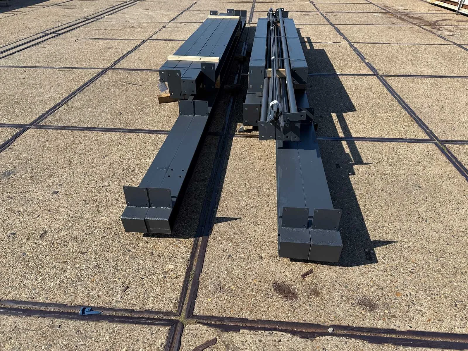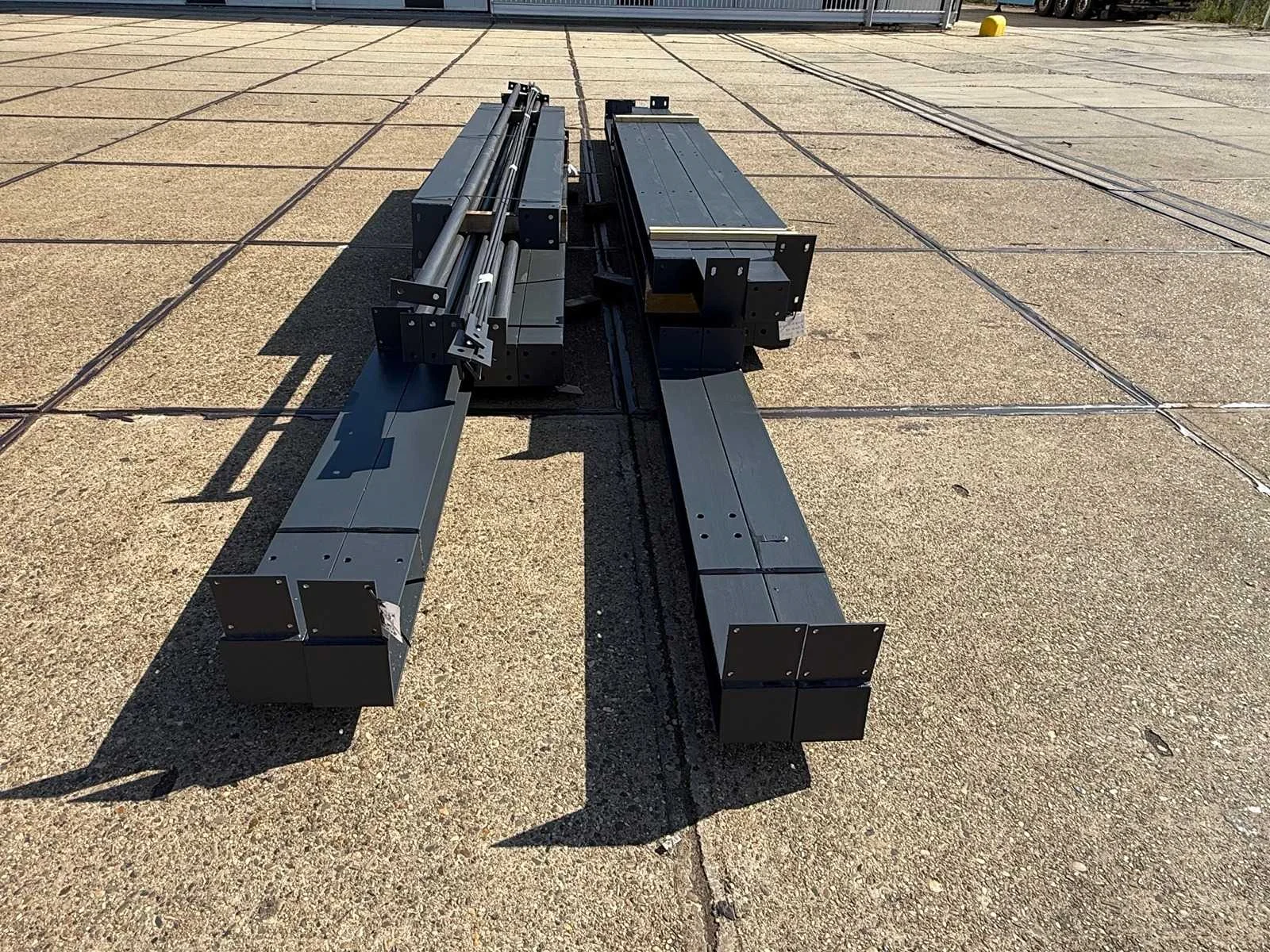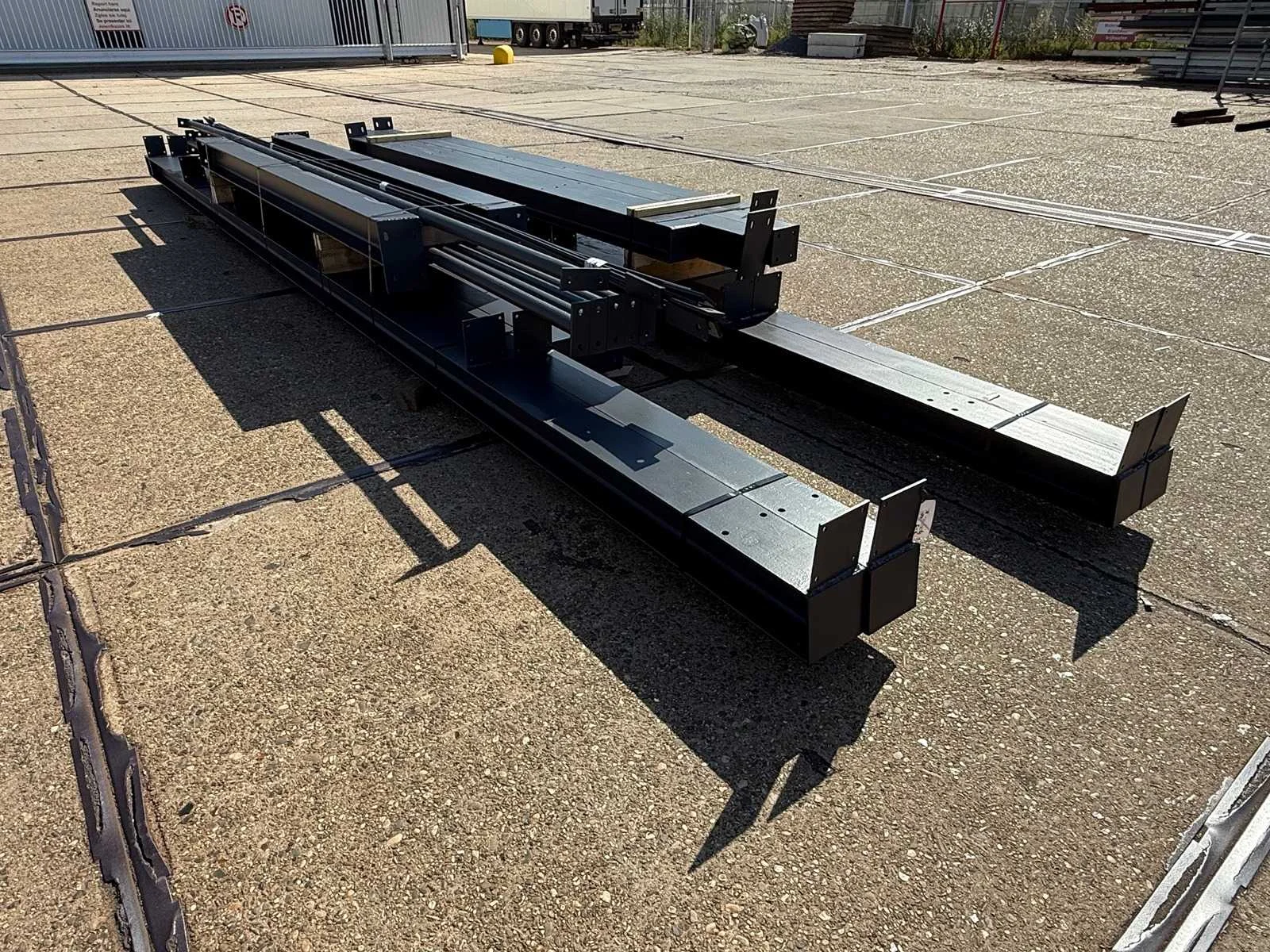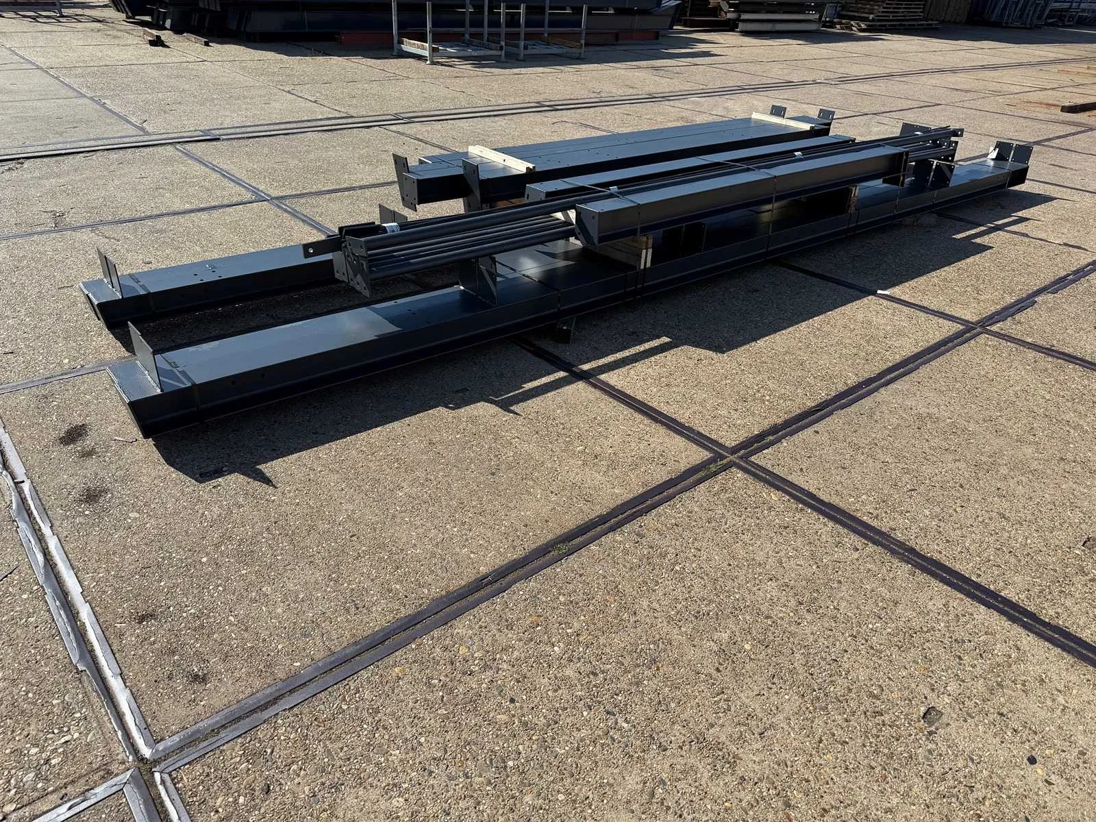 Zware staalconstructie met lessenaarsdak; vrije overspanning; spanten h.o.h. 5.00 meter; hoogte voorkant 4.00 meter; hoogte achterkant 3.00 meter; breedte constructie buitenkant staanders is 6.50 meter met aan de voorkant een overstek van 0.50 meter waardoor totale breedte 7.00 meter is; 2 sets tussenspanten HEA 160; 2 sets eindspanten HEA 140; met staaltekening en 3D-tekening; voorzien van drukkokers; windverbanden; gordinglippen op de spanten; staalconstructie ligt netjes transportklaar en dient met 1 trailer geladen te worden; kavel wordt gratis geladen met een heftruck Materiaal: Geschilderd staal kleur antraciet Type: Lessenaarsdak Totaal oppervlakte: 105m² Nok hoogte: 4000mm Goot hoogte: 3000mm Totale afmeting L: 15000mm Totale afmeting Breedte: 7000mm