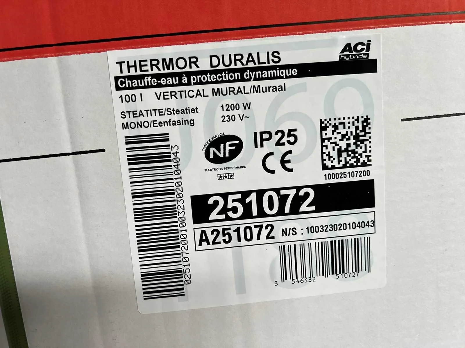 Merk: Thermor Type: Duralis 100l vertical Vermogen: 1200W Aansluiting: 230V