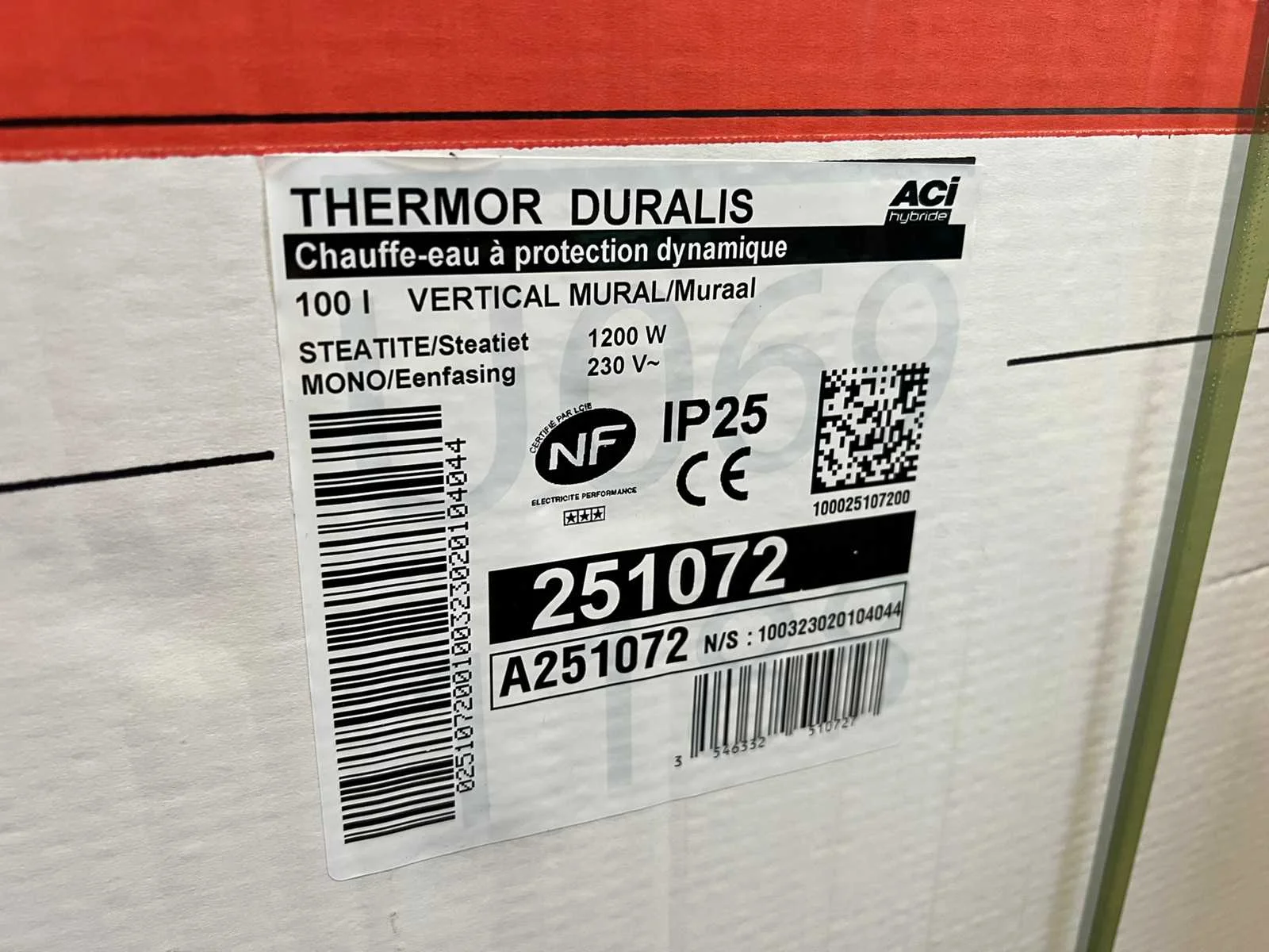 Merk: Thermor Type: Duralis 100l vertical Vermogen: 1200W Aansluiting: 230V