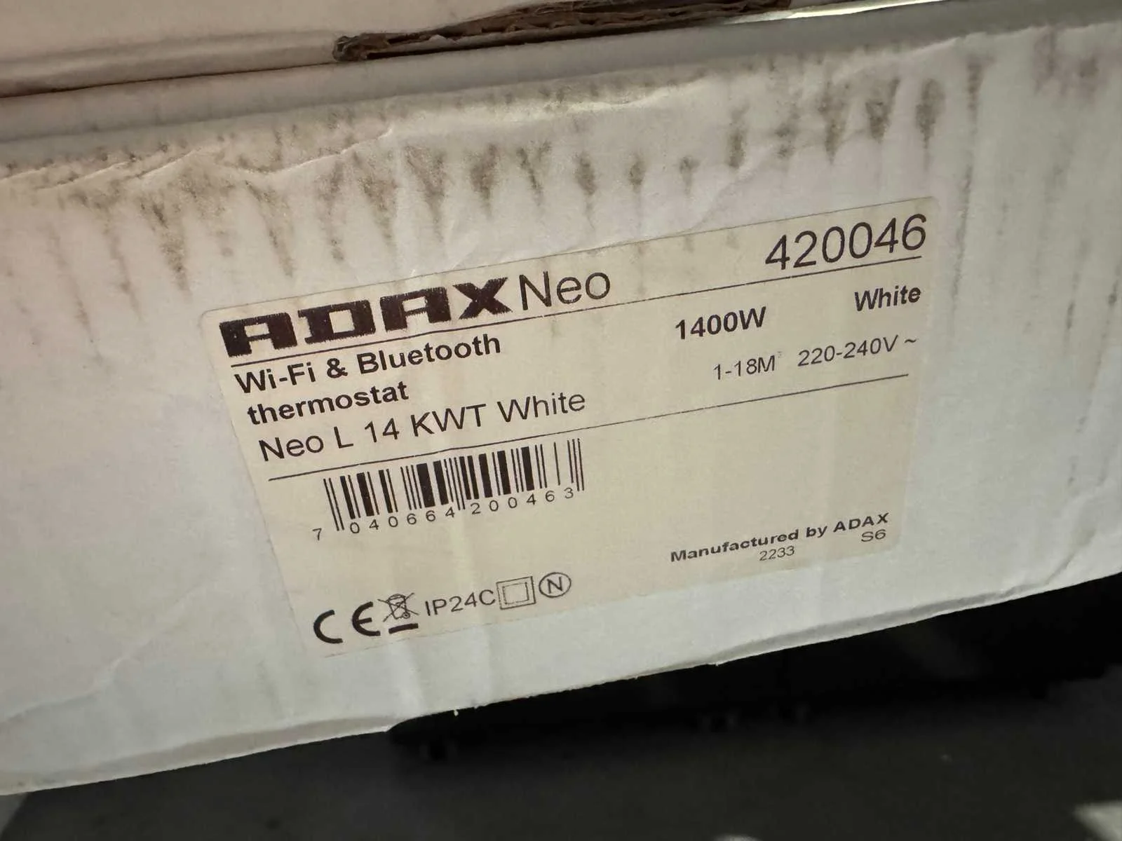 Merk: Adax Type: NEO L 14 KWT Vermogen: 1.4kW Aansluiting: 230V