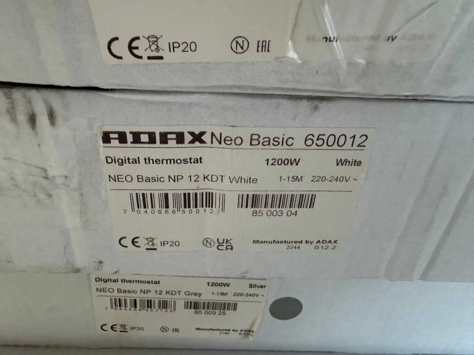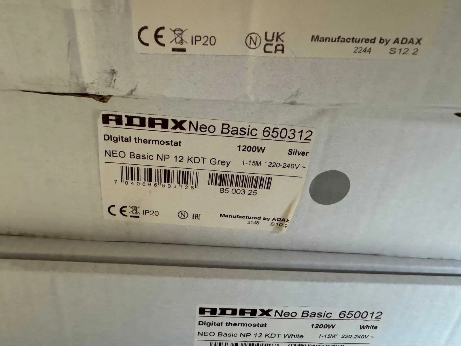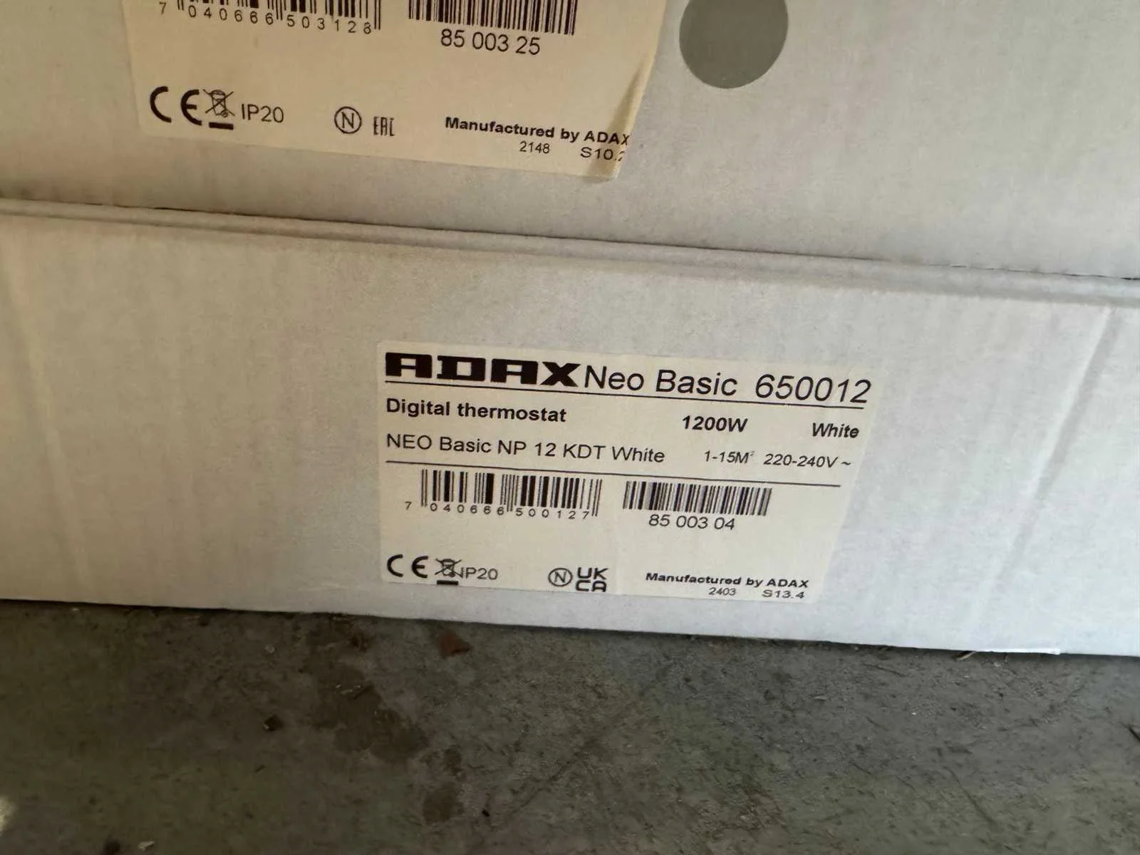 Merk: Adax Type: Neo Basic NP 12 KDT Vermogen: 1.2kW Aansluiting: 230V