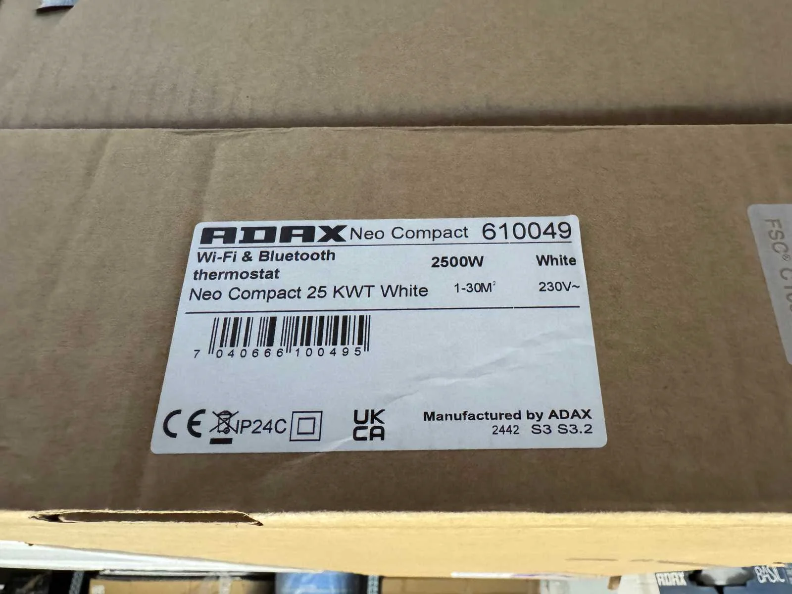 Merk: Adax Type: Neo Compact 25 KWT Vermogen: 2.5kW Aansluiting: 230V