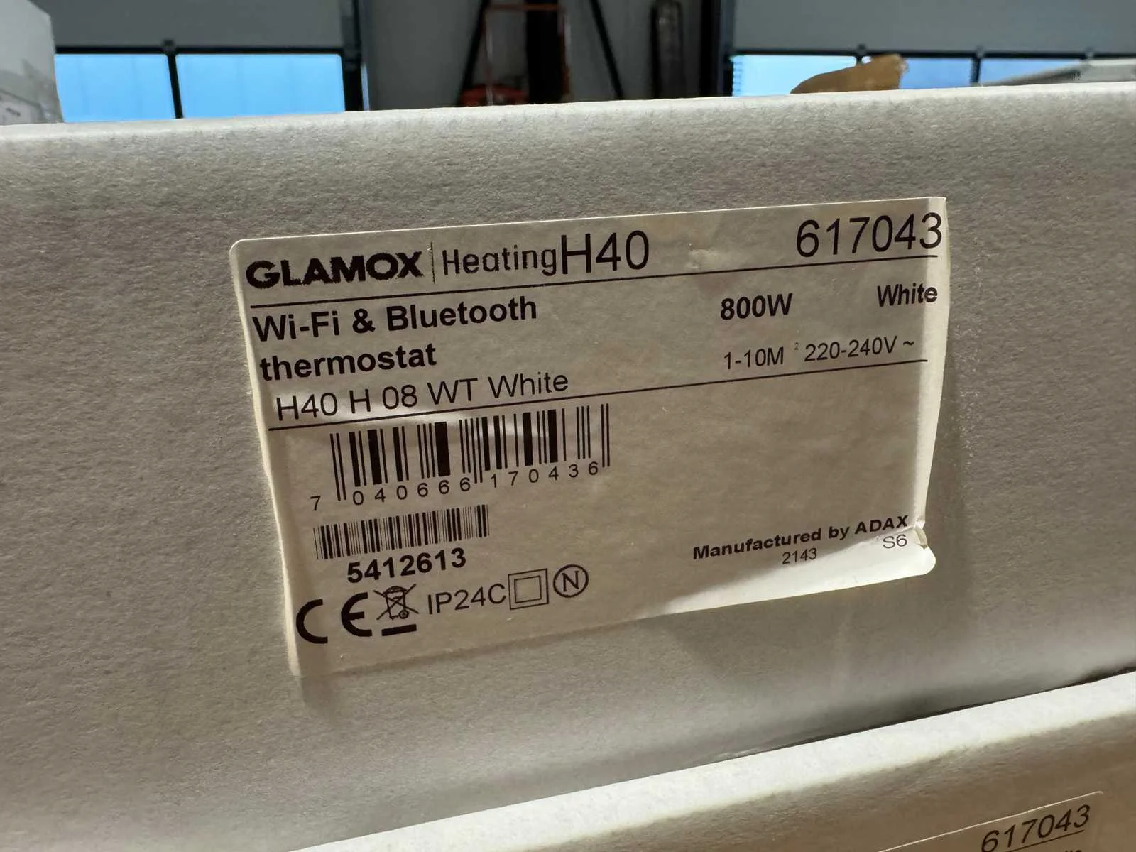 Merk: Glamox Type: H40 H 08 WT Vermogen: 0.8kW Aansluiting: 230V