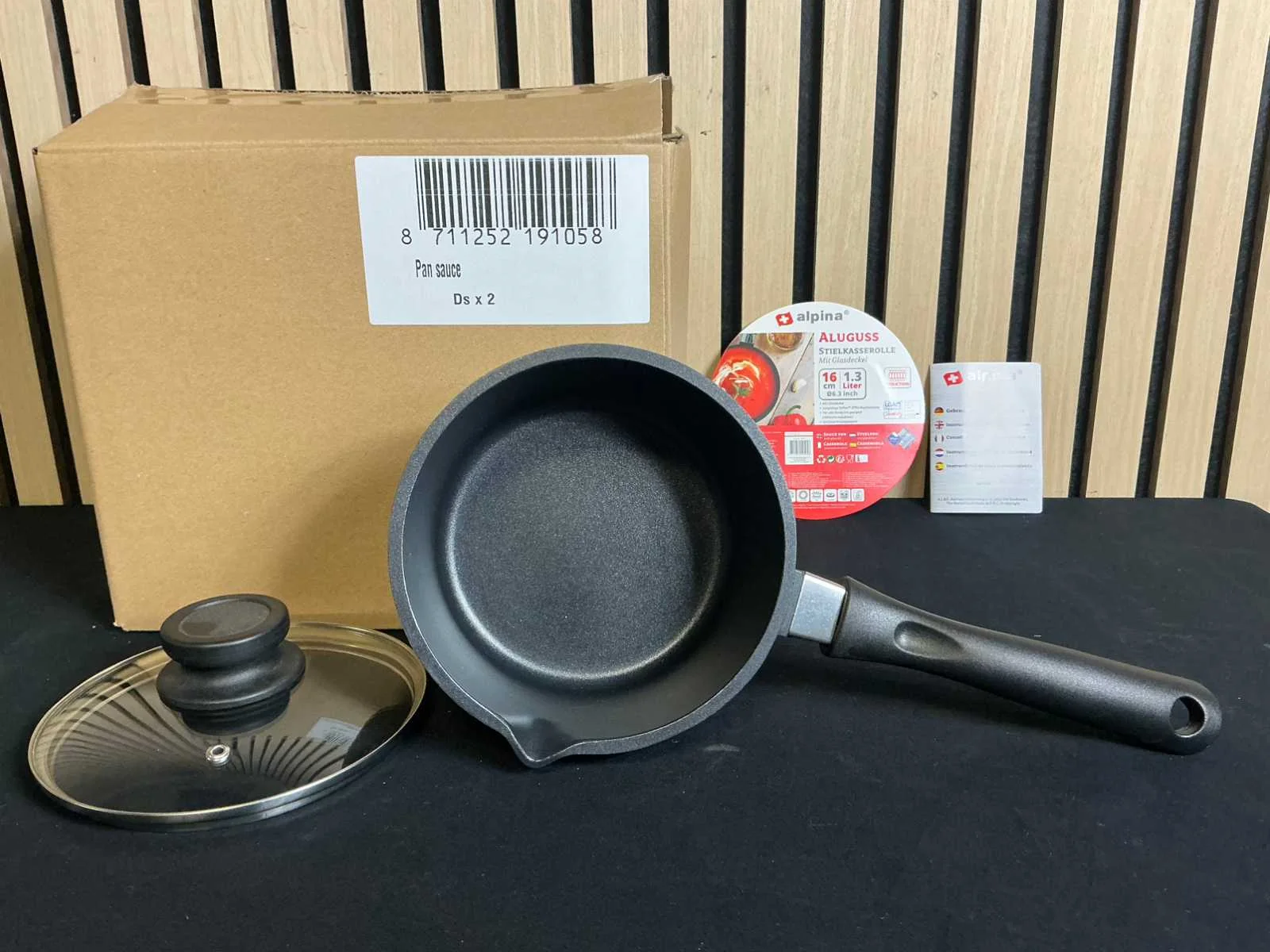 Product zit ongebruikt in de originele verpakking Afmetingen: Ø 16 cm x 8,5 cm Inhoud: 1,3 liter Vaatwasmaschinebestendig Geschikt voor alle soorten warmtebronnen Merk: Alpina Kleur: Zwart