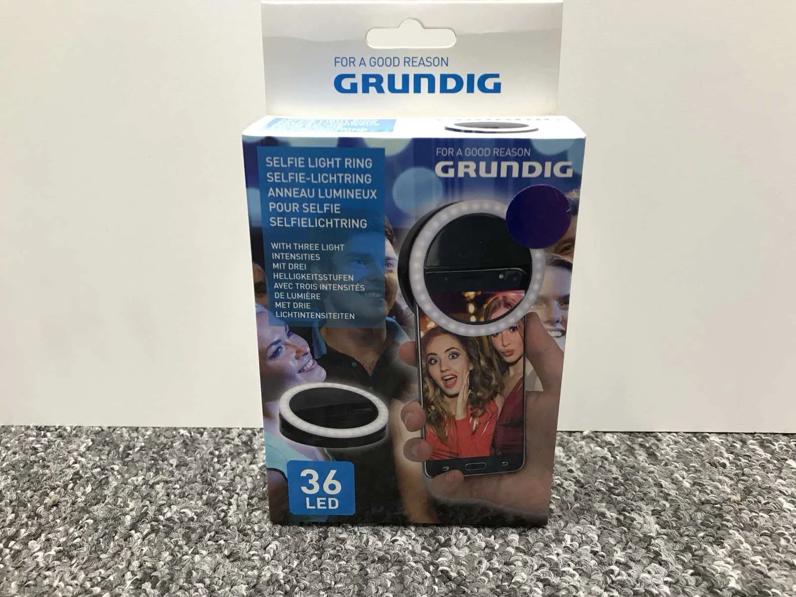 Ongebruikt in de verpakking; 3 verschillende niveaus aan lichtintensiteit • Werkt op 2 AAA-batterijen (niet inbegrepen) • Diameter van 8,5 cm • Compatibel met allerlei smartphones: Apple iPhone modellen, Samsung Galaxy Series zoals Galaxy S6 / S6 Edge Plus / Note 5, Sony, LG, Motorola, OnePlus, Huawei, Xiaomi, OPPO, en meer Merk: Grundig