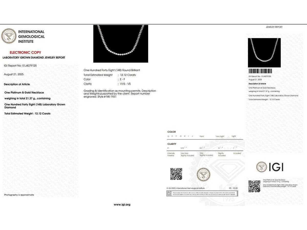 Lengte - 17 inch / 43 cm De ketting is gemaakt van platina met een sluiting van 18K witgoud. Rapportnummer - 51J4079125 Brutogewicht - 21,37 gram Totaal Carat Gewicht - 12.12 carat Kleur - E-F Duidelijkheid -VSS-VS Aantal diamanten - 148 Vorm - Rond briljant geslepen Bezichtiging op afspraak Materiaal: Platina Maten: 43 cm. Certificaat: Ja Lage schatting: 18900€
