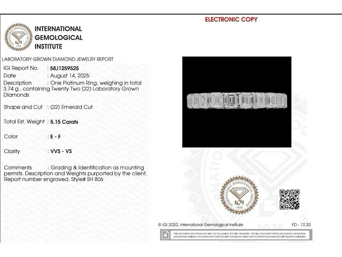 Platina 950 Eeuwigheidsring Carat- 5.15 Carat Kleur - E, F Helderheid - VVS-VS Gewicht - 3,74 gram Aantal diamanten - 22 Ringmaat - 55 EU / 15 IT / 7,25 US Platina950 eeuwigheidsring met volledig IGI-rapport. IGI-rapportnummer 58J1259525 Bezichtiging op afspraak Materiaal: Platina Ringmaat : 55 Certificaat: Ja Lage schatting: 4200€