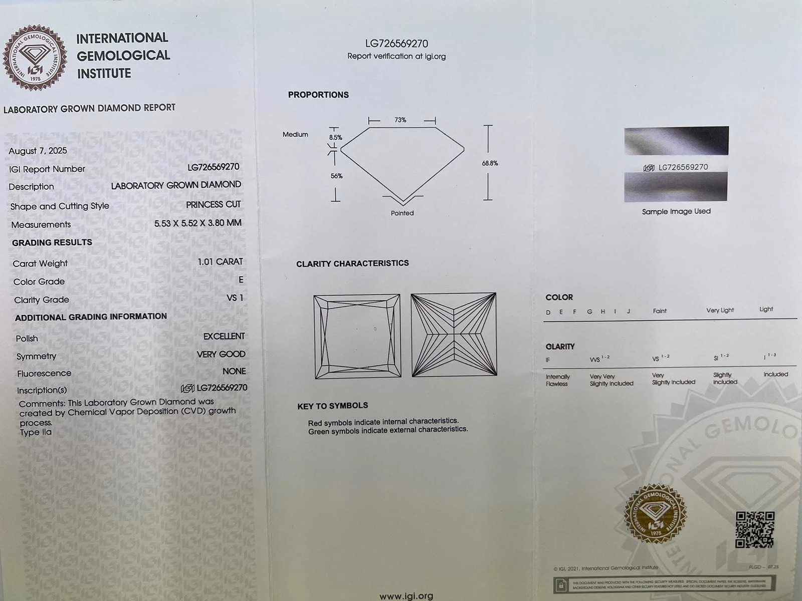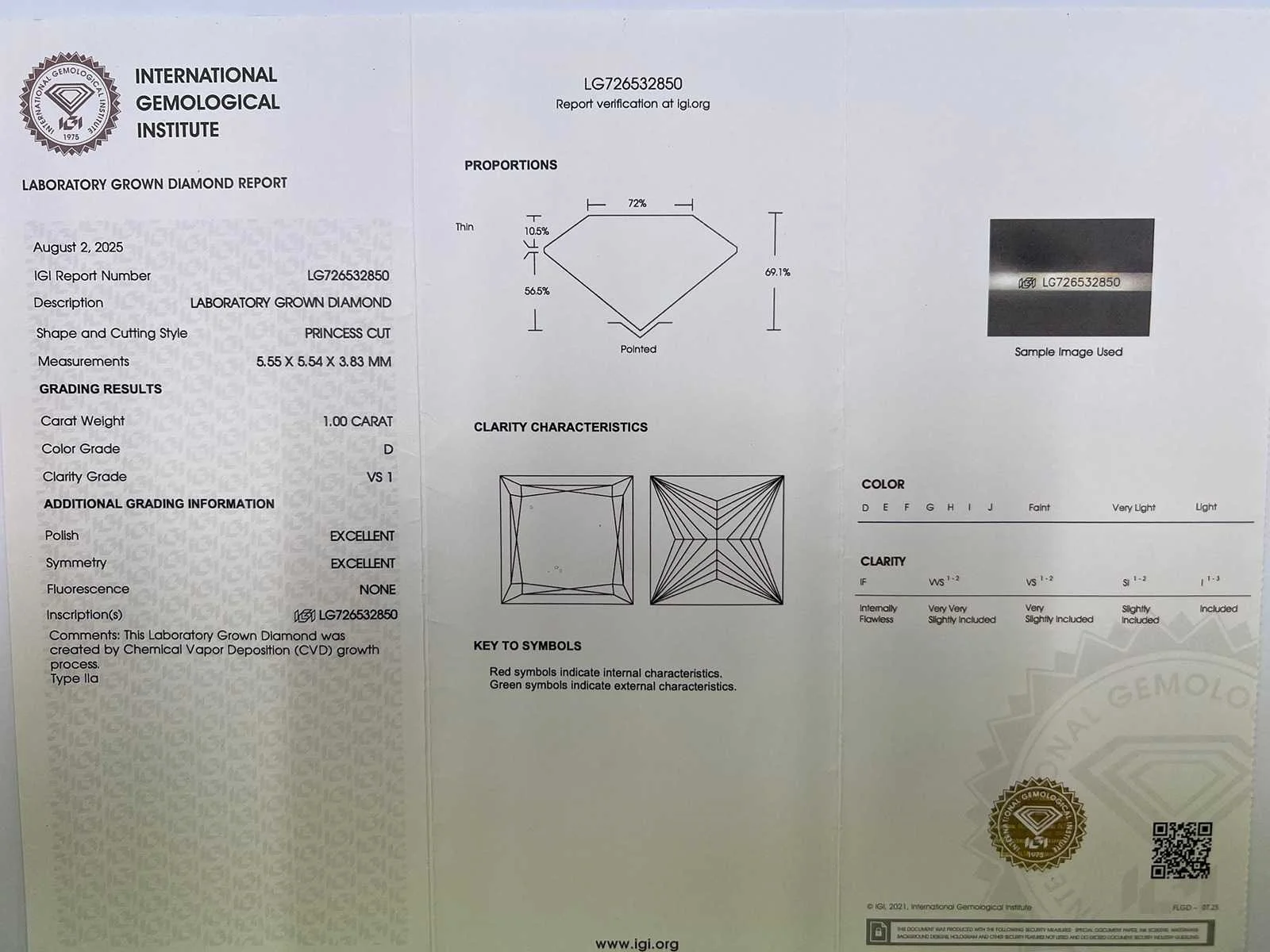 Rapportnummer IGI: LG726569270 + LG 726532850 Prinses gelsepen Gewicht: 2.01CT Kleur: D/E Helderheid: VS1/VS1 uitstekend Symmetrie: Uitstekend/Zeer goed Bezichtiging op afspraak Materiaal: Geelgoud Certificaat: Ja Lage schatting: 3000€