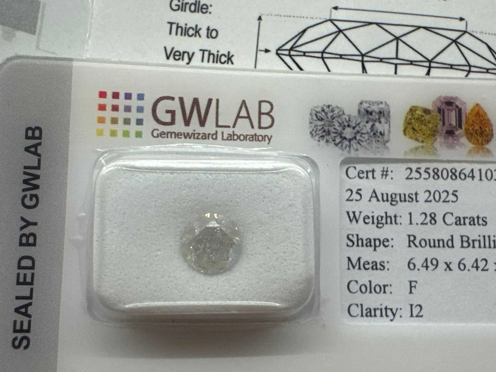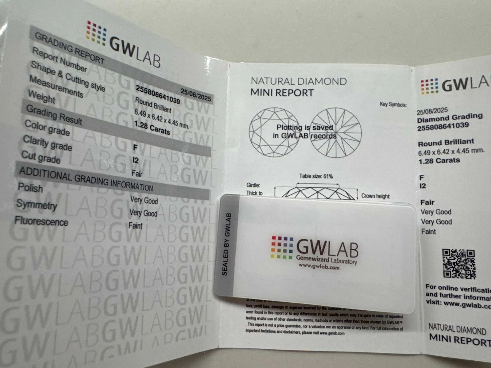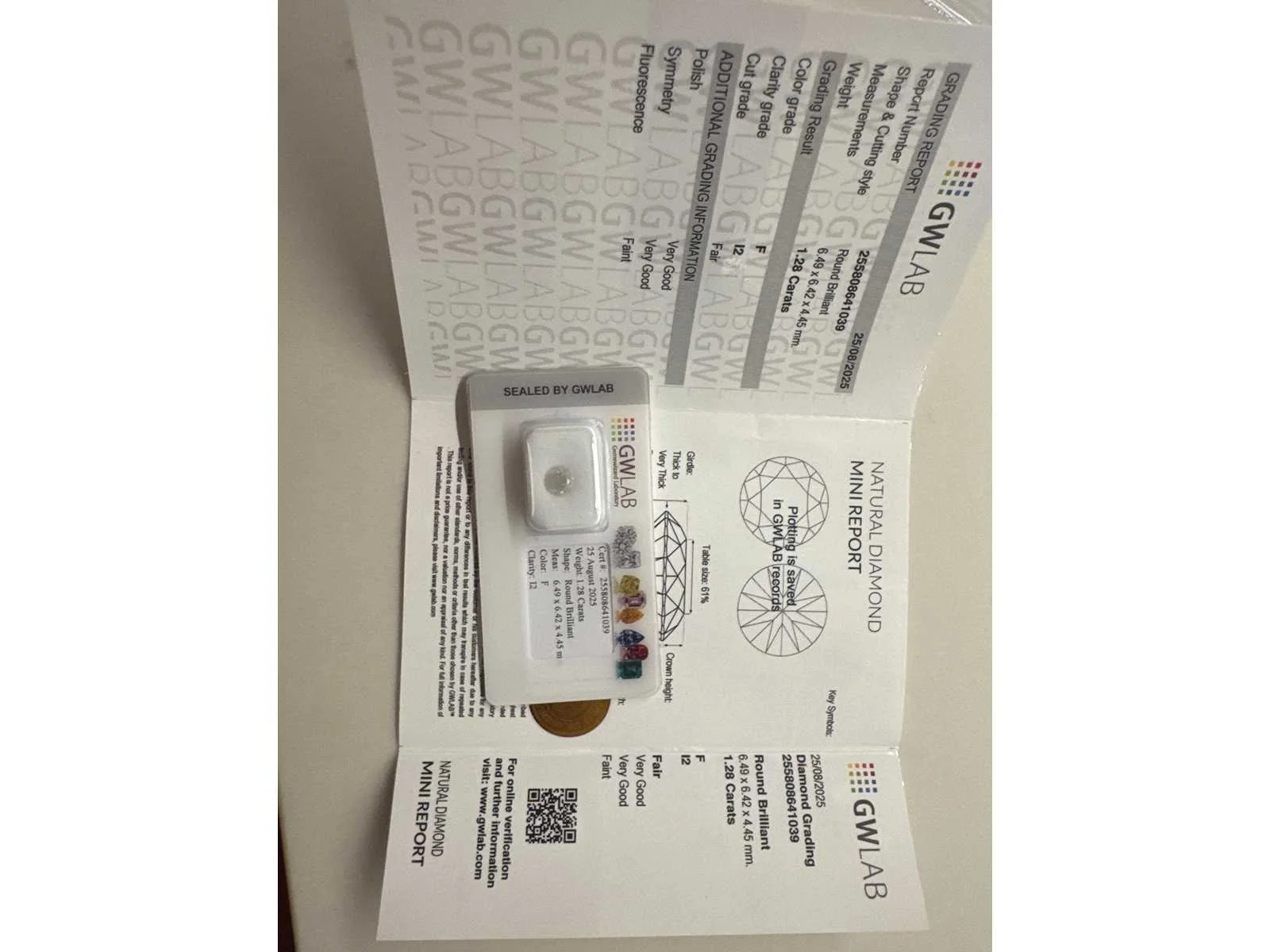 100% Natuurlijke Diamant Vorm: rond Totaal karaatgewicht 1,28 karaat Aantal diamanten: 1 Kleurbeoordeling: F Verhelderingsbereik: i2 Knip v Pol vg sym vg Bezichtiging op afspraak Certificaat: Ja Lage schatting: 5000€