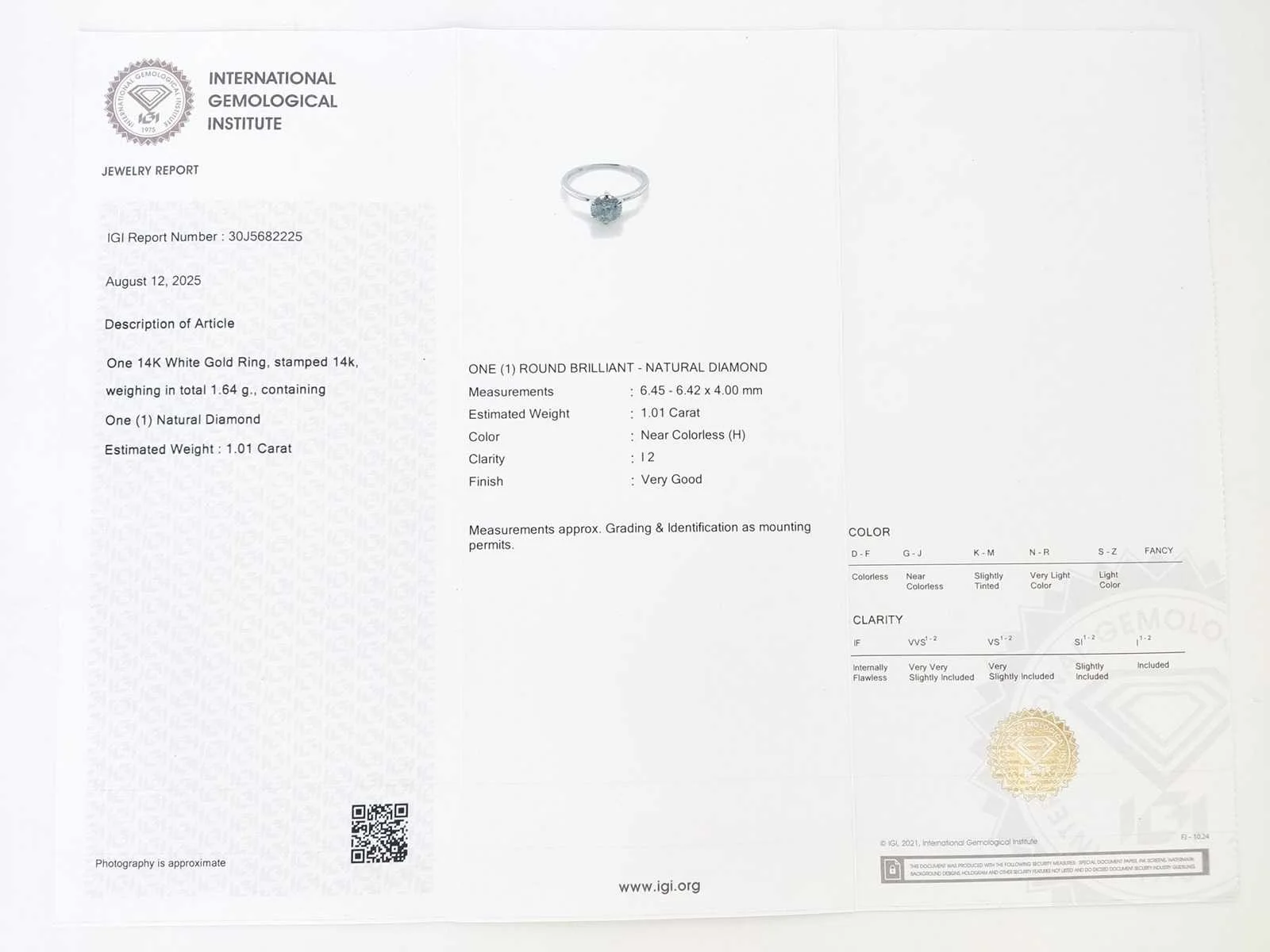 Diamantinformatie: Steensoort: natuurlijke diamant Vorm: Rond schitterend Gewicht in karaat: 1,01 karaat Kleur: H Helderheid: I2 Ringinformatie: Metaal: 14 kt / gestempeld 14k Kleur: Wit Gewicht: 1,64 gr Ringmaat: 54 mm / 17,10 mm / 6,75 US Bezichtiging op afspraak Materiaal: Witgoud Ringmaat : 54 Certificaat: Ja Lage schatting: 4300€