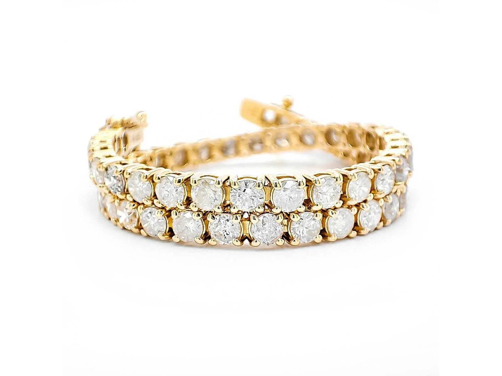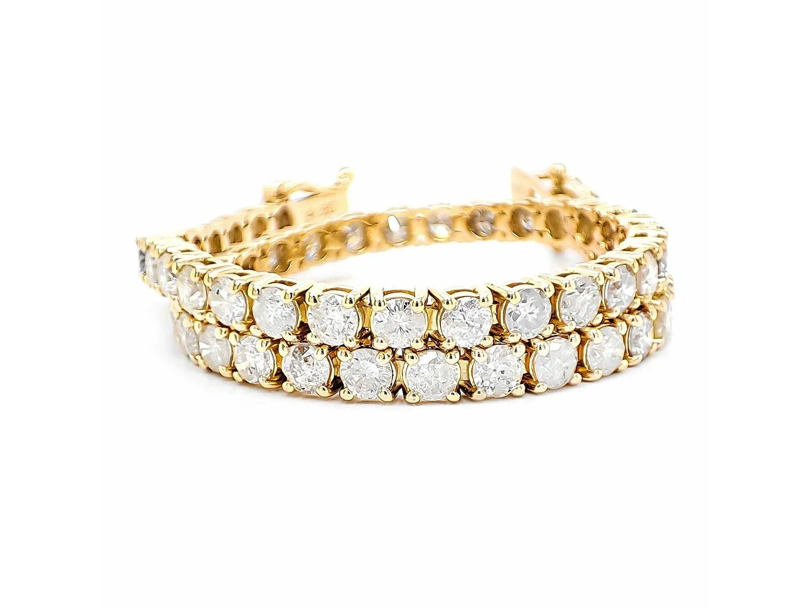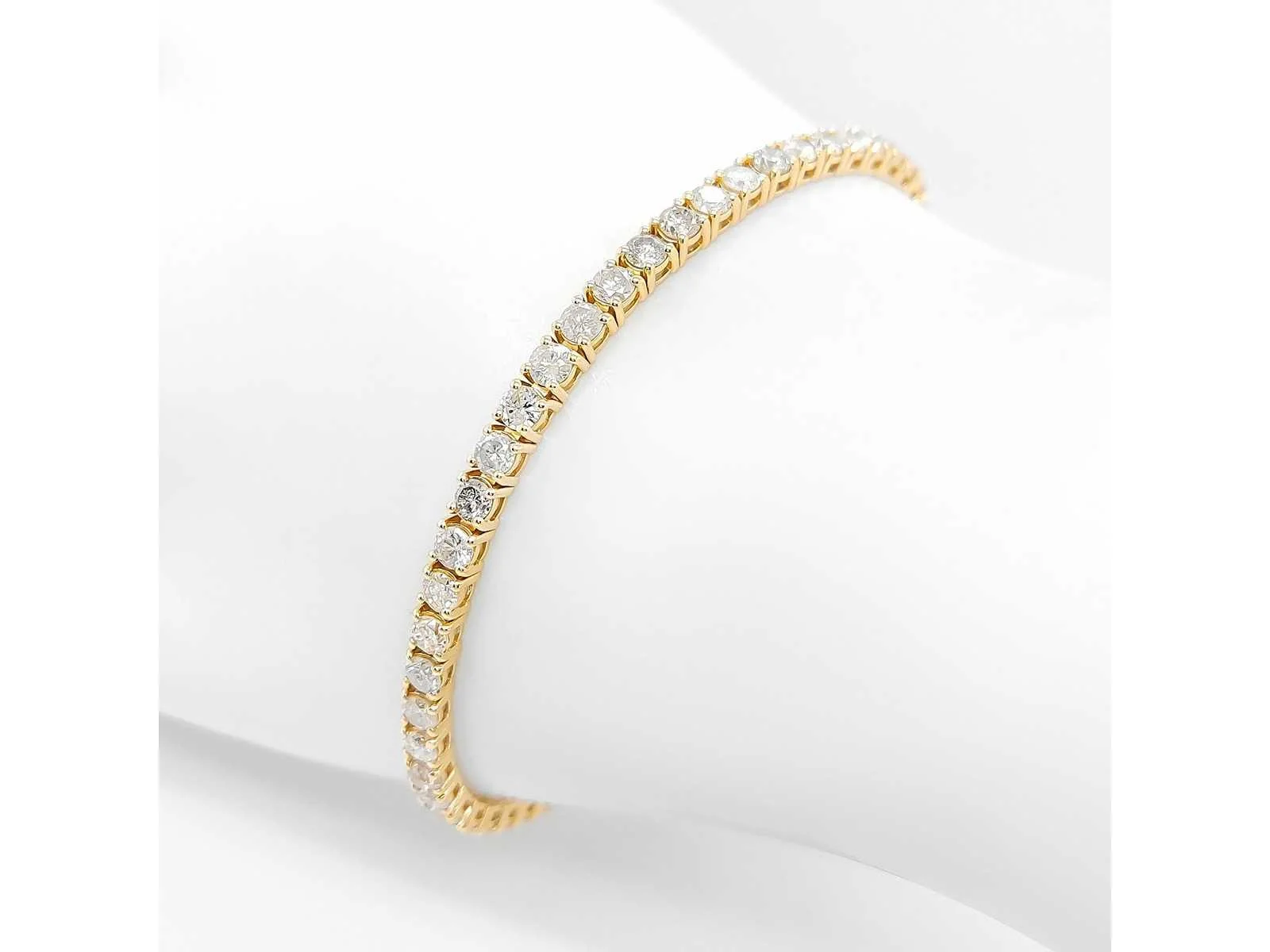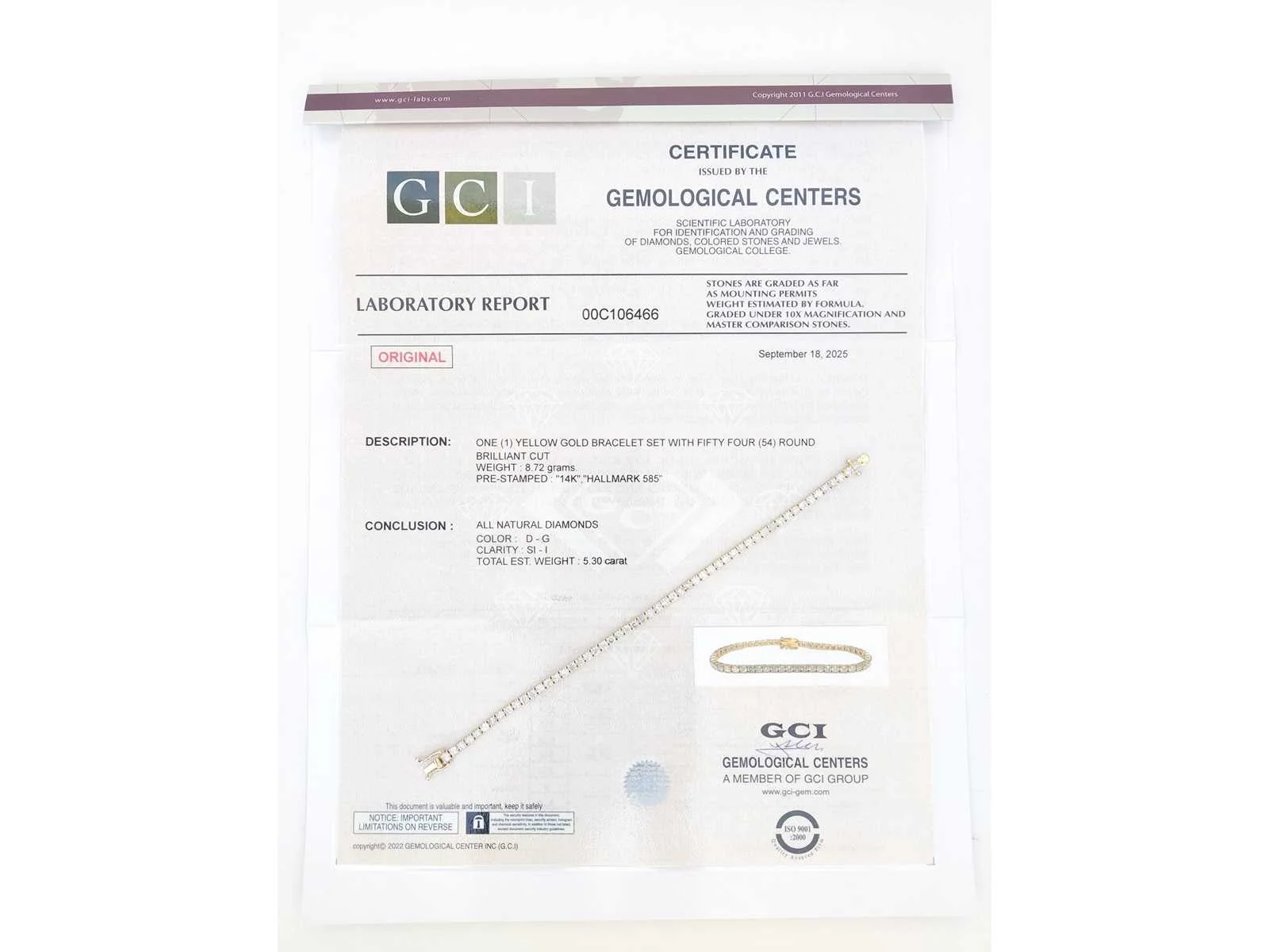 Diamanten Informatie: Soort stenen: natuurlijke diamant Vorm: Rond schitterend Hoeveelheid: 54 Totaal gewicht in karaat: 5,30 karaat Kleur: D-G Helderheid: Si-i Armband Informatie: Goudsoort: 14 kt / gestempeld 585/geelgoud Gewicht: 8,72 gr Lengte: 18 cm Breedte: 3,20 mm Bezichtiging op afspraak Materiaal: Geelgoud Lengte: 18cm Certificaat: Ja Lage schatting: 11300€