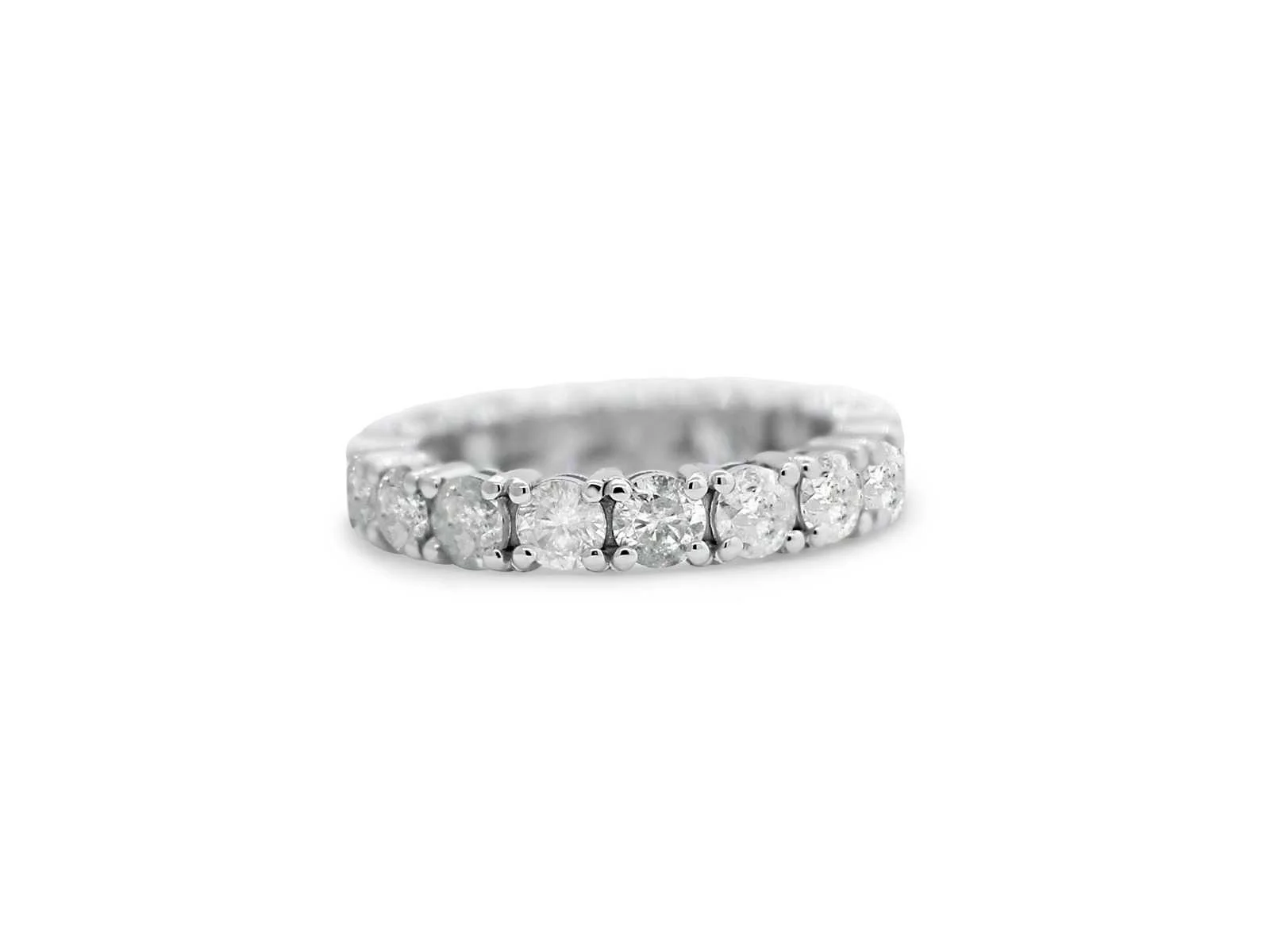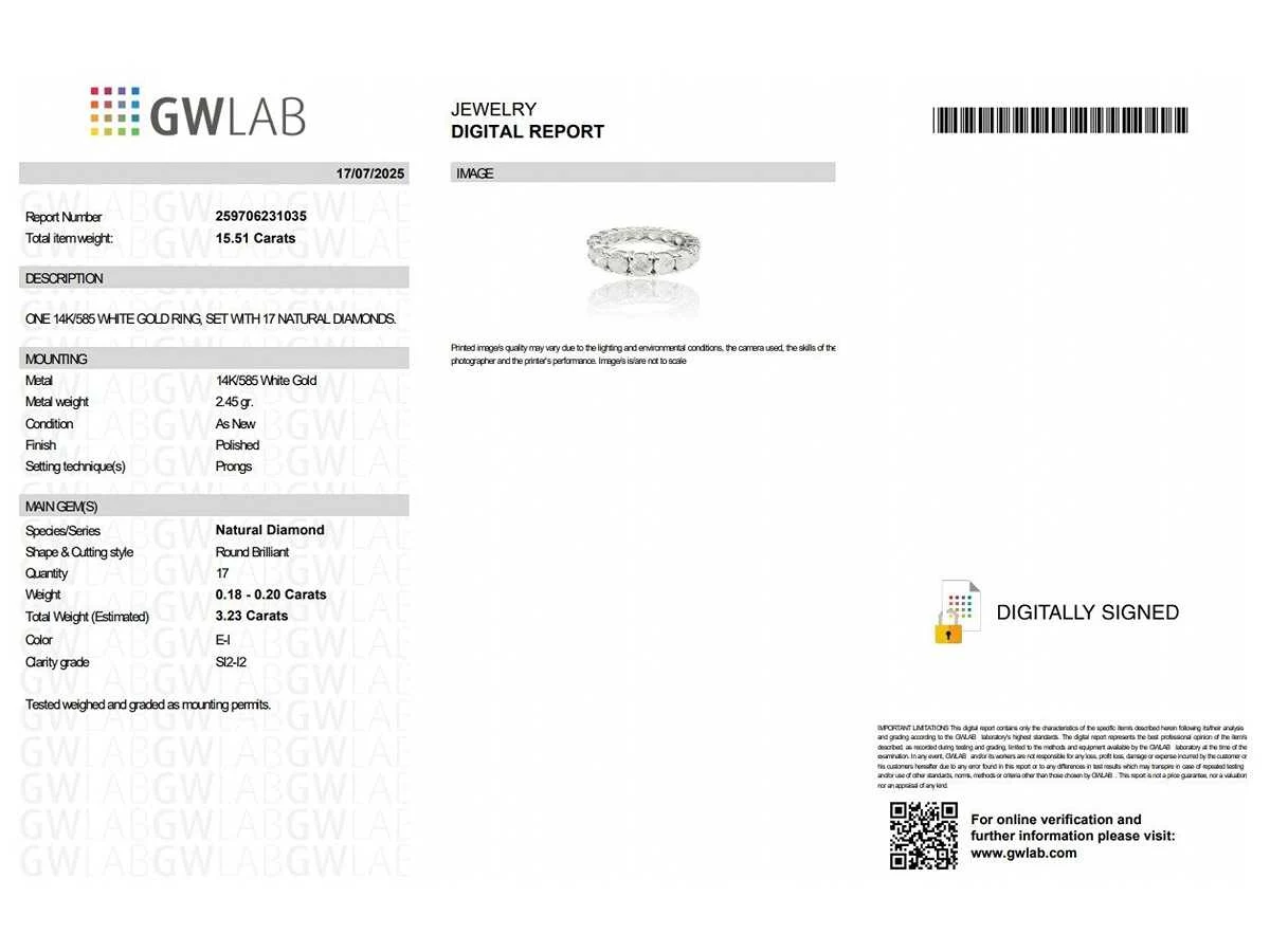 Eternity 17 stenen diamanten ring Natuurlijke diamant Geslepen: Rond brilliant Karaat: 3,23 crt. Kleur: E-I Helderheid: SI2-I2 Bezichtiging op afspraak Materiaal: Witgoud Ringmaat : 54 Certificaat: Ja Lage schatting: 11900€