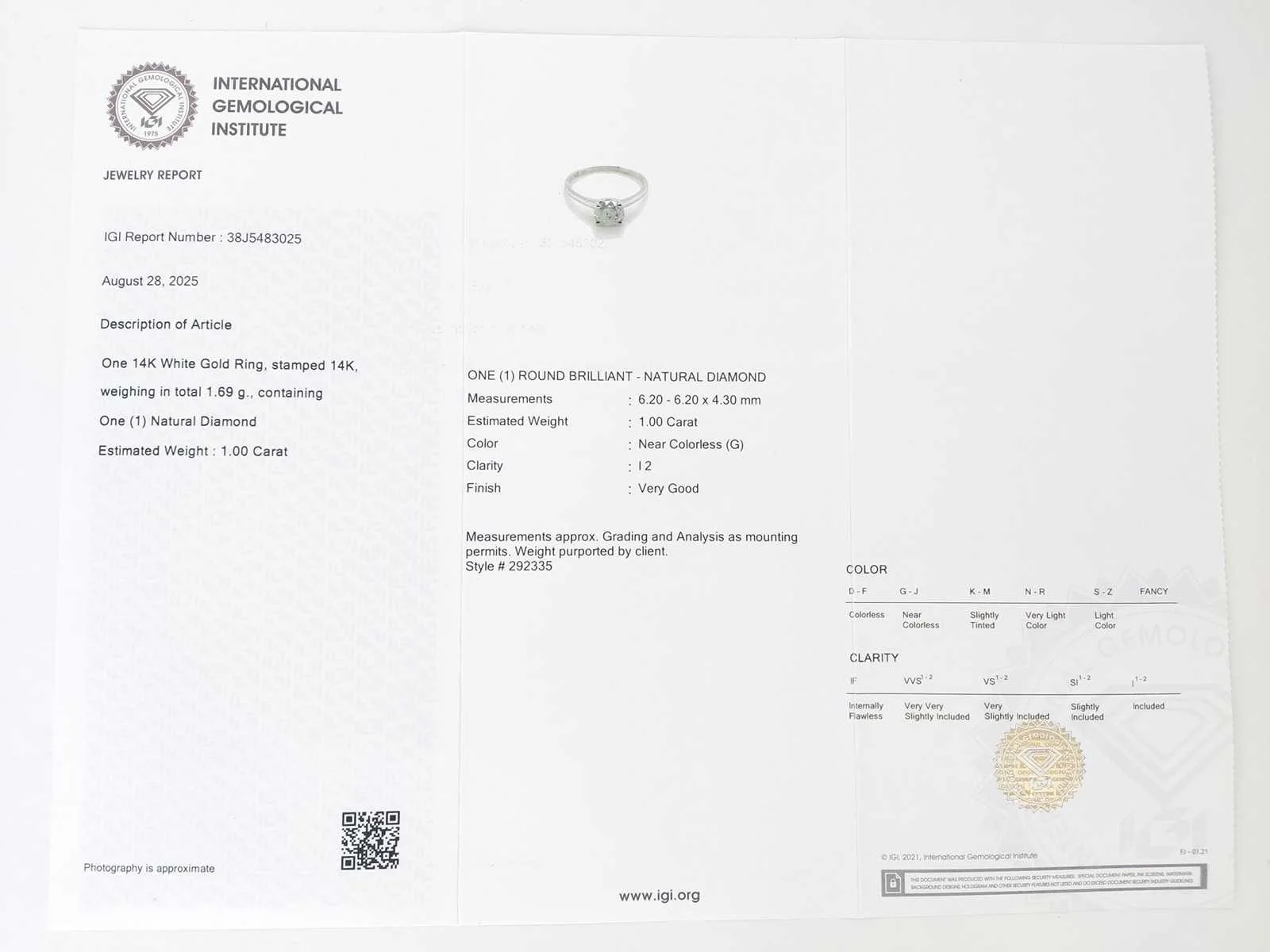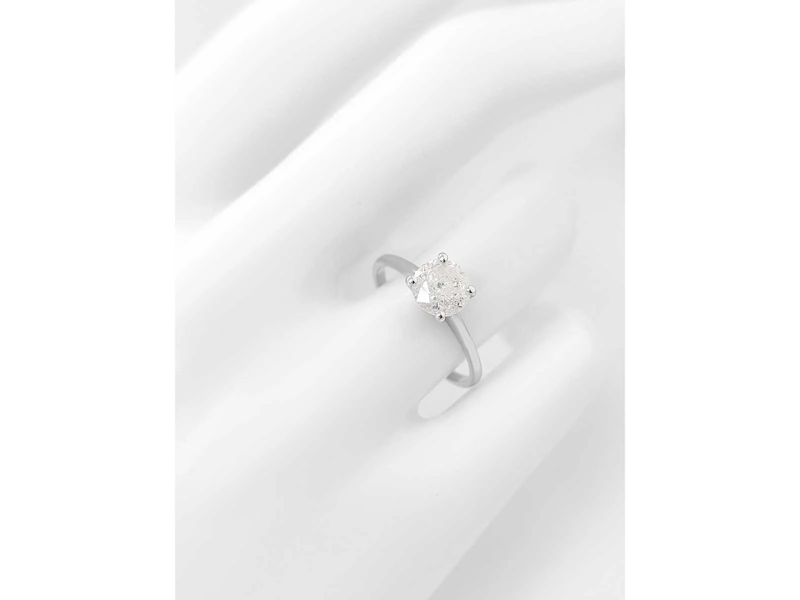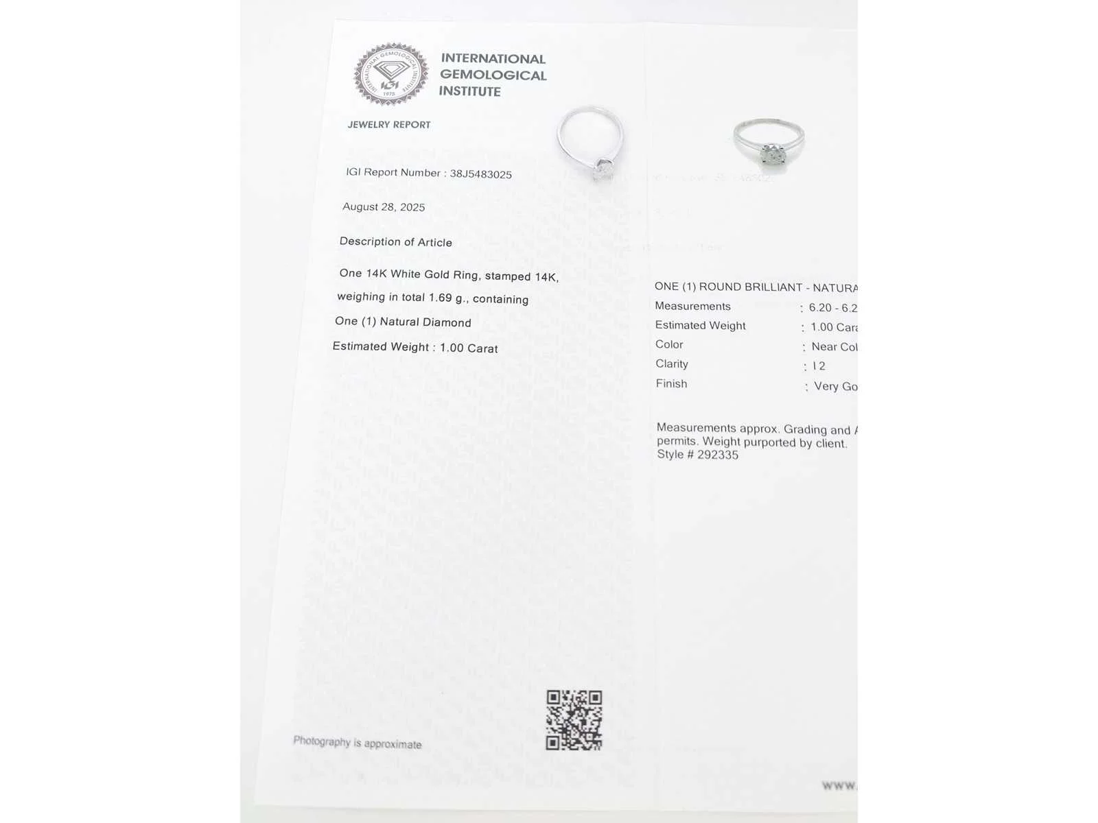 Diamantinformatie: Steensoort: natuurlijke diamant Vorm: Rond schitterend Karaatgewicht: 1,00 karaat Kleur: G Helderheid: I2 Metaal: 14 kt / gestempeld 14k Kleur: Wit Gewicht: 1,69 g Bezichtiging op afspraak Materiaal: Witgoud Ringmaat : 54 Certificaat: Ja Lage schatting: 4500€