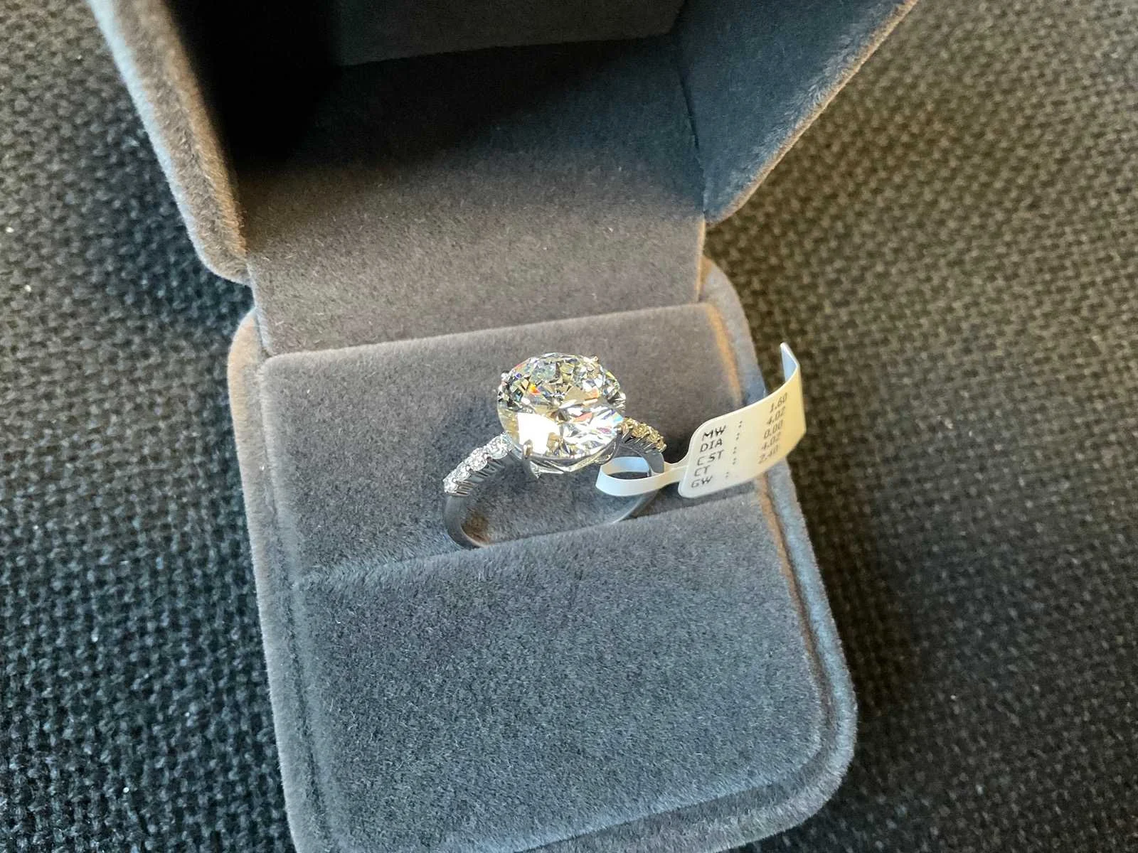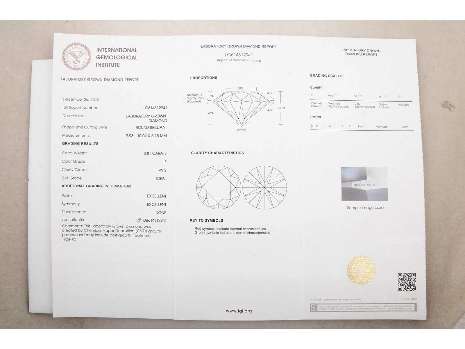 4,02-karaat diamant ronde briljant ring - IGI gecertificeerd Metaal: 14K Witgoud Totaal gewicht van diamanten: 4,02 Totale productgewicht: 2,40 Belangrijkste diamanten: - Aantal stuks: 1 - Vorm: Rond Briljant - Certificaatnummer: 614312941 - Lab: Internationaal Gemologisch Instituut - Duidelijkheid: VS 2 Kleur: F Omringende diamant: Karaatgewicht: 0,21 Aantal stuks: 8 Bezichtiging op afspraak Materiaal: Wit gouden Ringmaat : 55 Certificaat: Ja Lage schatting: 7800€