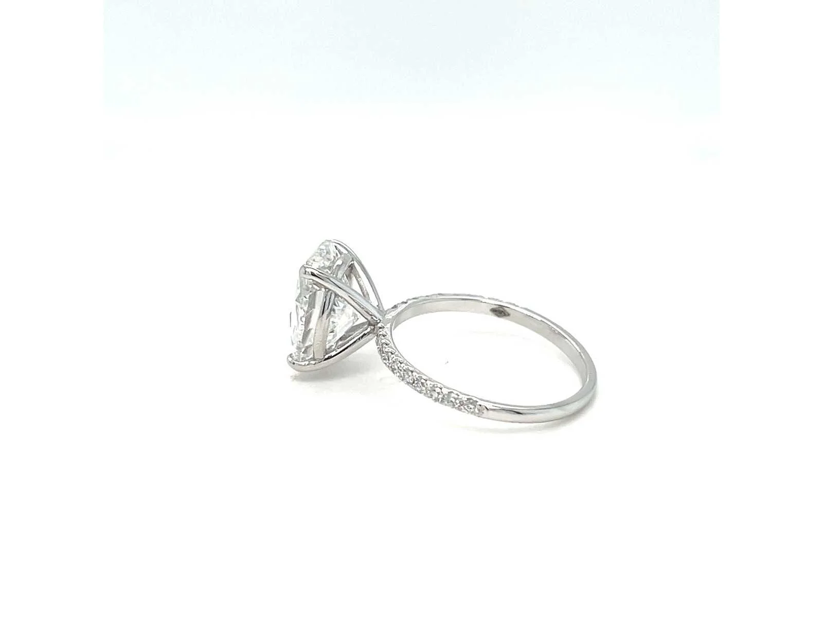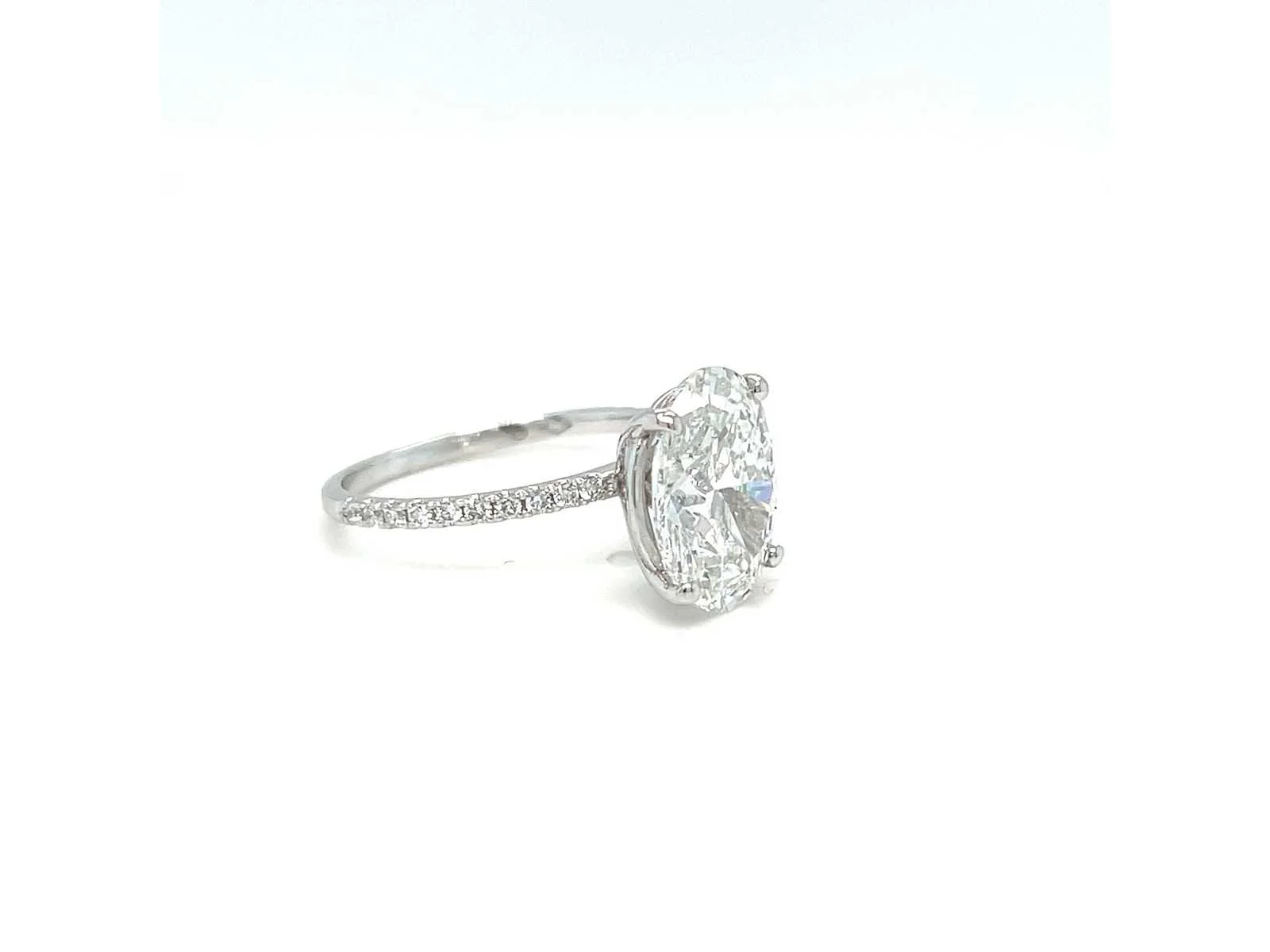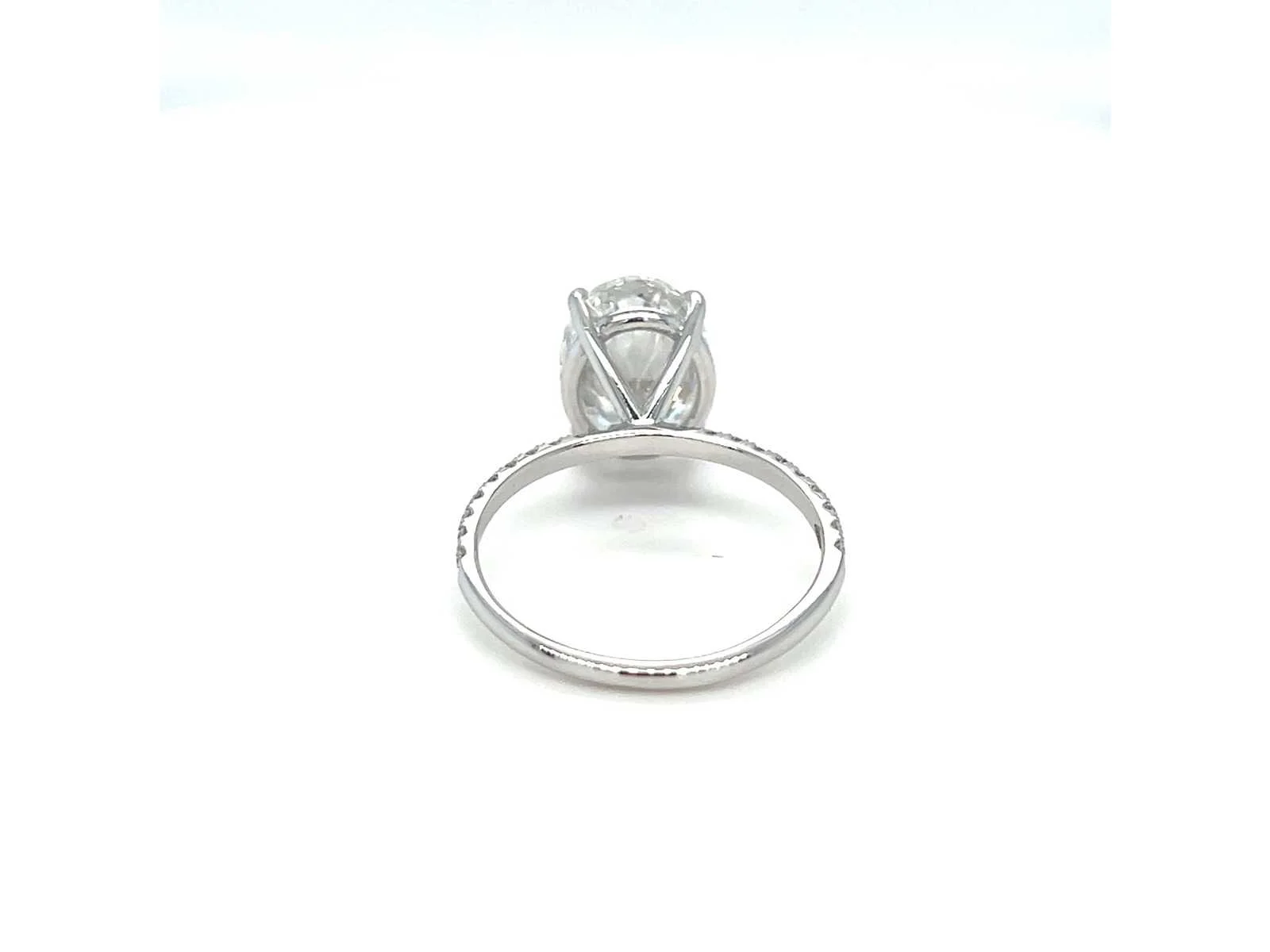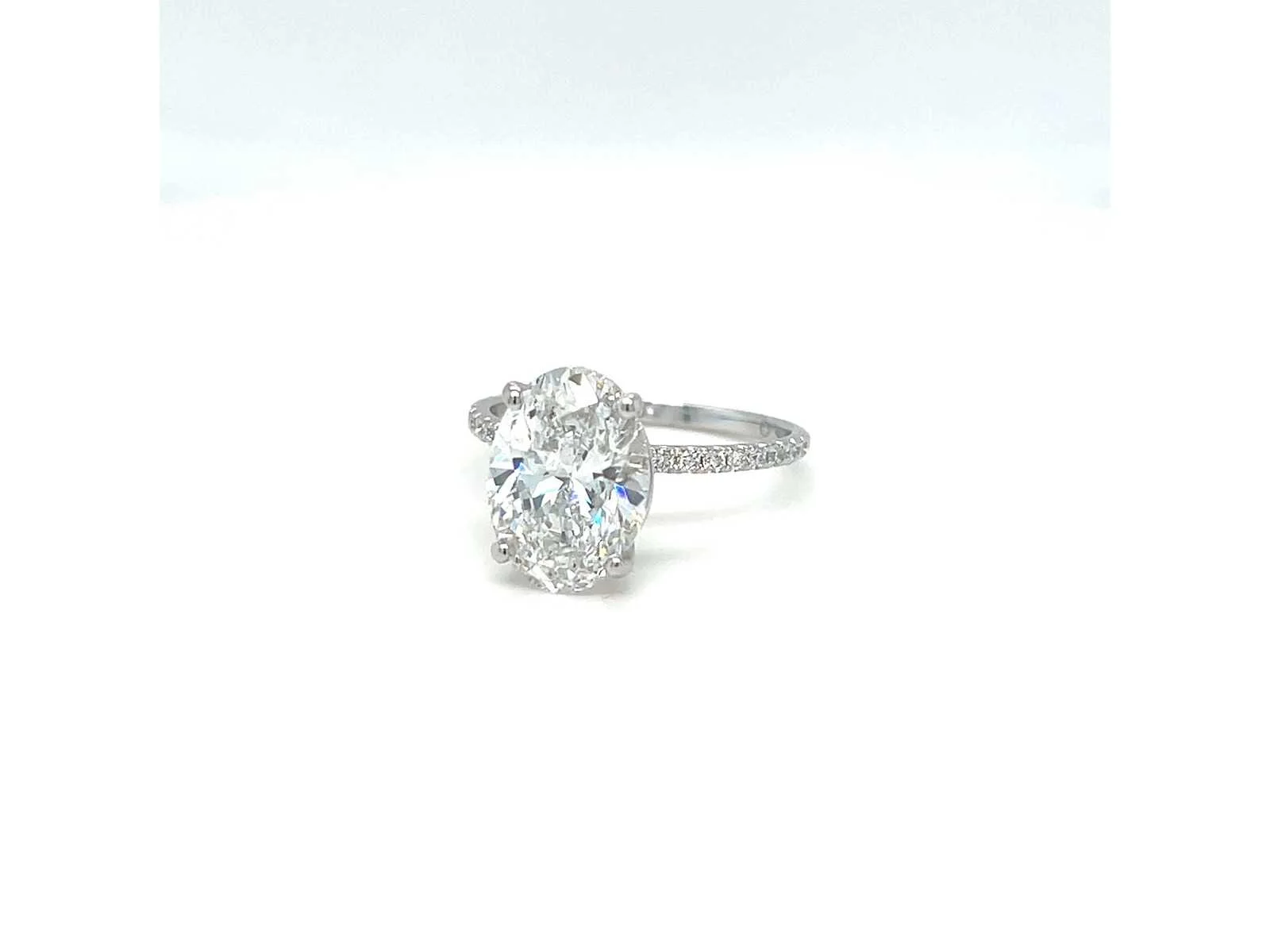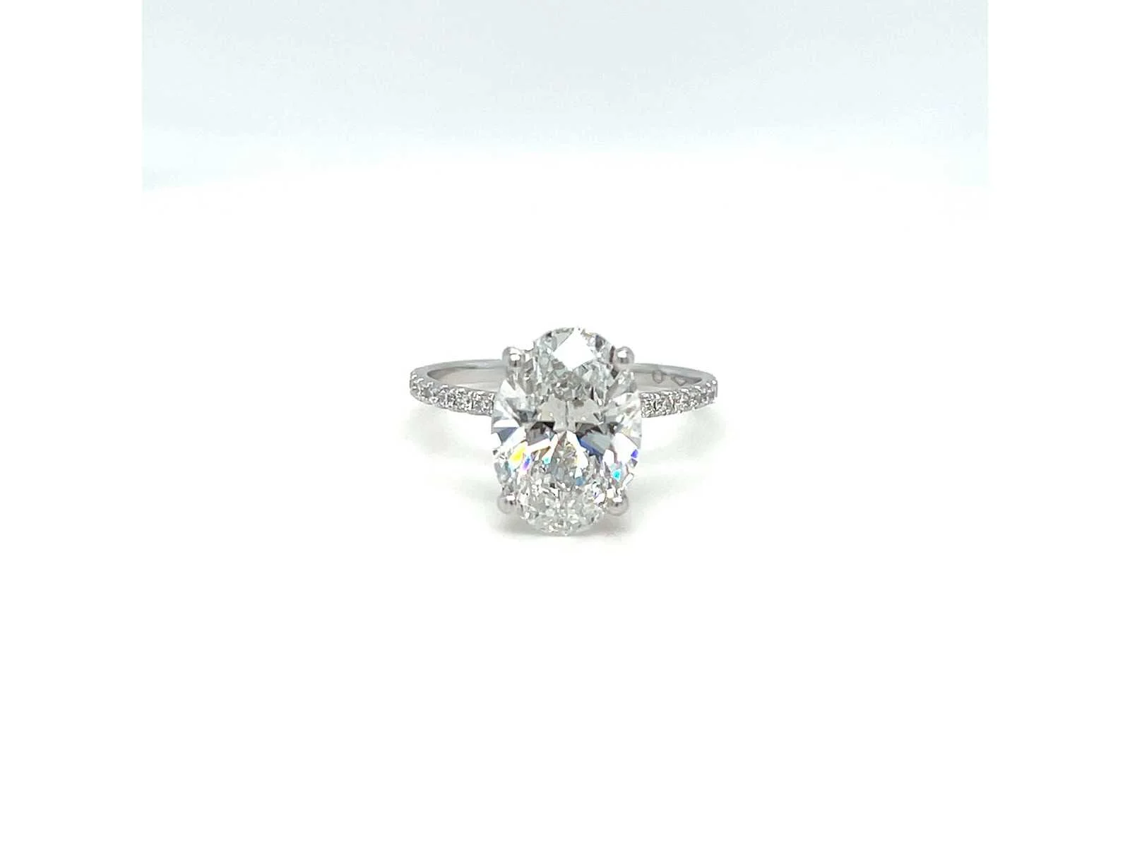 Vorm: ovaal Gewicht: 4,02 CT Kleur: D Helderheid: VS2 Symmetrie: uitstekend Fluorescentie: geen Zijstenen: 20 stuks, rond 0,17 ct Bezichtiging op afspraak. Materiaal: Witgoud Ringmaat : 54 Certificaat: Ja Lage schatting: 7400€