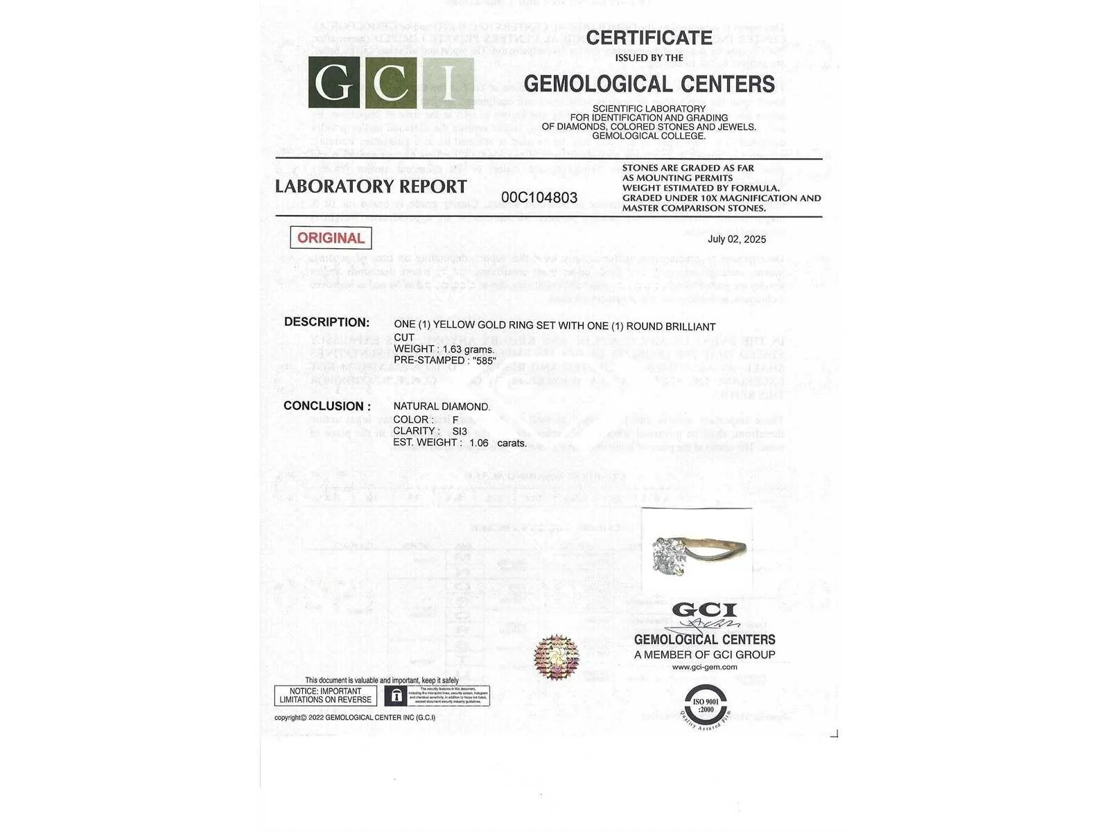 Natuurlijk diamant Vorm en snijstijl: Rond Brilliant Karatgewicht: 1,06 ct Kleurgradatie F Helderheidsgraad SI3 Metaal: Geel goud, 14 karaat / 585 Bezichtiging op afspraak. Materiaal: Geelgoud Ringmaat : 52 Certificaat: Ja Lage schatting: 6400€