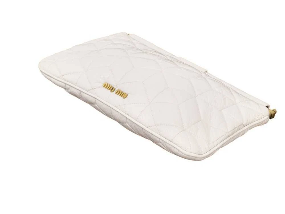 Miu Miu Pochette in witte gelakte leren uitvoering met gouden details, het klassieke handtasmodel. Staat: Uitstekend Bezichtiging op afspraak Merk: Miu Miu Fabrikant: Miu Miu Materiaal: Wit leer Model: Pochette Product type: handtas Lengte: 16cm Breedte: 25cm