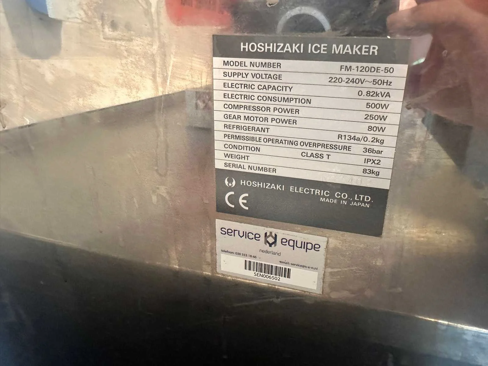 Merk: Hoshizaki Type: FM-120DE-50 Eigen gewicht: 83kg Rvs: true Aansluiting: 230V