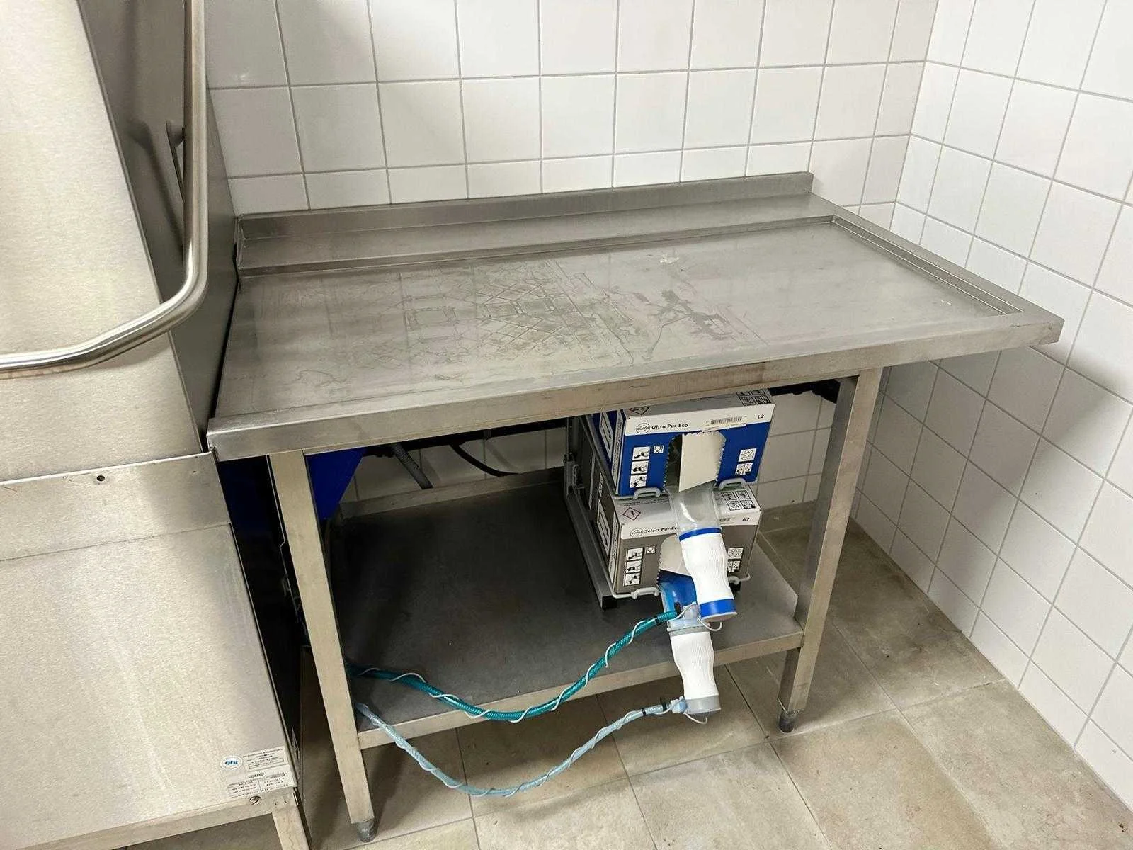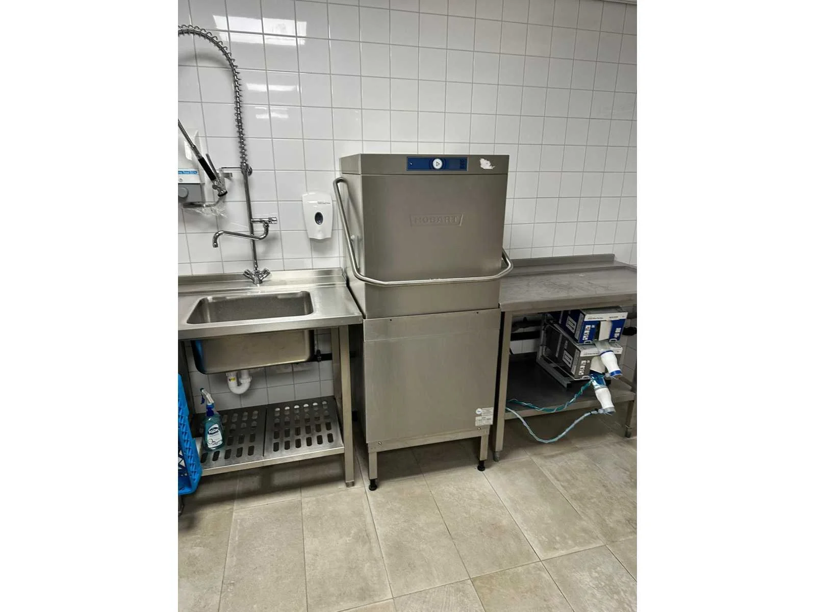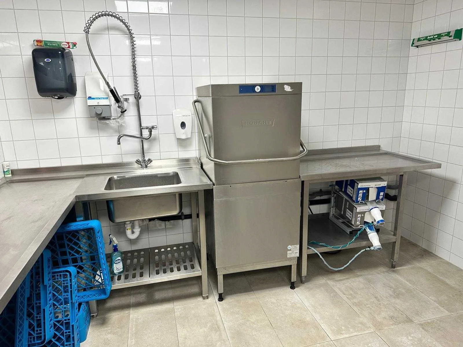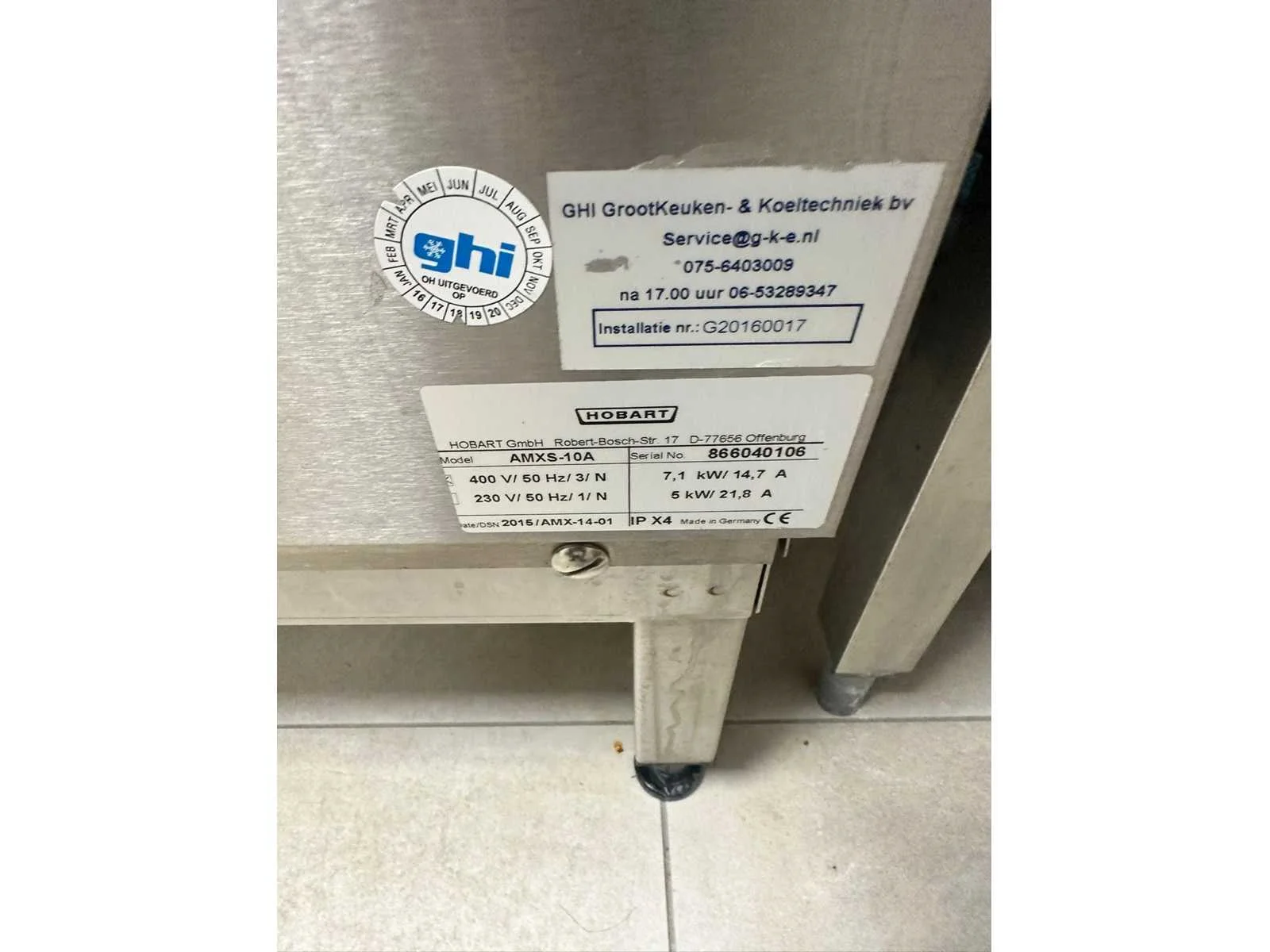 Aanvoertafel met kraan hoekmodel 150x120x75cm, afvoertafel 120x75cm. Merk: Hobart Model: AMXS-10A Spanning: 400V Materiaal: RVS