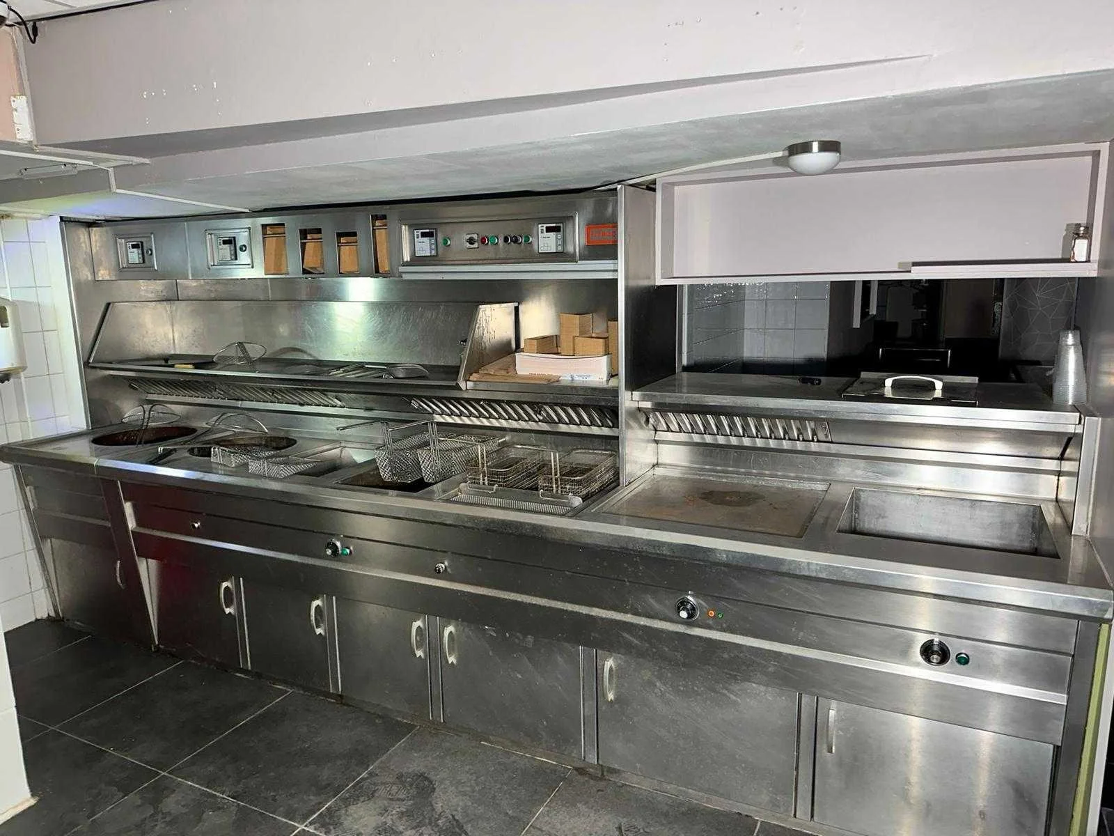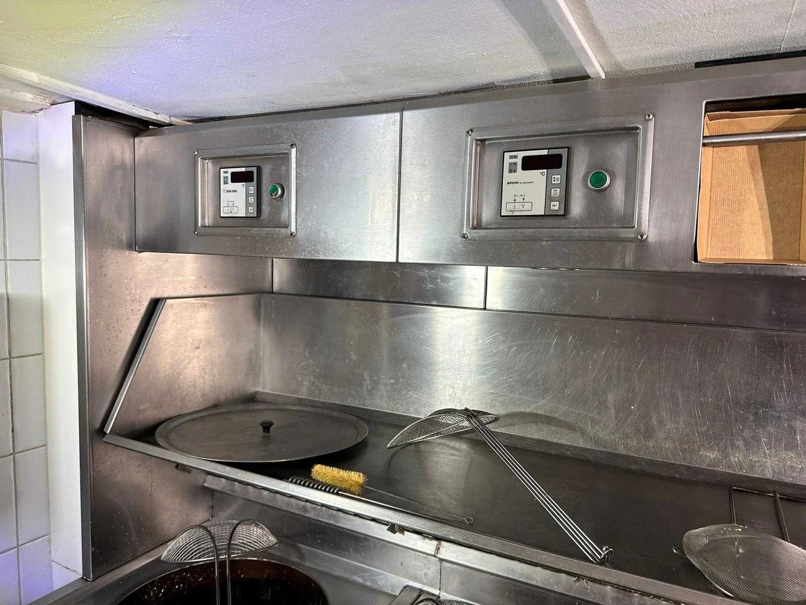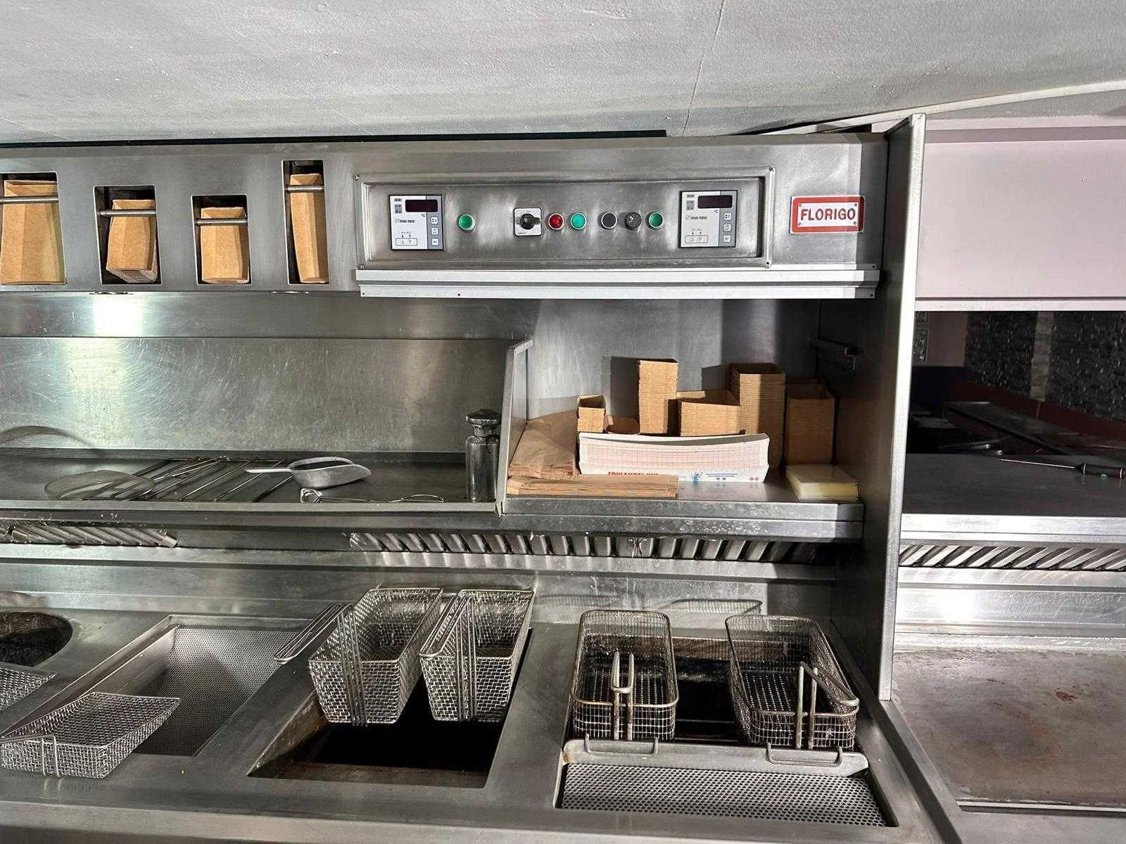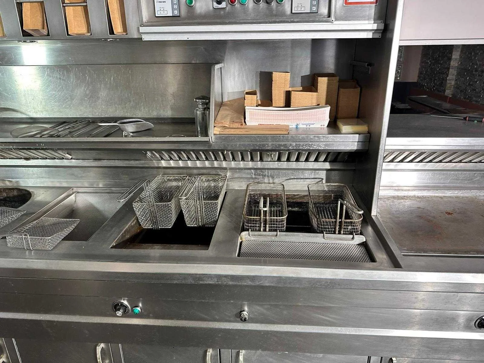Complete snack bakwand, voorzien van 2x ronde frituurpan 44cm, 4x snackmand, bakplaat, au bain Marie. Merk: Florigo Totale afmeting Breedte: 4000mm Rvs: true