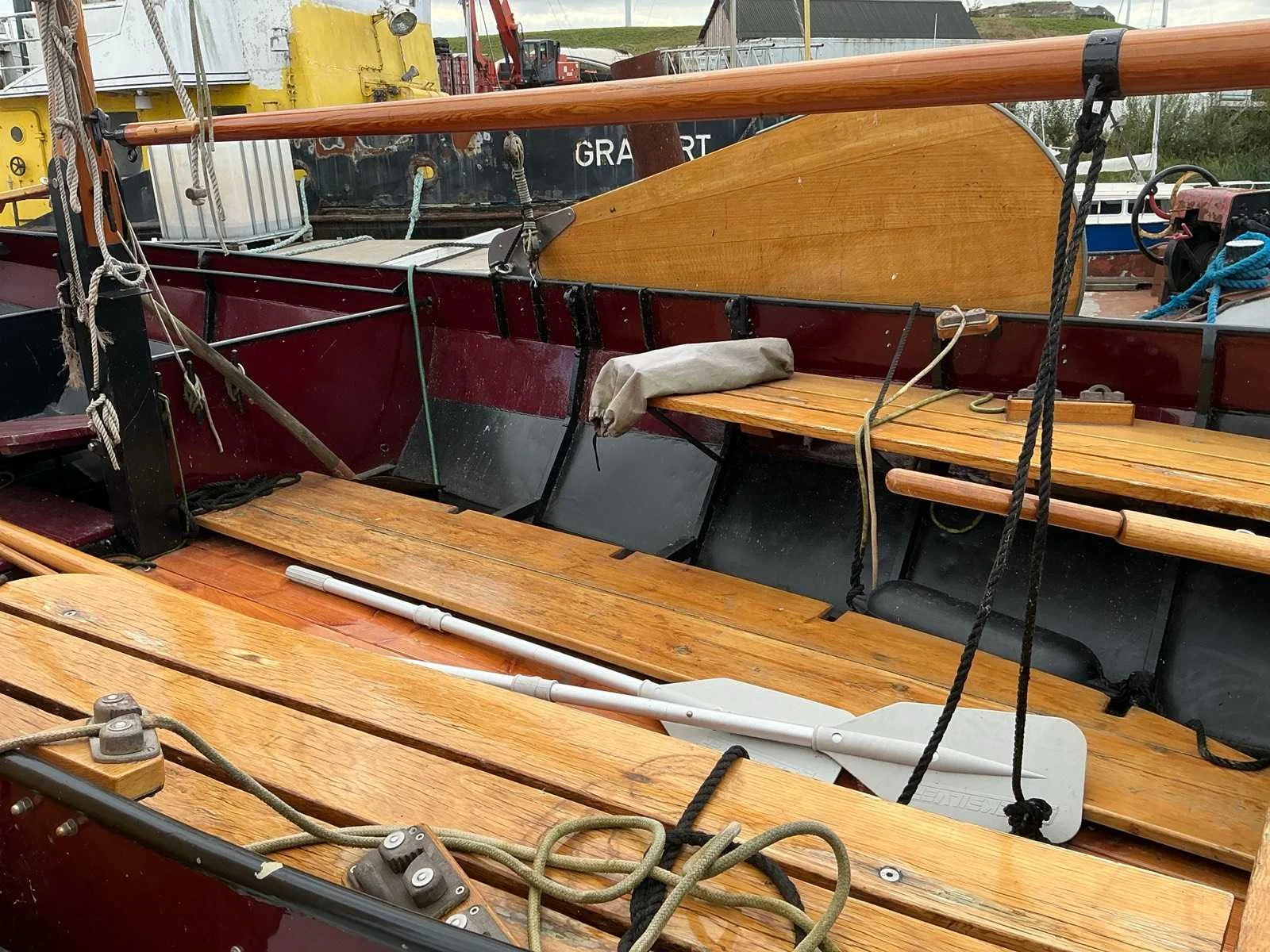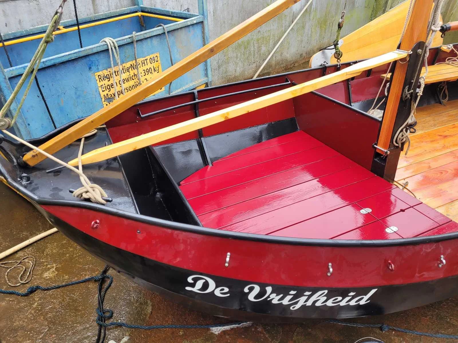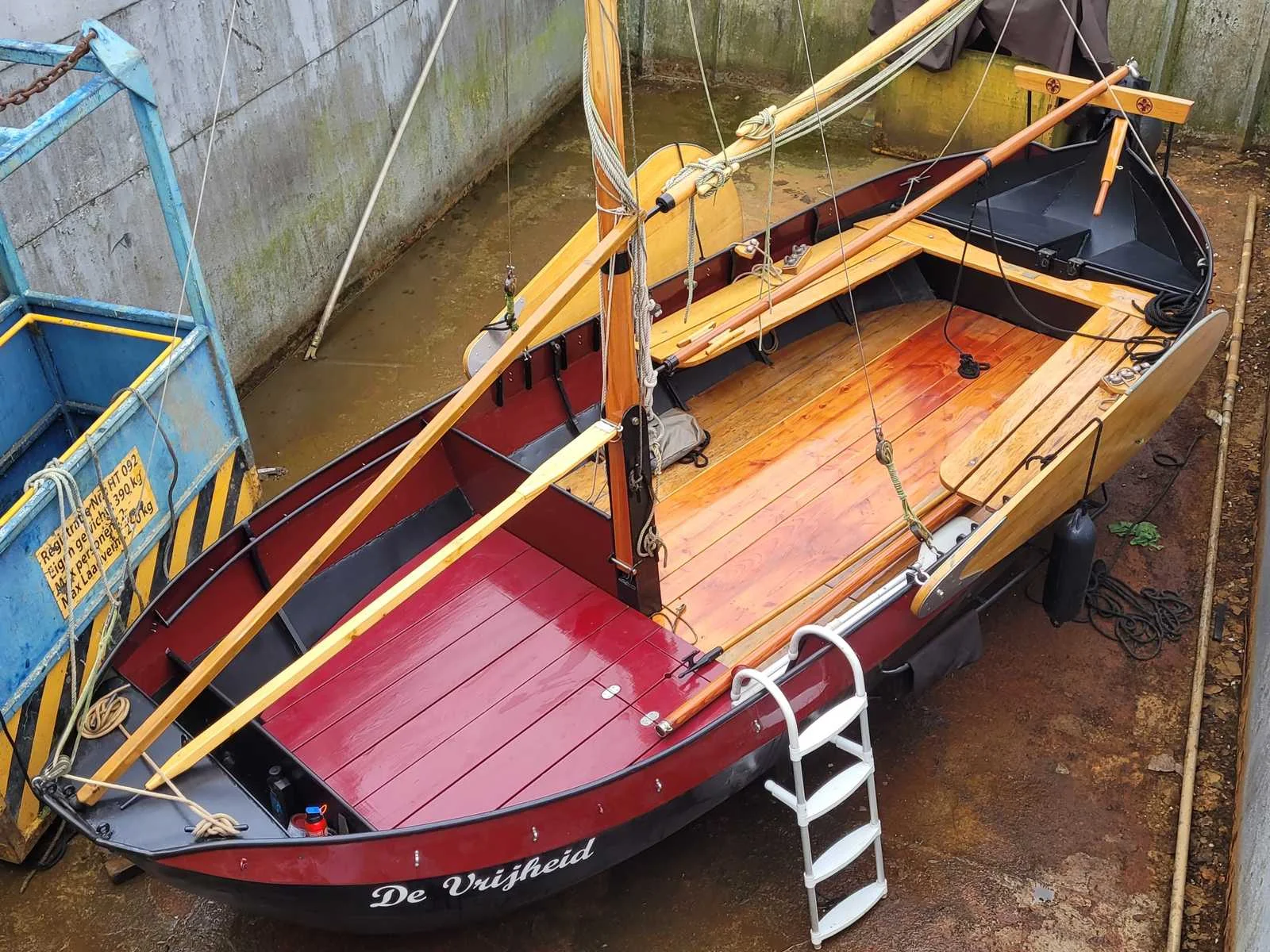 Lengte zonder roer 560 cm, voorzien van zeilen (origineel en lichtgewicht) , deelbare huif, gaffeltuig, droogtoilet, ongebruikte navigatie verlichting Breedte: 235cm Lengte: 620cm