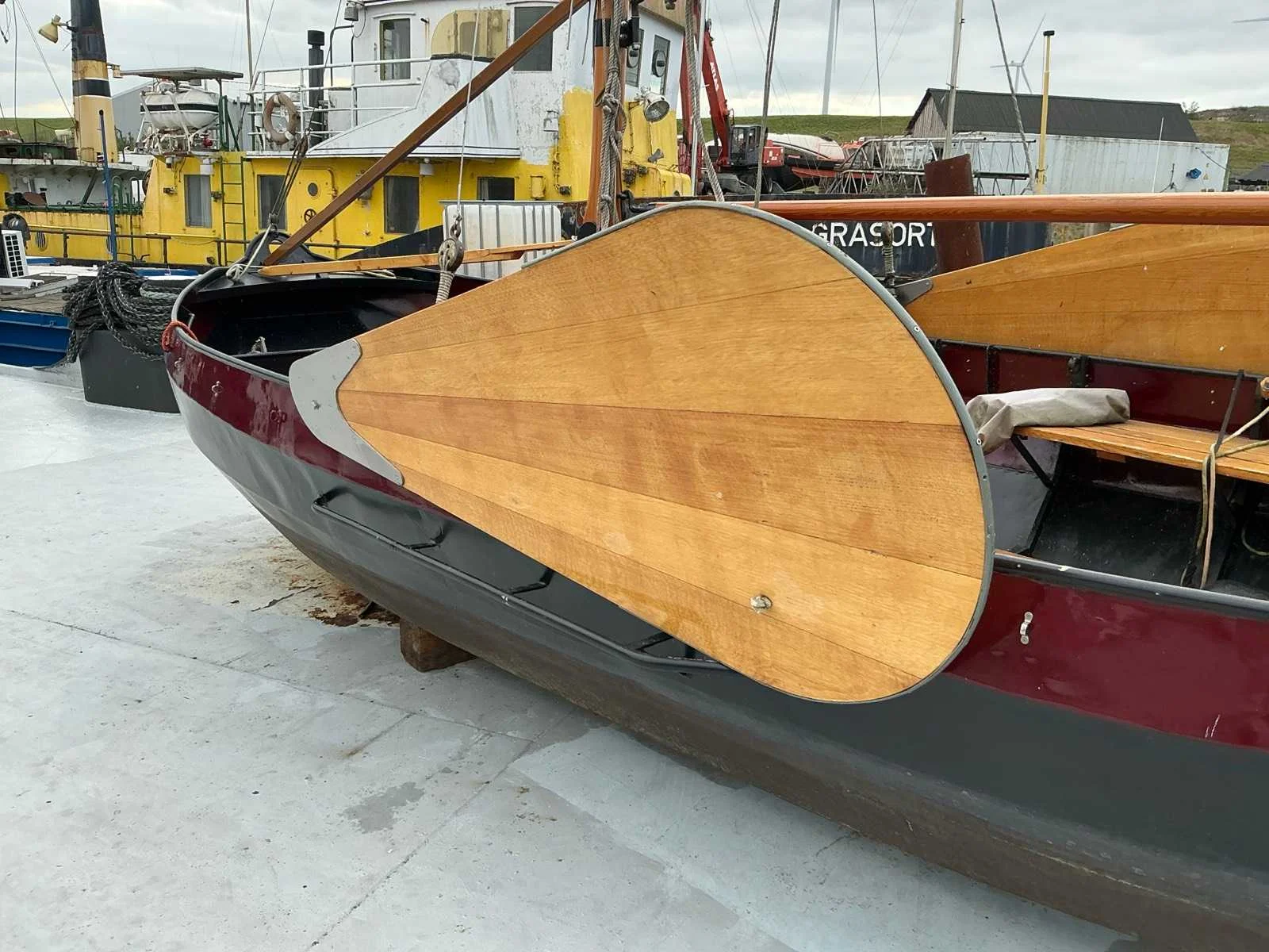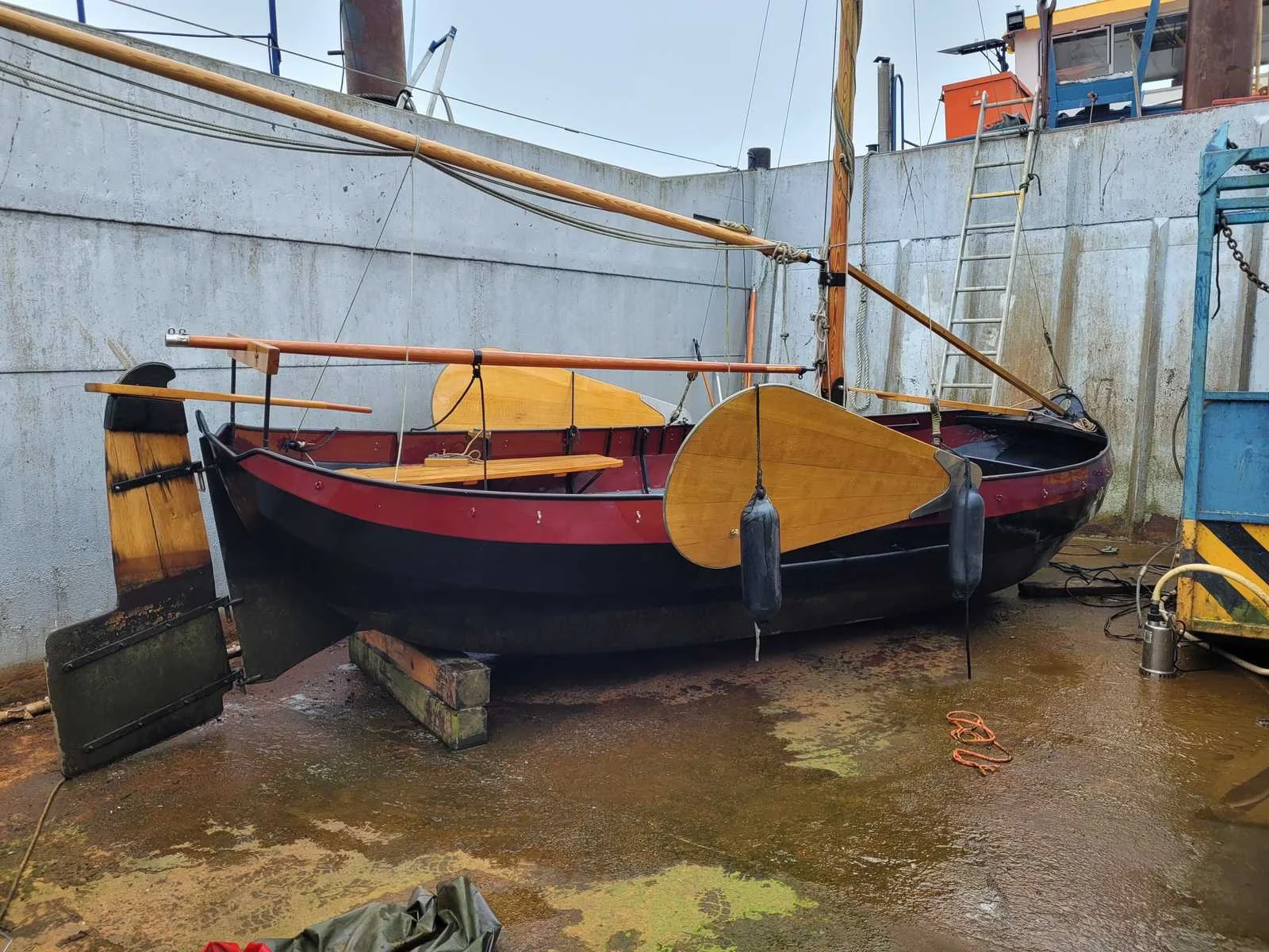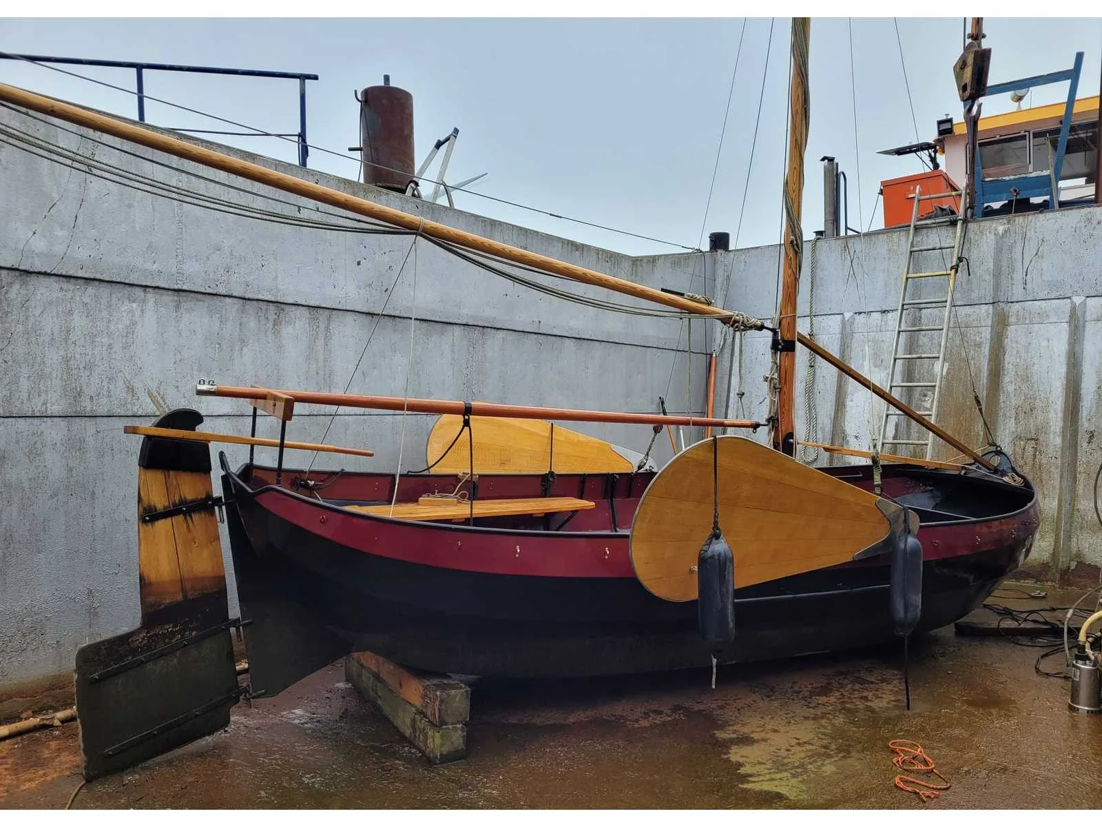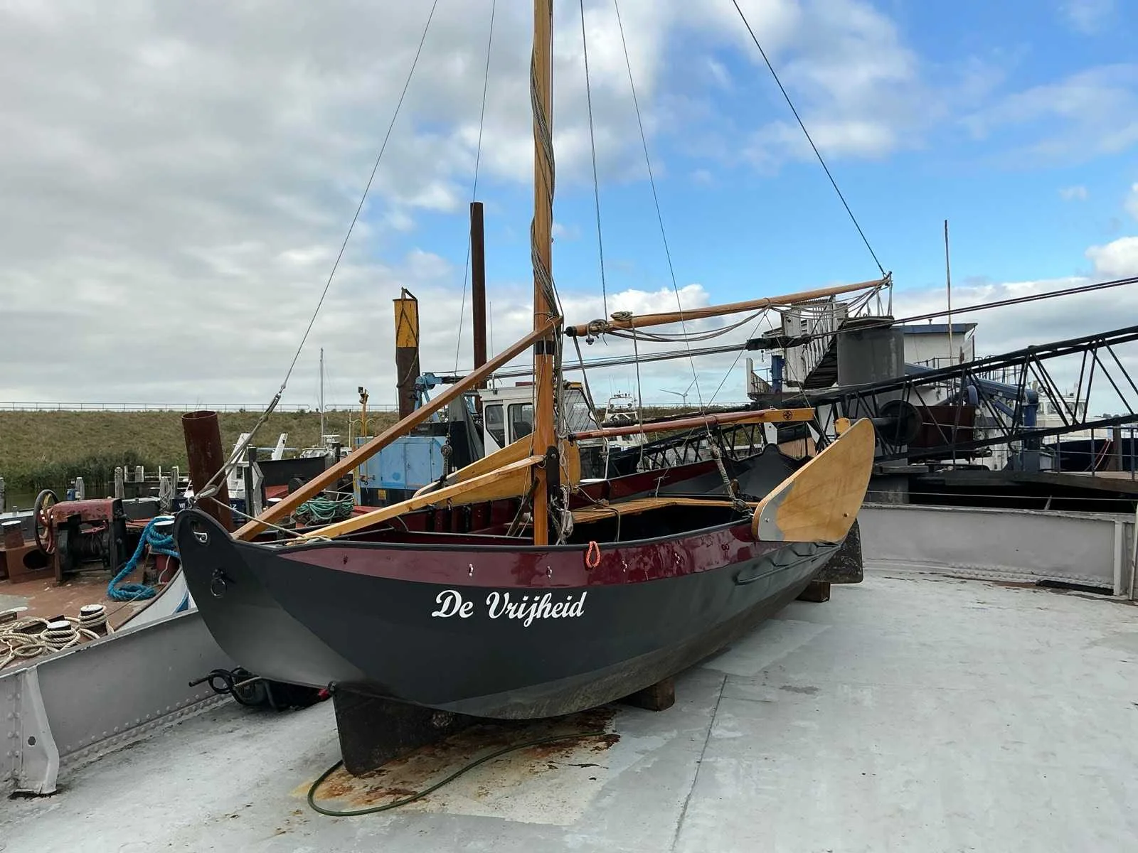 Lengte zonder roer 560 cm, voorzien van zeilen (origineel en lichtgewicht) , deelbare huif, gaffeltuig, droogtoilet, ongebruikte navigatie verlichting Breedte: 235cm Lengte: 620cm