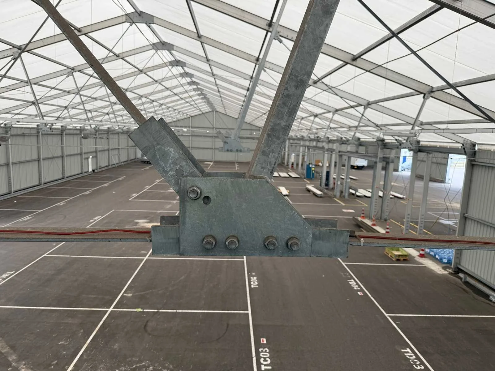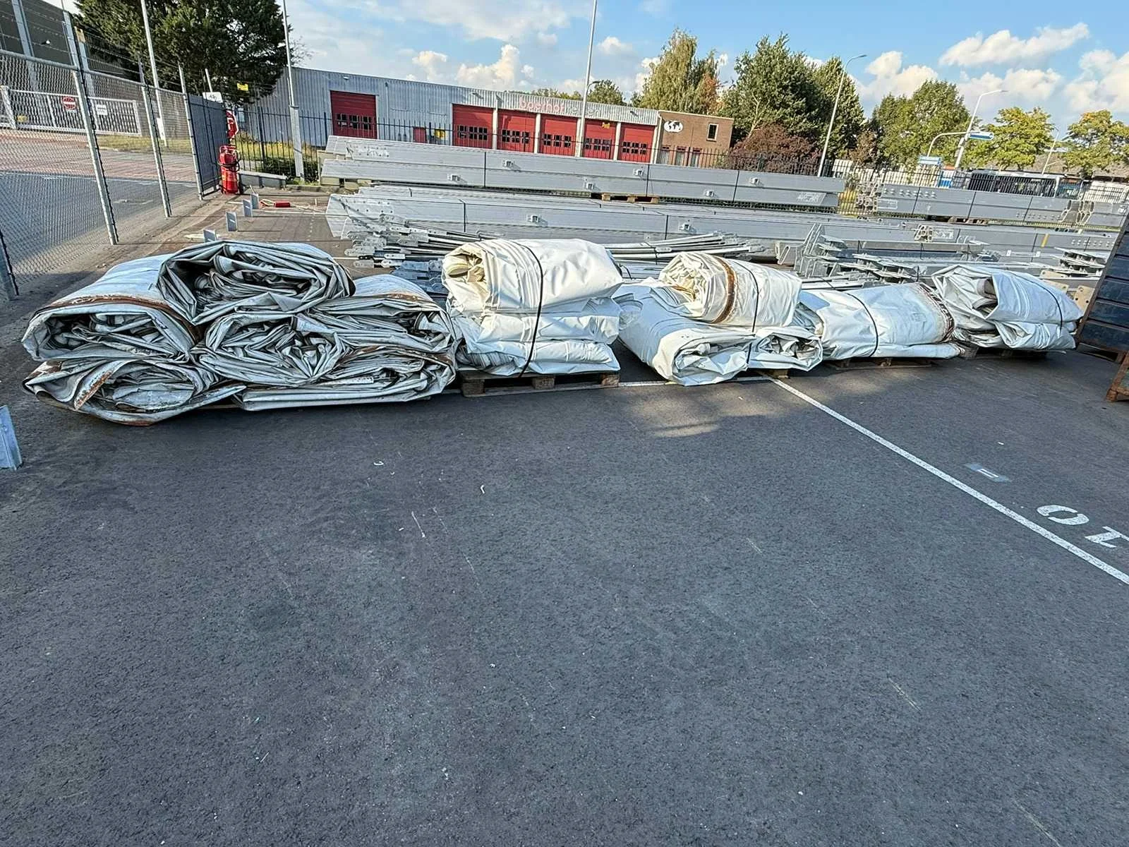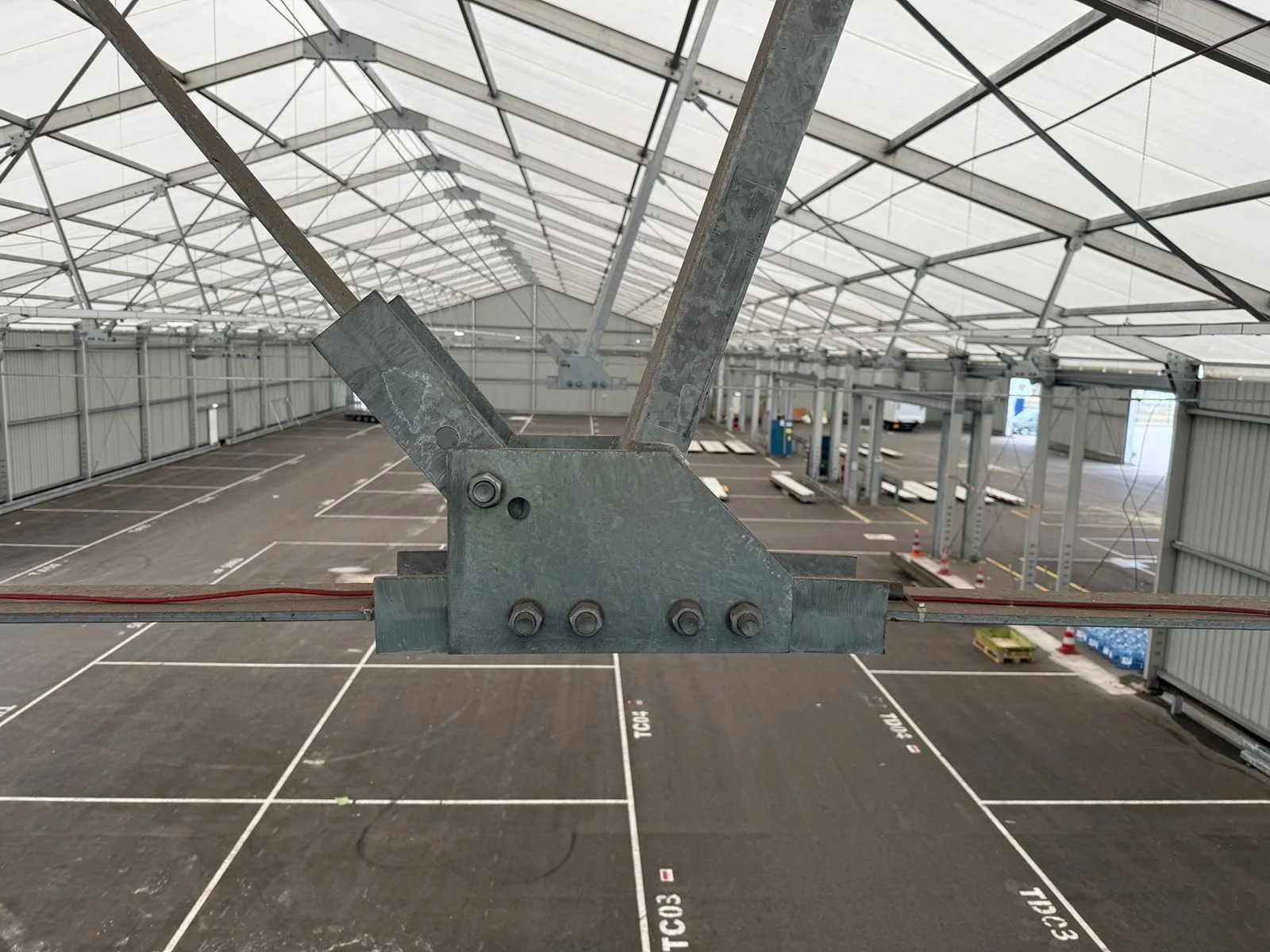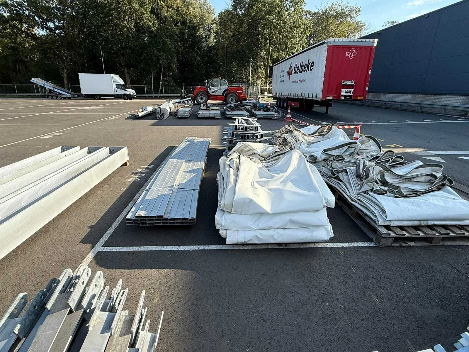 Alu hal/semi permanente hal van ca 2.466 m2. Hal is reeds gedemonteerd en gereed voor transport. Exclusief gevel beplating en deuren. Merk: Losberger De Boer Materiaal: alu Bouwjaar: 2017 Totaal oppervlakte: 2466m² Nok hoogte: 11320mm Goot hoogte: 6320mm Totale afmeting L: 80320mm Totale afmeting Breedte: 30710mm