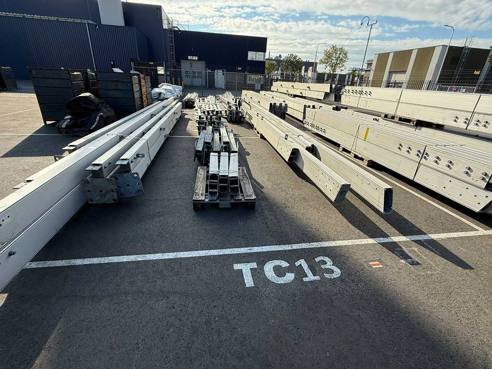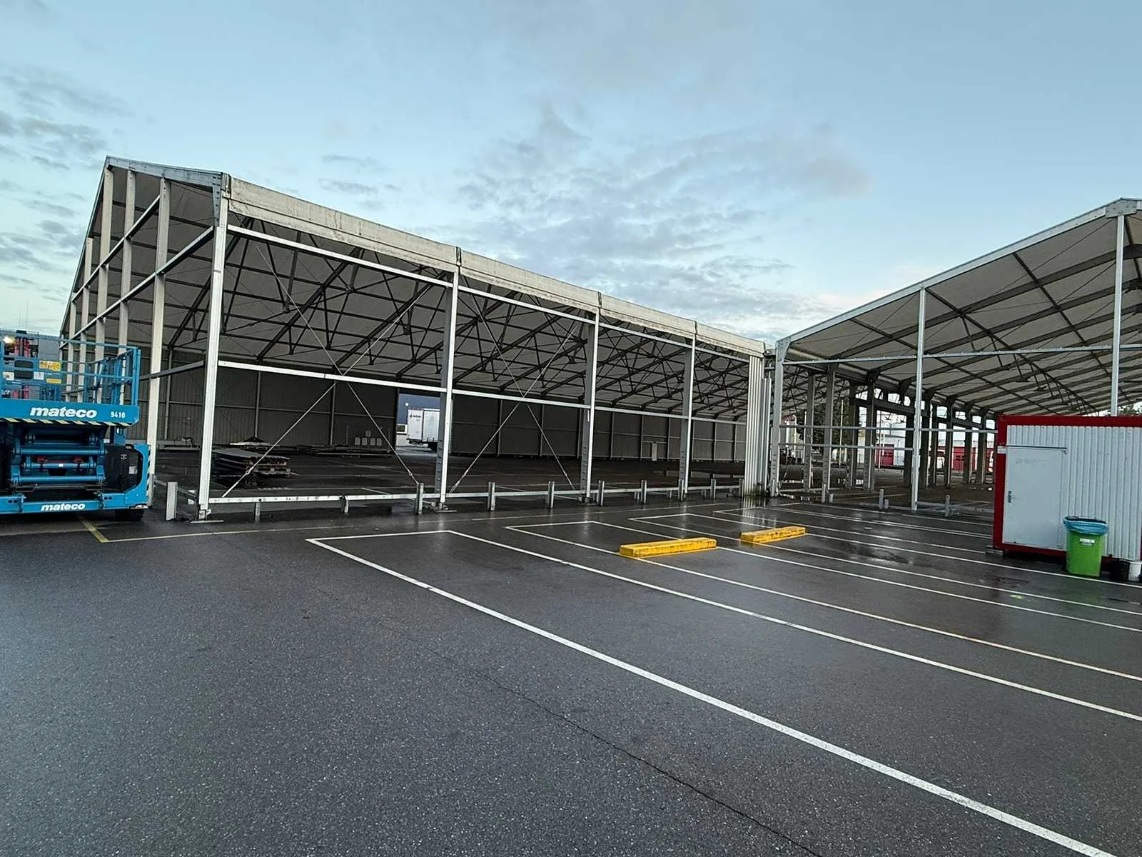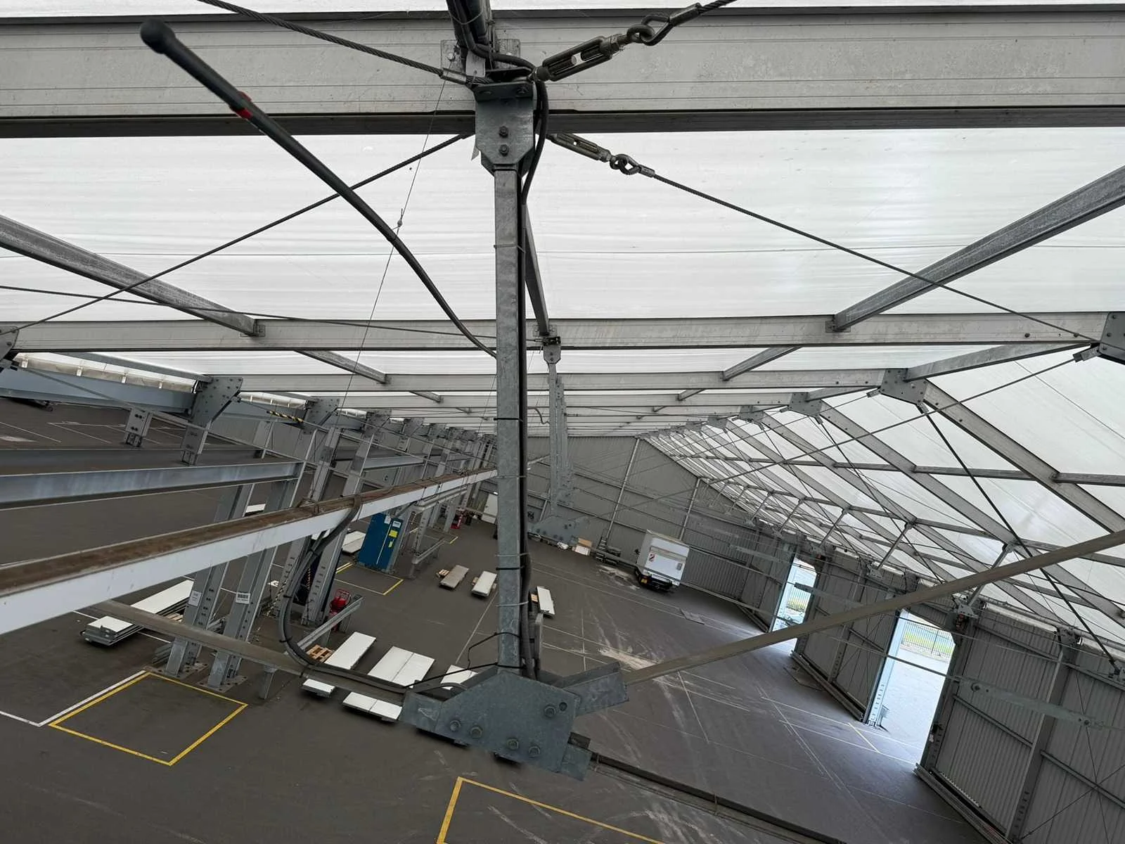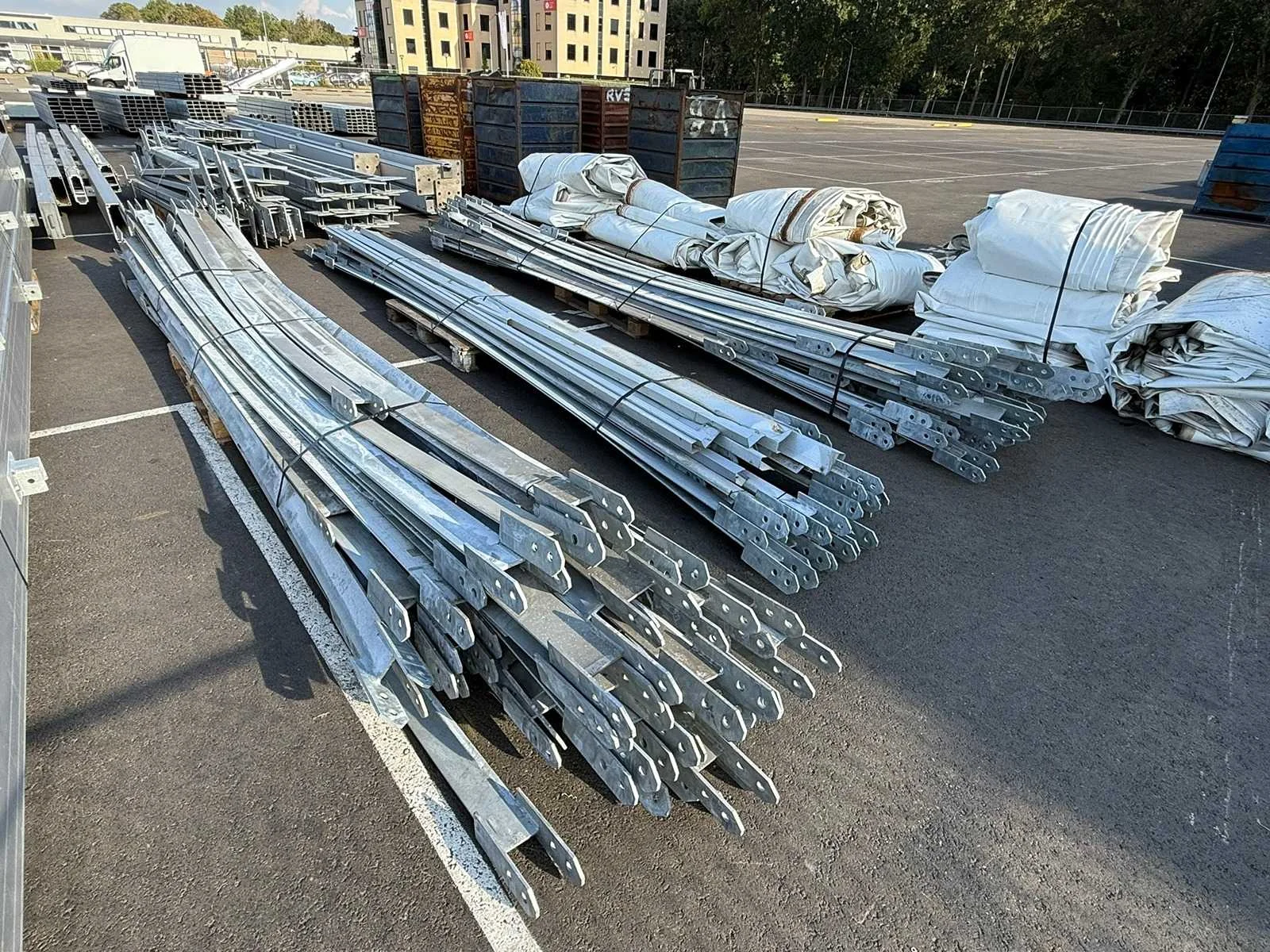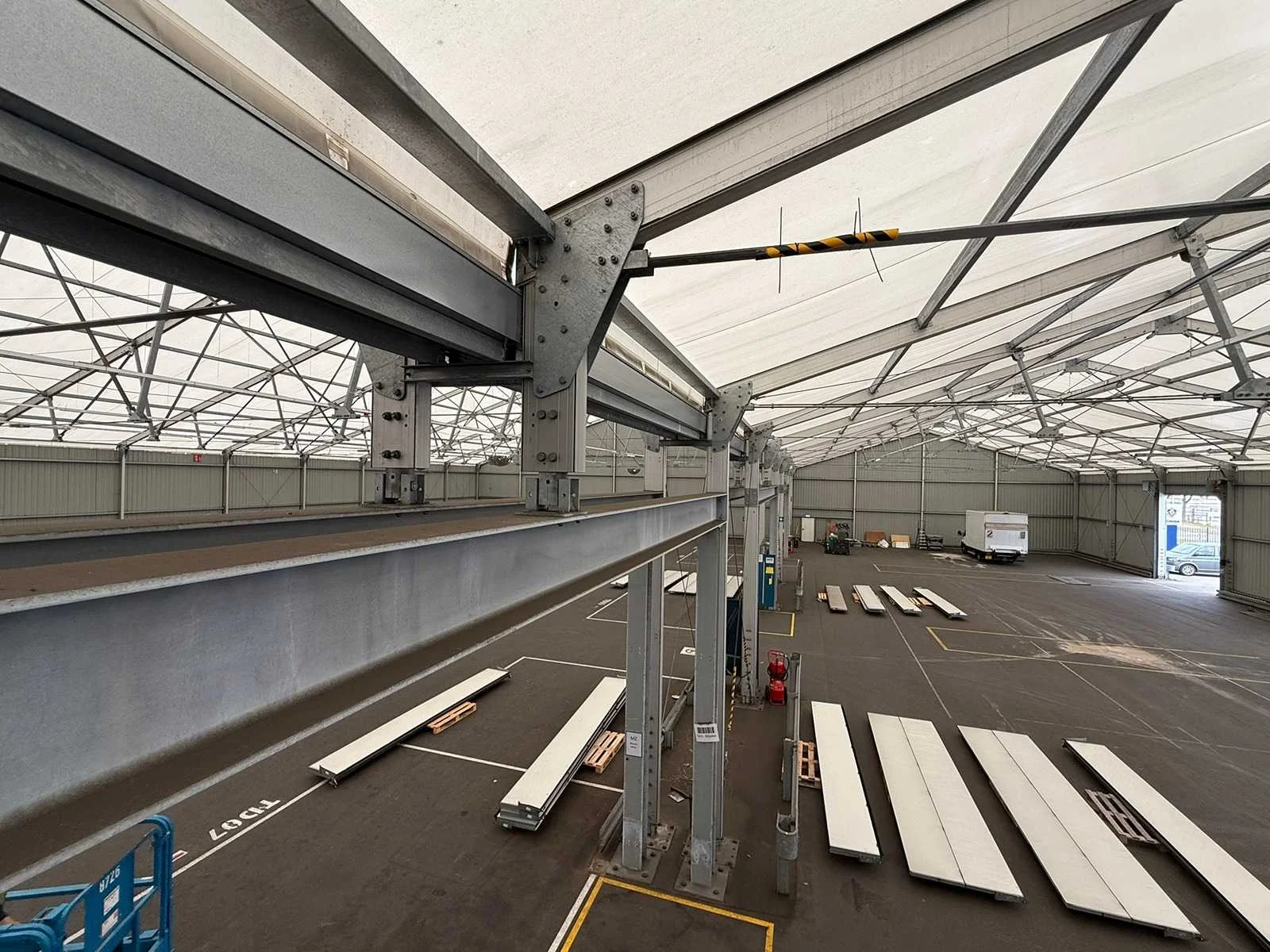 Alu hal/semi permanente hal van ca 2.466 m2. Hal is reeds gedemonteerd en gereed voor transport. Exclusief gevel beplating en deuren. Merk: Losberger De Boer Materiaal: alu Bouwjaar: 2017 Totaal oppervlakte: 2466m² Nok hoogte: 11320mm Goot hoogte: 6320mm Totale afmeting L: 80320mm Totale afmeting Breedte: 30710mm