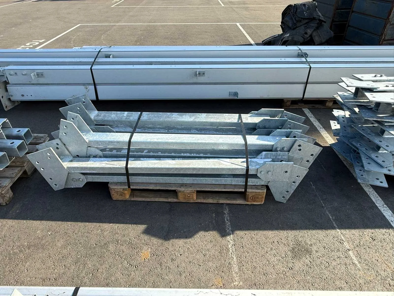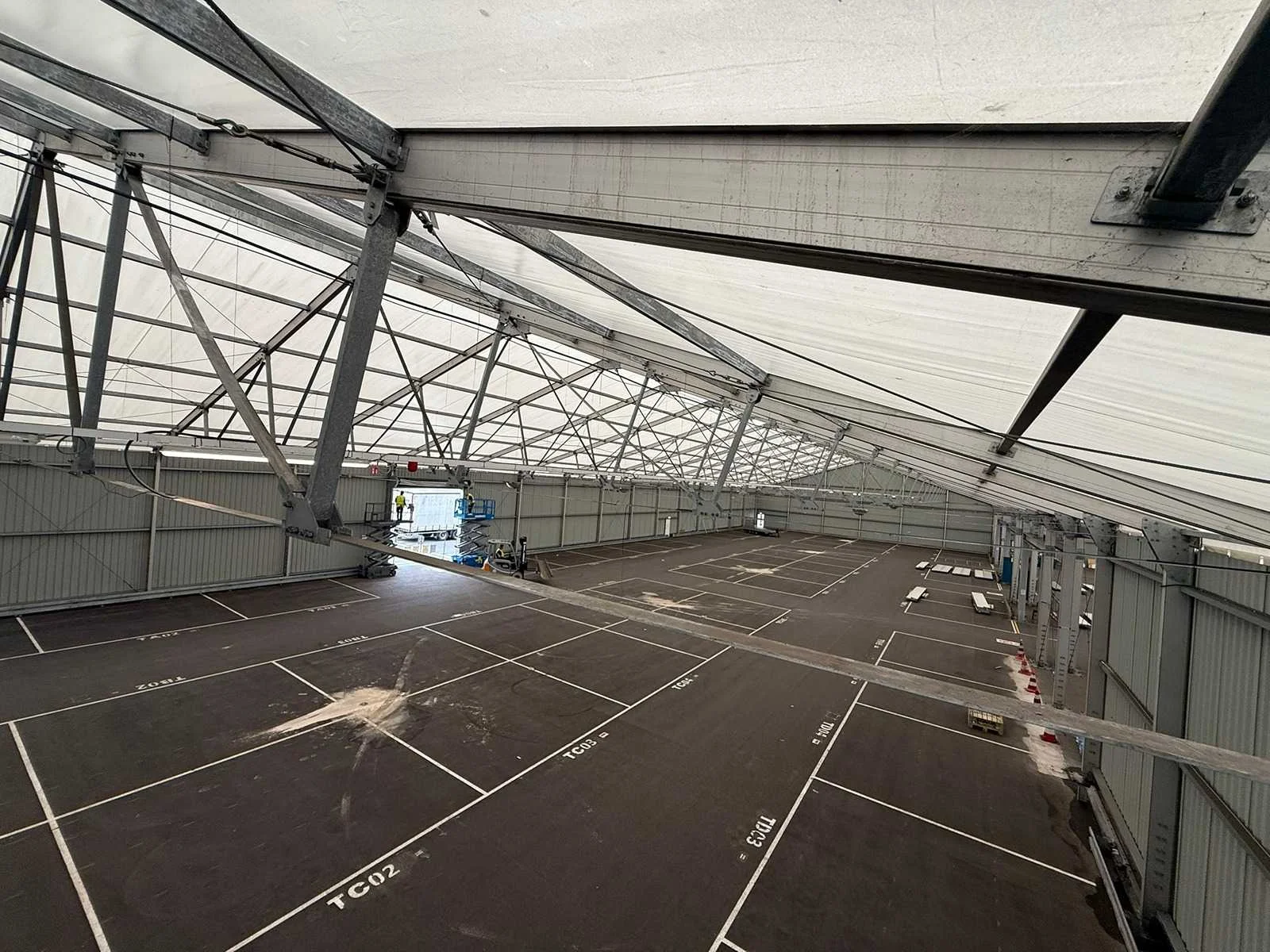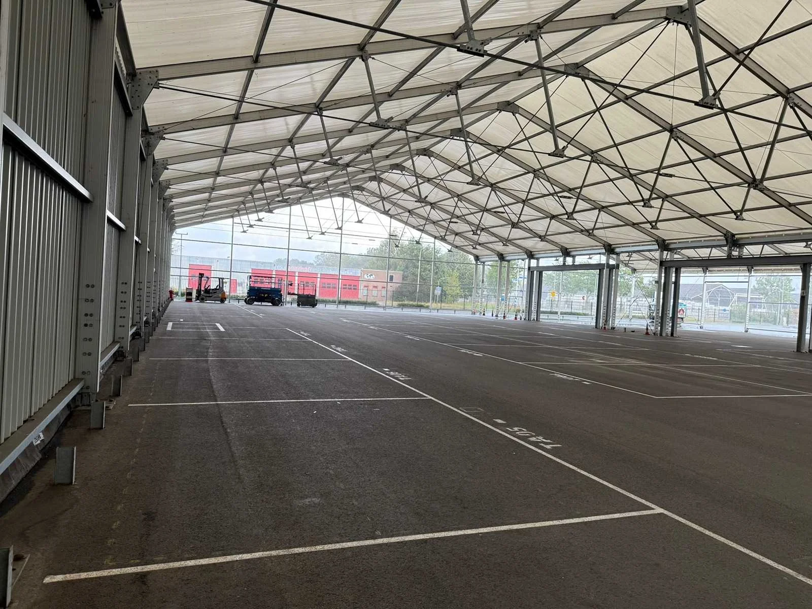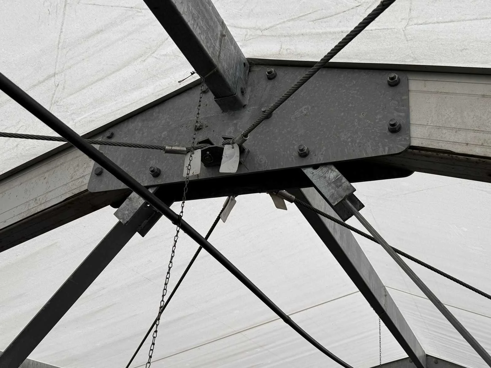 Alu hal/semi permanente hal van ca 2.466 m2. Hal is reeds gedemonteerd en gereed voor transport. Exclusief gevel beplating en deuren. Merk: Losberger De Boer Materiaal: alu Bouwjaar: 2017 Totaal oppervlakte: 2466m² Nok hoogte: 11320mm Goot hoogte: 6320mm Totale afmeting L: 80320mm Totale afmeting Breedte: 30710mm