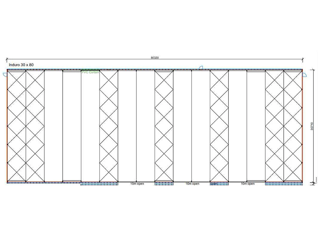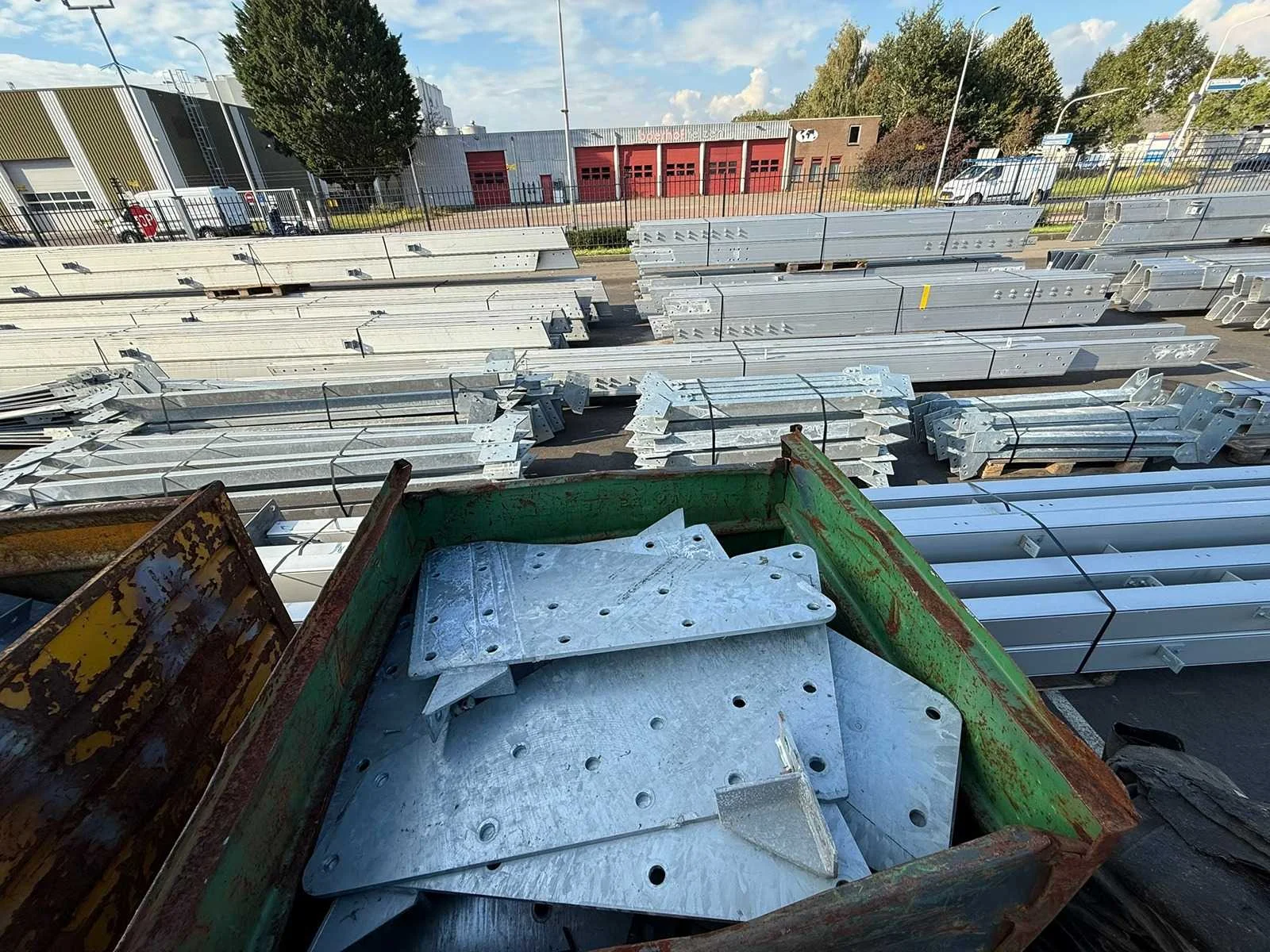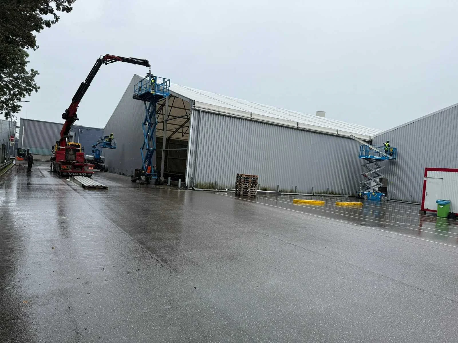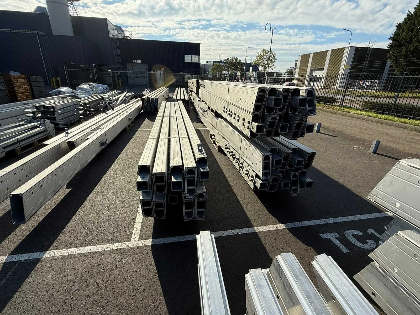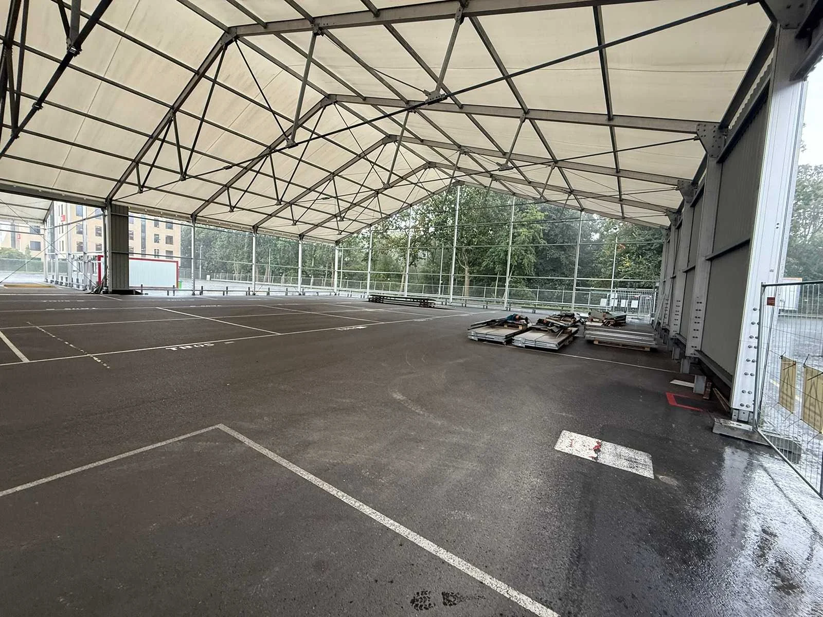 Alu hal/semi permanente hal van ca 2.466 m2. Hal is reeds gedemonteerd en gereed voor transport. Exclusief gevel beplating en deuren. Merk: Losberger De Boer Materiaal: alu Bouwjaar: 2017 Totaal oppervlakte: 2466m² Nok hoogte: 11320mm Goot hoogte: 6320mm Totale afmeting L: 80320mm Totale afmeting Breedte: 30710mm