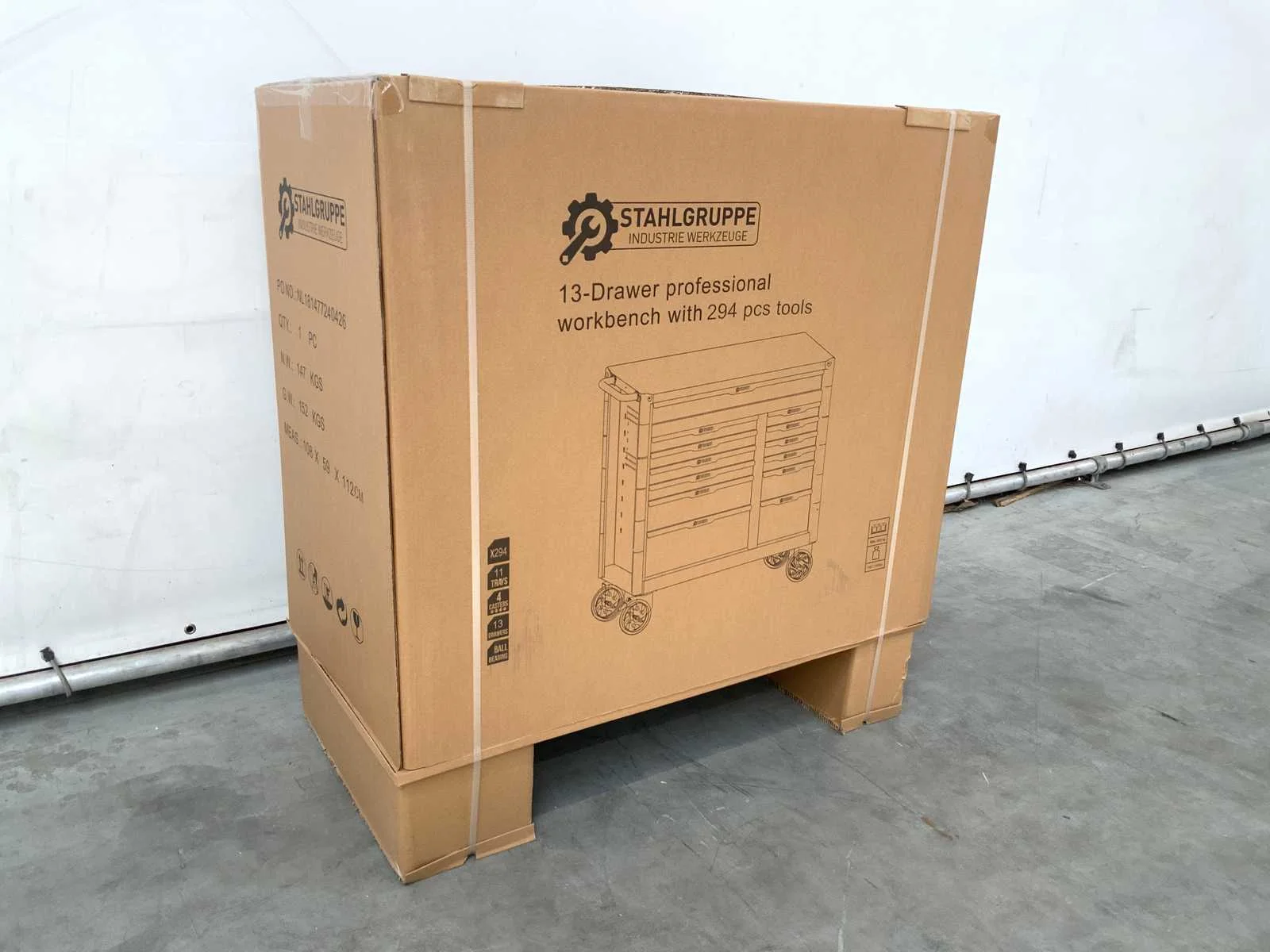 Houten werkblad; verrijdbaar; remmen; 2 delen afsluitbaar; Ongebruikt in doos; 7484 Merk: Stahlgruppe Model: SG24 Type: 294delig Lengte: 106cm Breedte: 57cm Hoogte: 110cm