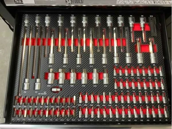 V.v. gereedschap 274-delig; 4 wielen waarvan 2 met rem; stuurgroep; werkblad; 7lades; 1 afsluitbare kast met legbord; 2 sleutel sets; ongebruikt in doos; 2419; Merk: SG Tools Aantal laden: 7 Met inhoud: true Totale afmeting L: 1130mm Totale afmeting Breedte: 460mm Totale afmeting Hoogte: 990mm