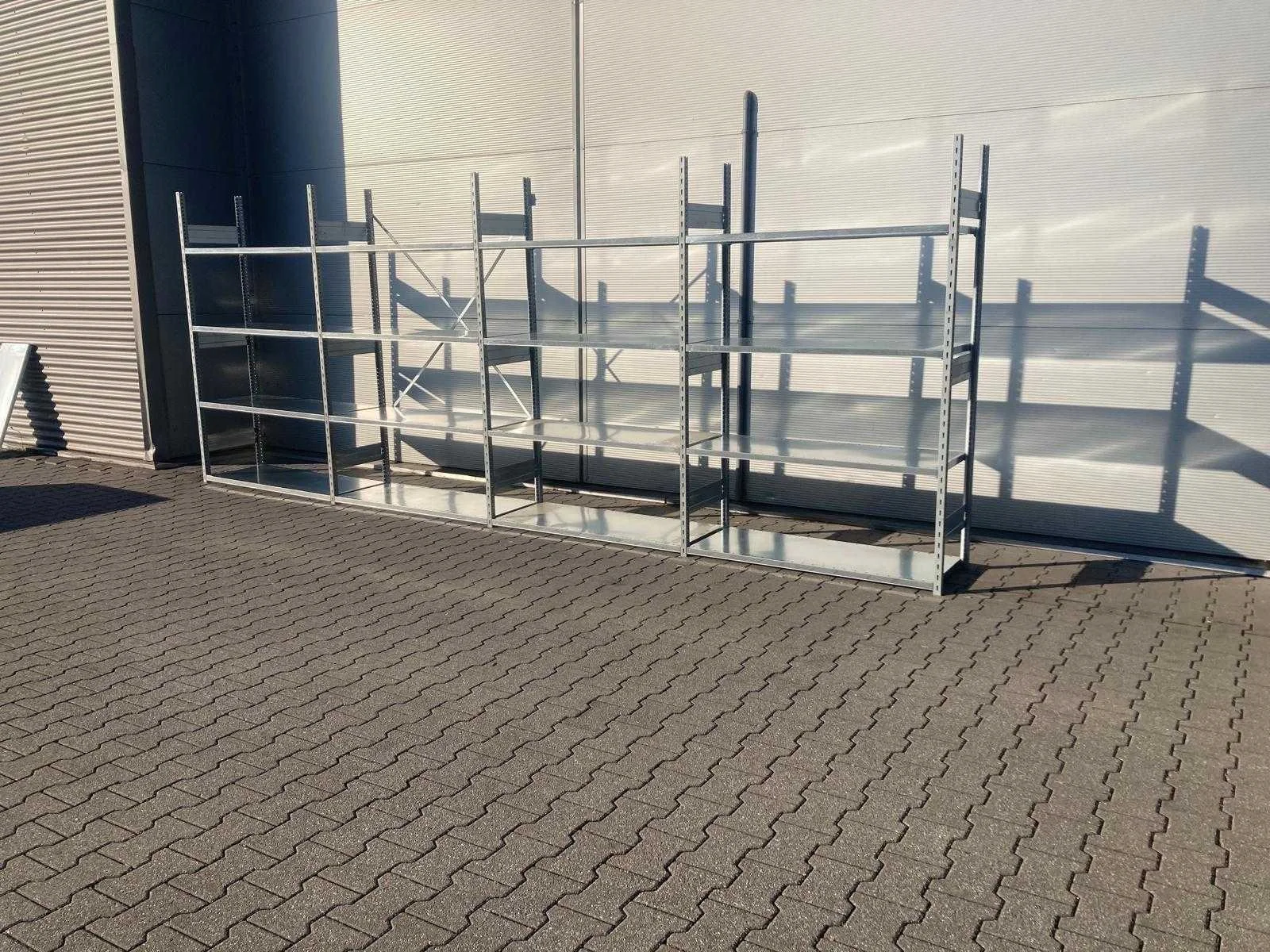 Ongebruikte Stow legbordstelling; wordt netjes gebundeld en transport klaar geleverd; zonder schoorset; Merk: Stow Type: ongebruikt Aantal secties: 4 Sectie afm. b: 965mm Sectie diepte: 400mm Sectie afm. h: 2000mm Aantal staanders: 5 Aantal legborden: 25