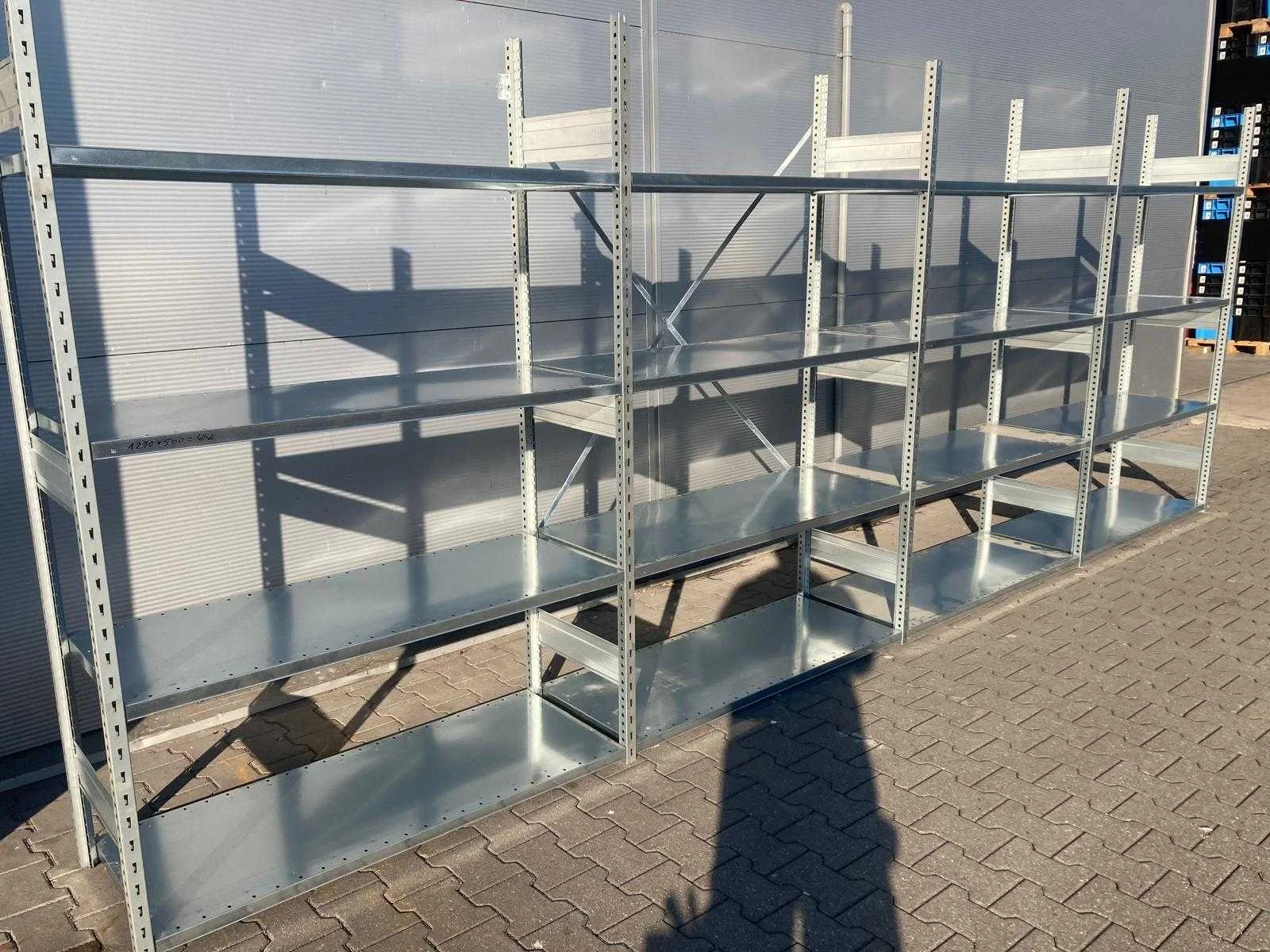 Ongebruikte Stow legbordstelling; wordt netjes gebundeld en transport klaar geleverd; zonder schoorset; Merk: Stow Type: ongebruikt Aantal secties: 4 Sectie afm. b: 965mm Sectie diepte: 500mm Sectie afm. h: 2000mm Aantal staanders: 5 Aantal legborden: 25