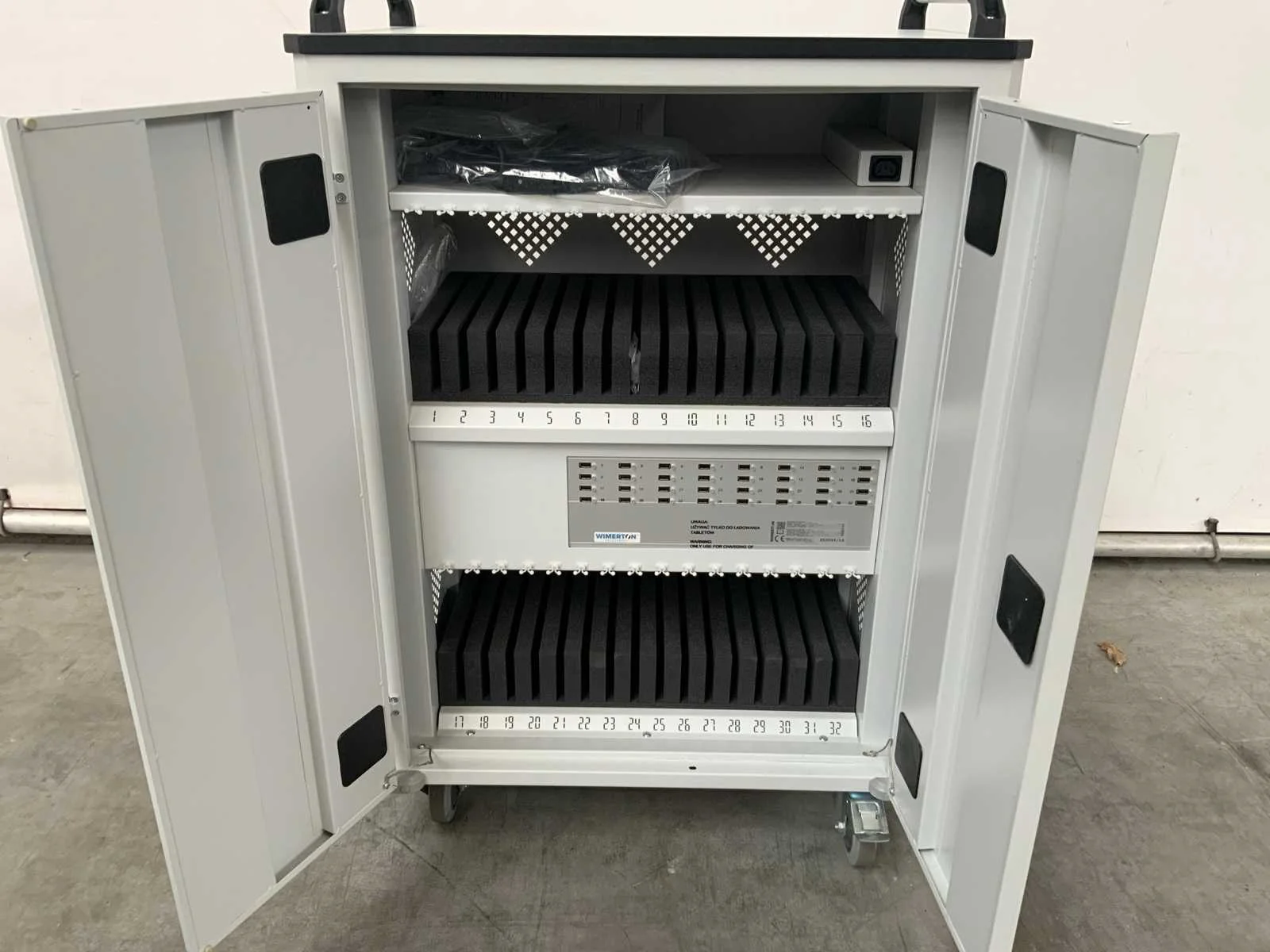 Opberg/oplaadstation voor tablets en laptops, Voorzien van zwenkwielen, 230v aansluiting, 32 vakken, betreft een ongebruikt product