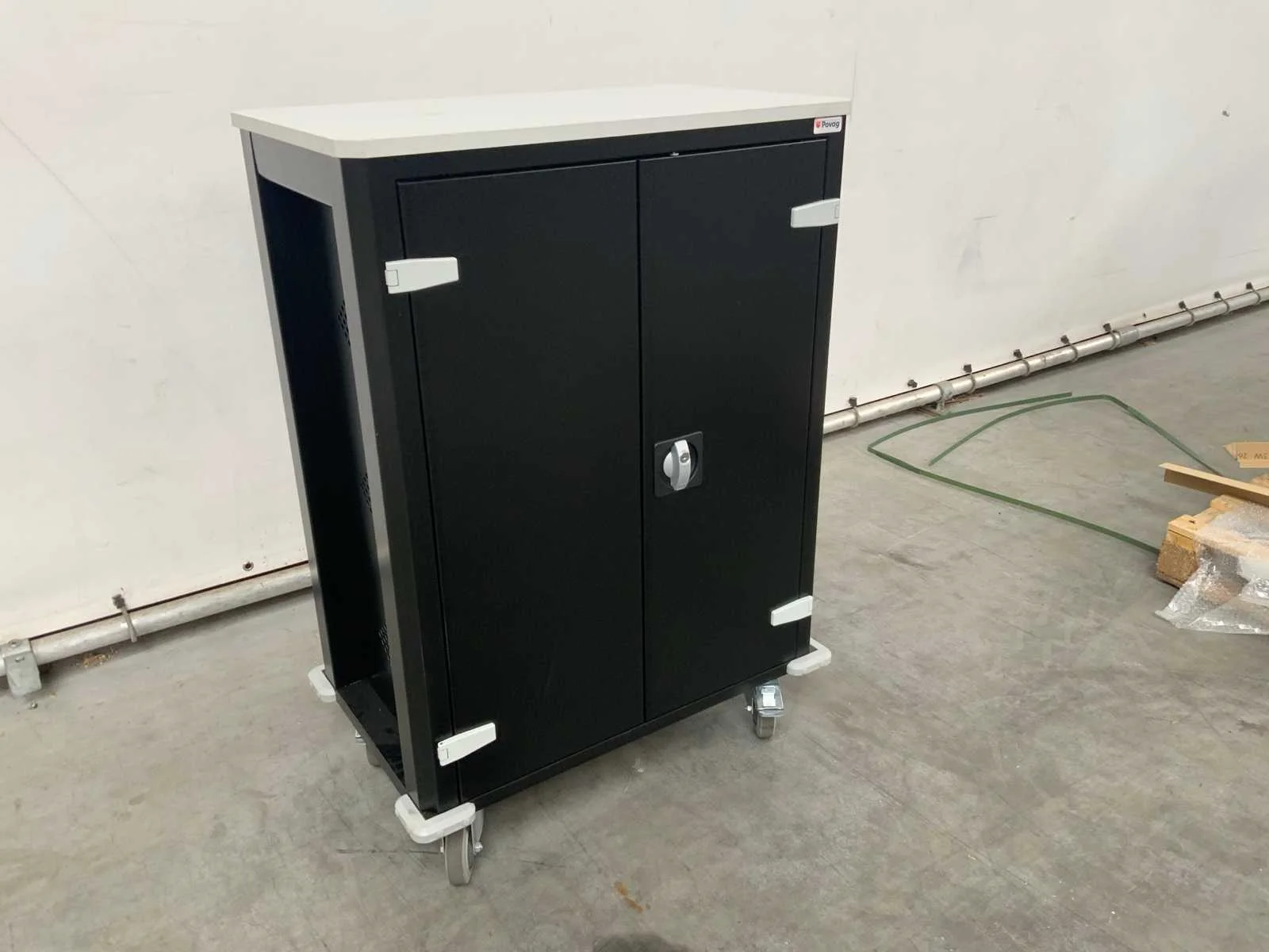 Opberg/oplaadstation voor tablets en laptops, Voorzien van zwenkwielen, 230v aansluiting, 32 vakken, betreft een ongebruikt product Merk: Povag