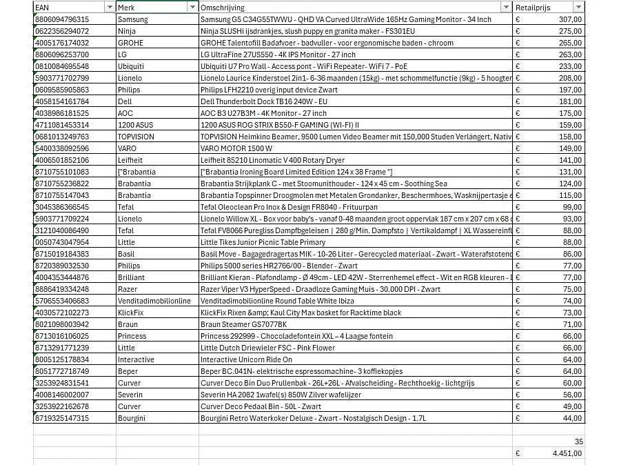 Dit betreft een partij A-merk retourgoederen van een grote online retailer. De partij bestaat uit diverse productcategorieën. Aantal stuks: 35. Retailwaarde: €4451,- Ongecontroleerd: werking onbekend (mix van werkend, incompleet, beschadigd, te gebruiken voor onderdelen). Kom op de kijkdag om te om zo een goed beeld te krijgen van de reden van retour. Zie foto's voor lijst met inhoud. Bezorgtermijn 14 dagen Merk: Pallet Retourgoederen