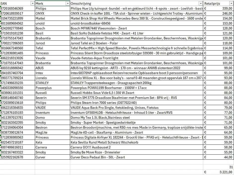 Dit betreft een partij A-merk retourgoederen van een grote online retailer. De partij bestaat uit diverse productcategorieën. Aantal stuks: 31. Retailwaarde: €3221,- Ongecontroleerd: werking onbekend (mix van werkend, incompleet, beschadigd, te gebruiken voor onderdelen). Kom op de kijkdag om te om zo een goed beeld te krijgen van de reden van retour. Zie foto's voor lijst met inhoud. Bezorgtermijn 14 dagen Merk: Pallet Retourgoederen