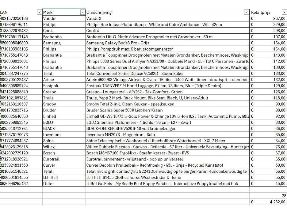 Dit betreft een partij A-merk retourgoederen van een grote online retailer. De partij bestaat uit diverse productcategorieën. Aantal stuks: 28. Retailwaarde: €4232,- Ongecontroleerd: werking onbekend (mix van werkend, incompleet, beschadigd, te gebruiken voor onderdelen). Kom op de kijkdag om te om zo een goed beeld te krijgen van de reden van retour. Zie foto's voor lijst met inhoud. Bezorgtermijn 14 dagen Merk: Pallet Retourgoederen