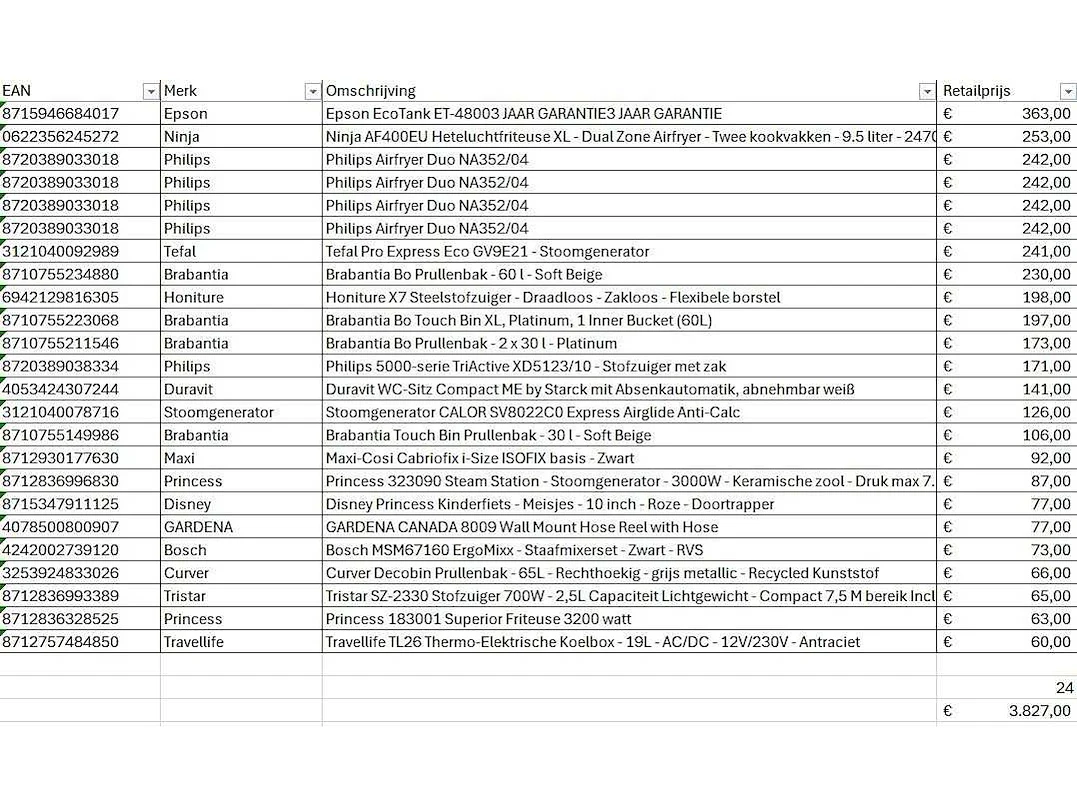 Dit betreft een partij A-merk retourgoederen van een grote online retailer. De partij bestaat uit diverse productcategorieën. Aantal stuks: 24. Retailwaarde: €3827,- Ongecontroleerd: werking onbekend (mix van werkend, incompleet, beschadigd, te gebruiken voor onderdelen). Kom op de kijkdag om te om zo een goed beeld te krijgen van de reden van retour. Zie foto's voor lijst met inhoud. Bezorgtermijn 14 dagen Merk: Pallet Retourgoederen