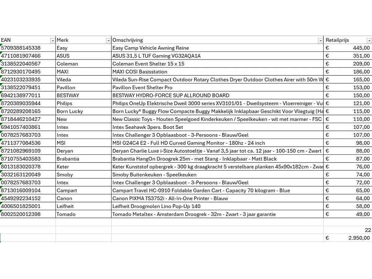 Dit betreft een partij A-merk retourgoederen van een grote online retailer. De partij bestaat uit diverse productcategorieën. Aantal stuks: 22. Retailwaarde: €2950,- Ongecontroleerd: werking onbekend (mix van werkend, incompleet, beschadigd, te gebruiken voor onderdelen). Kom op de kijkdag om te om zo een goed beeld te krijgen van de reden van retour. Zie foto's voor lijst met inhoud. Bezorgtermijn 14 dagen Merk: Pallet Retourgoederen