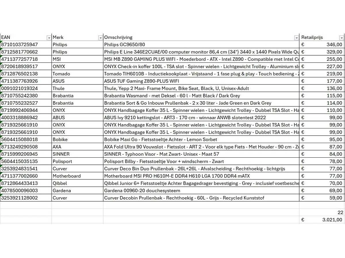 Dit betreft een partij A-merk retourgoederen van een grote online retailer. De partij bestaat uit diverse productcategorieën. Aantal stuks: 22. Retailwaarde: €3021,- Ongecontroleerd: werking onbekend (mix van werkend, incompleet, beschadigd, te gebruiken voor onderdelen). Kom op de kijkdag om te om zo een goed beeld te krijgen van de reden van retour. Zie foto's voor lijst met inhoud. Bezorgtermijn 14 dagen Merk: Pallet Retourgoederen