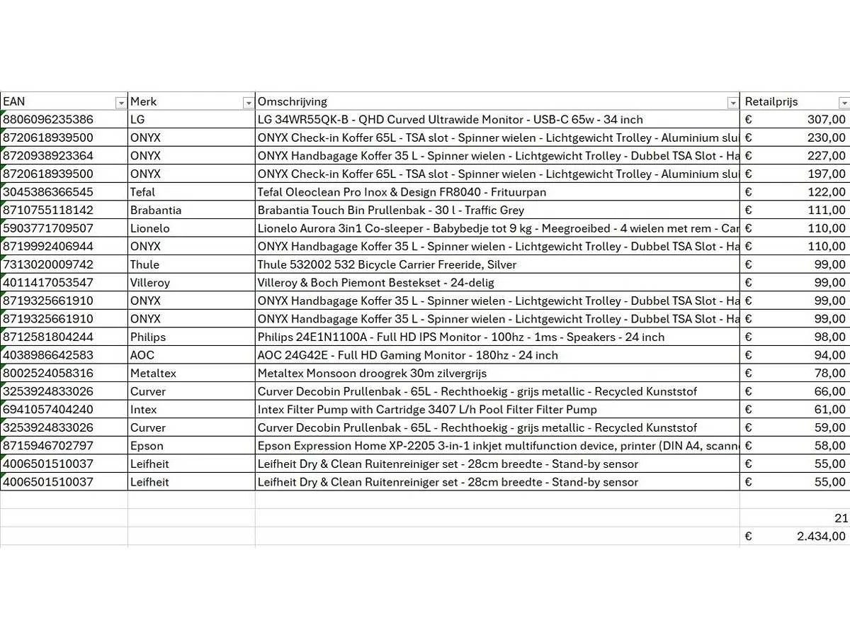 Dit betreft een partij A-merk retourgoederen van een grote online retailer. De partij bestaat uit diverse productcategorieën. Aantal stuks: 21. Retailwaarde: €2434,- Ongecontroleerd: werking onbekend (mix van werkend, incompleet, beschadigd, te gebruiken voor onderdelen). Kom op de kijkdag om te om zo een goed beeld te krijgen van de reden van retour. Zie foto's voor lijst met inhoud. Bezorgtermijn 14 dagen Merk: Pallet Retourgoederen